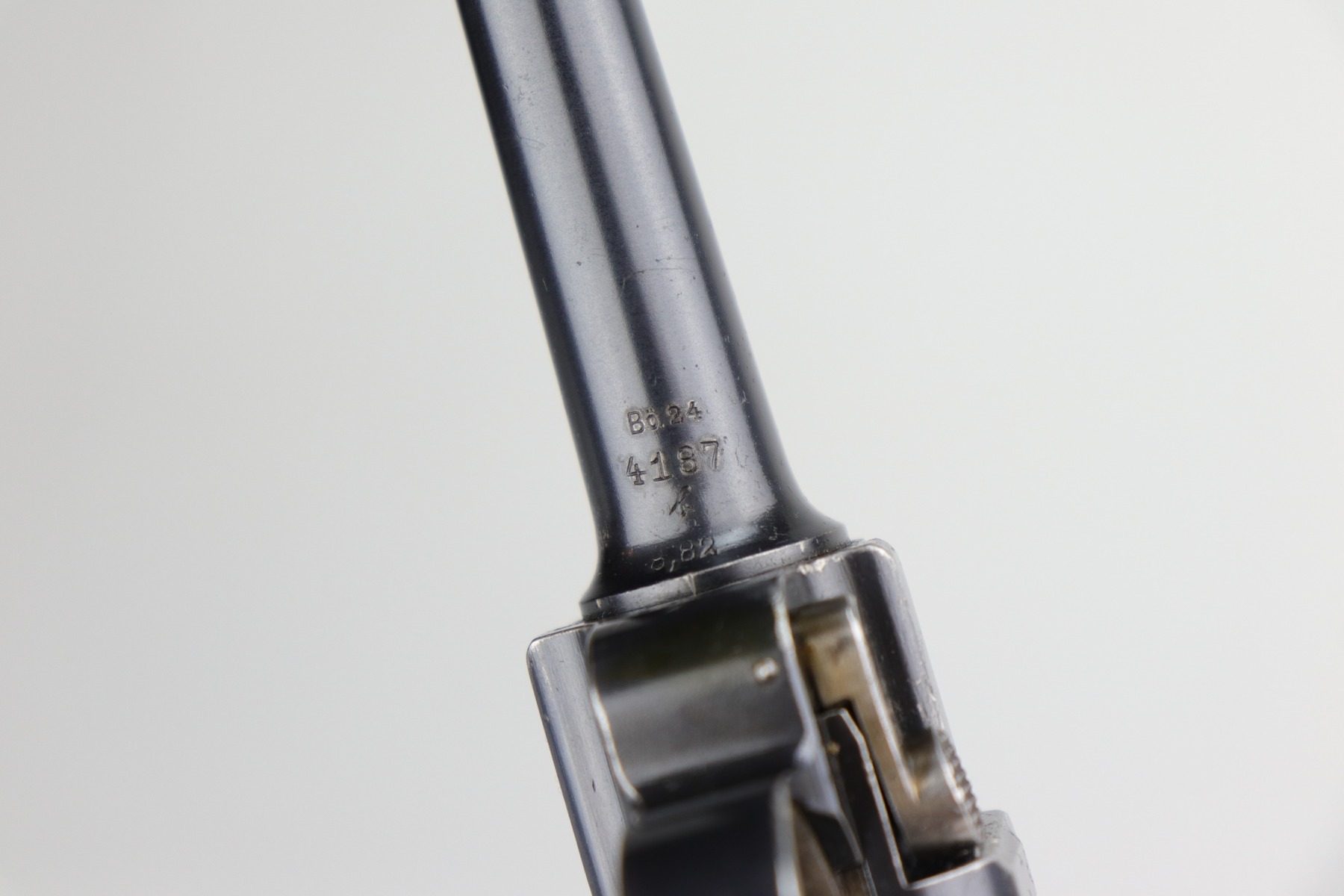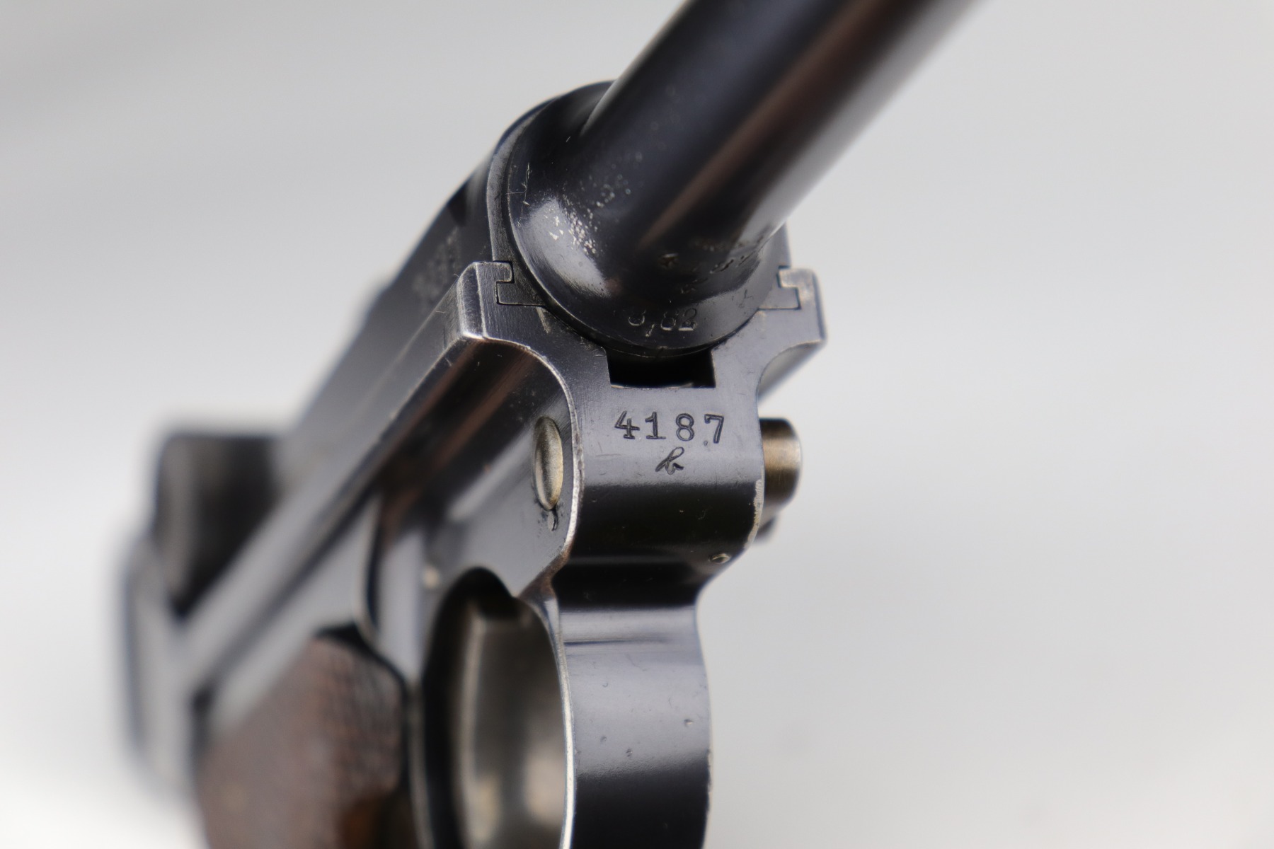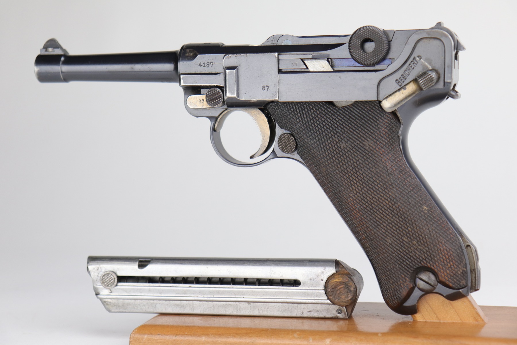 10/30/20 – This is an exceptional example of a WW1 DWM Luger with a rare and desirable 1913 chamber date. It is all matching and has the proper German Imperial military proofs. It has retained about 97% of its original bluing. There is very minor wear around the muzzle, on the side plate, and on the front edges of the frame. There are areas of pin-pricking throughout, most noticeable on the straps. It comes with excellent matching grips – just a chip at the top of the left panel. Also comes with a blank-bottom WW1-era magazine. The bore is excellent – shiny with strong rifling.
