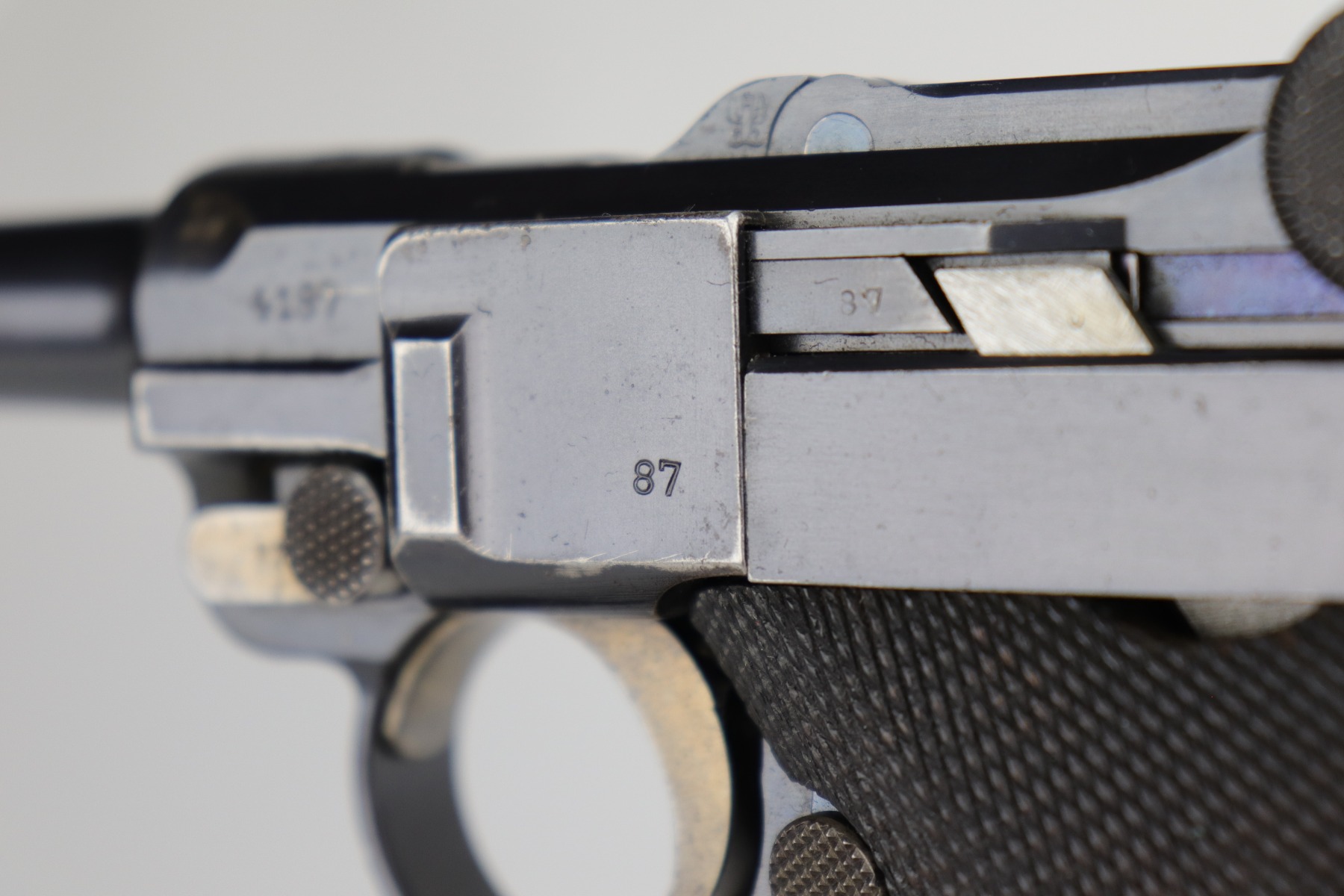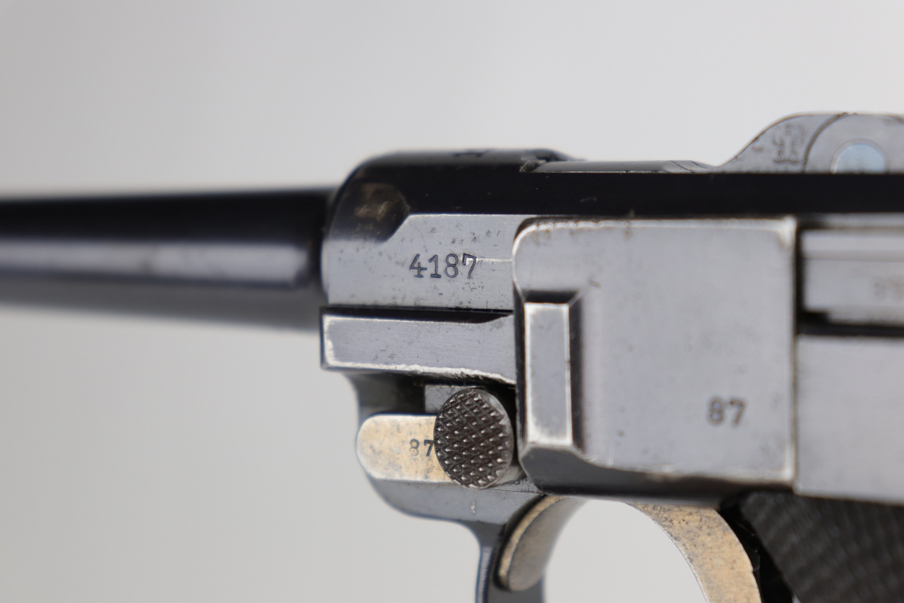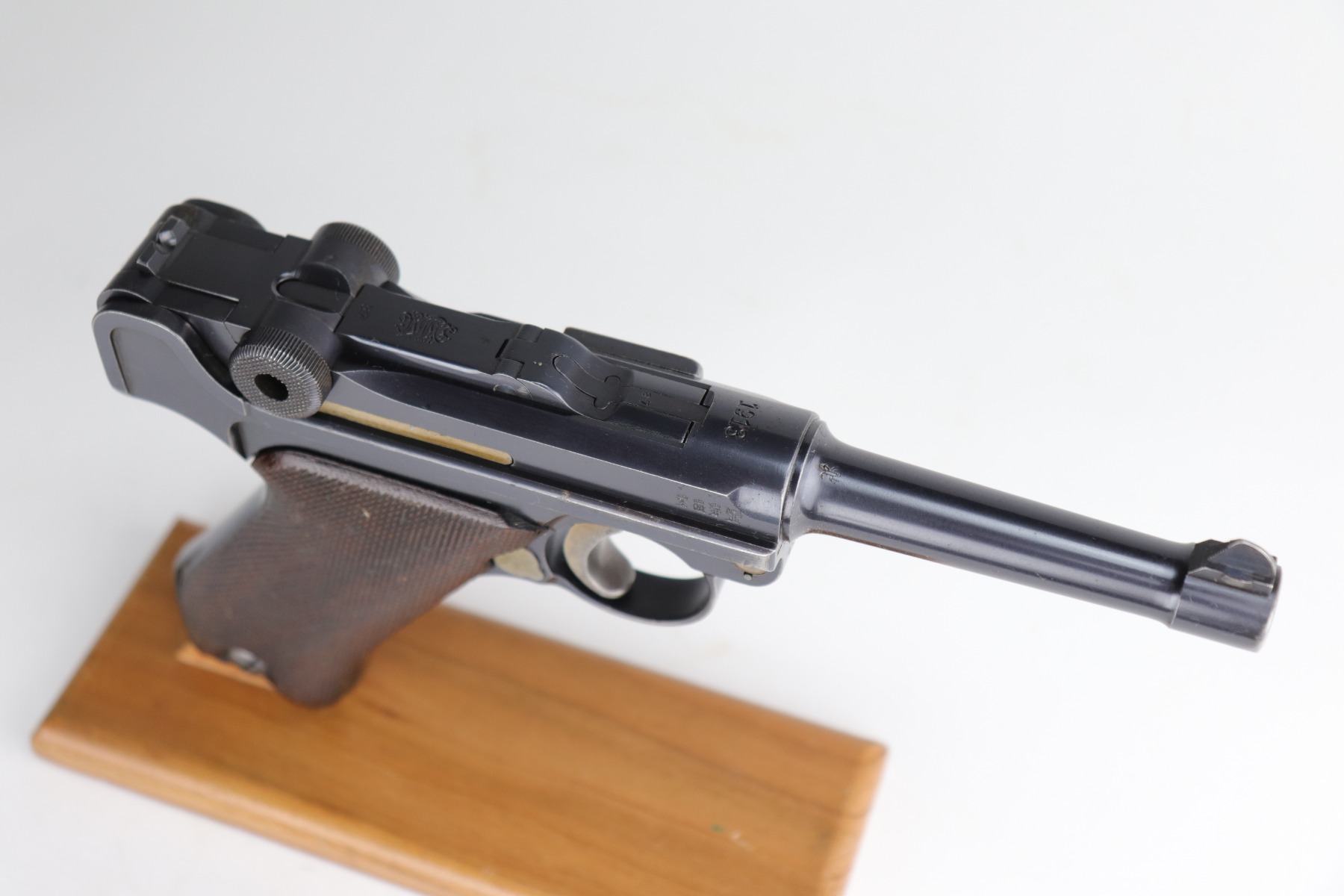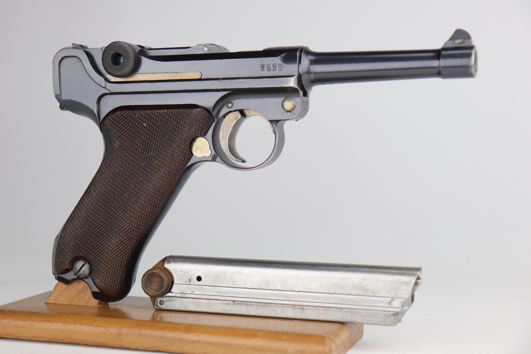 10/30/20 – This is an exceptional example of a WW1 DWM Luger with a rare and desirable 1913 chamber date. It is all matching and has the proper German Imperial military proofs. It has retained about 97% of its original bluing. There is very minor wear around the muzzle, on the side plate, and on the front edges of the frame. There are areas of pin-pricking throughout, most noticeable on the straps. It comes with excellent matching grips – just a chip at the top of the left panel. Also comes with a blank-bottom WW1-era magazine. The bore is excellent – shiny with strong rifling.
