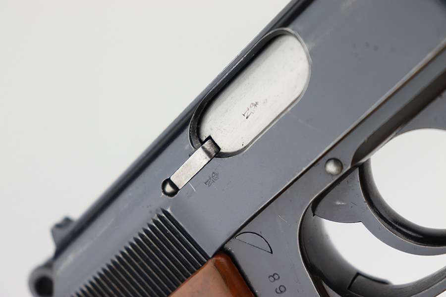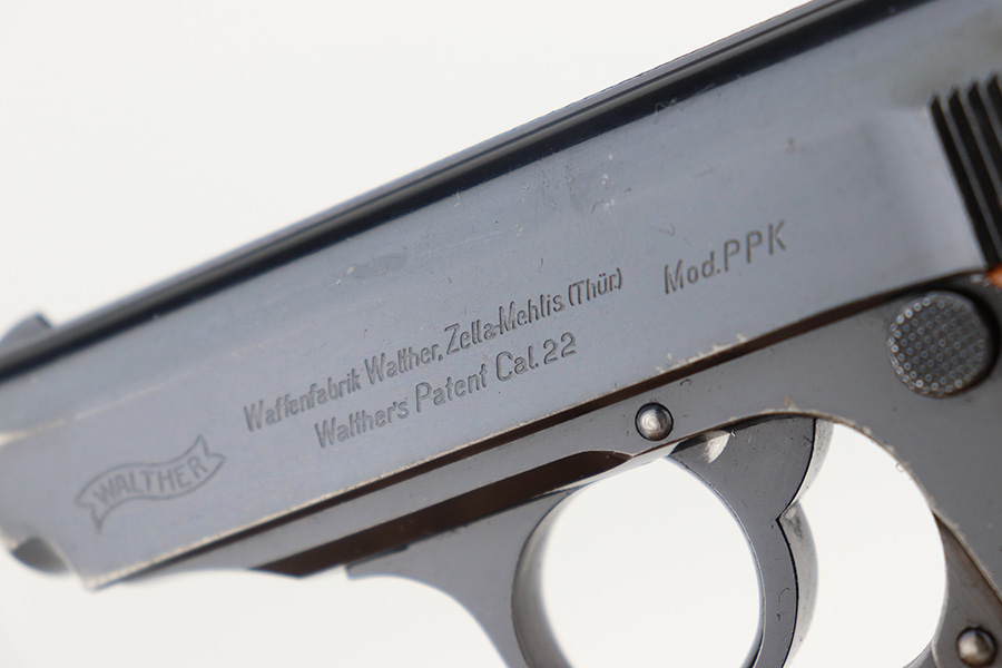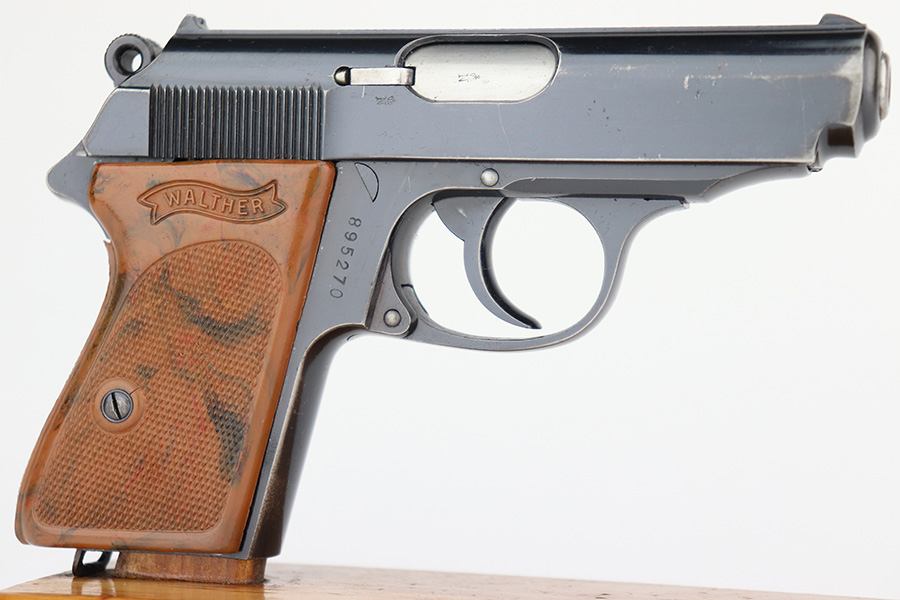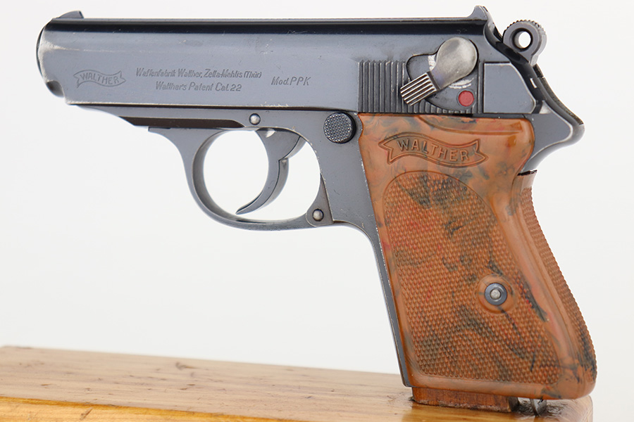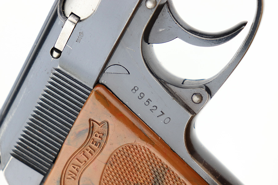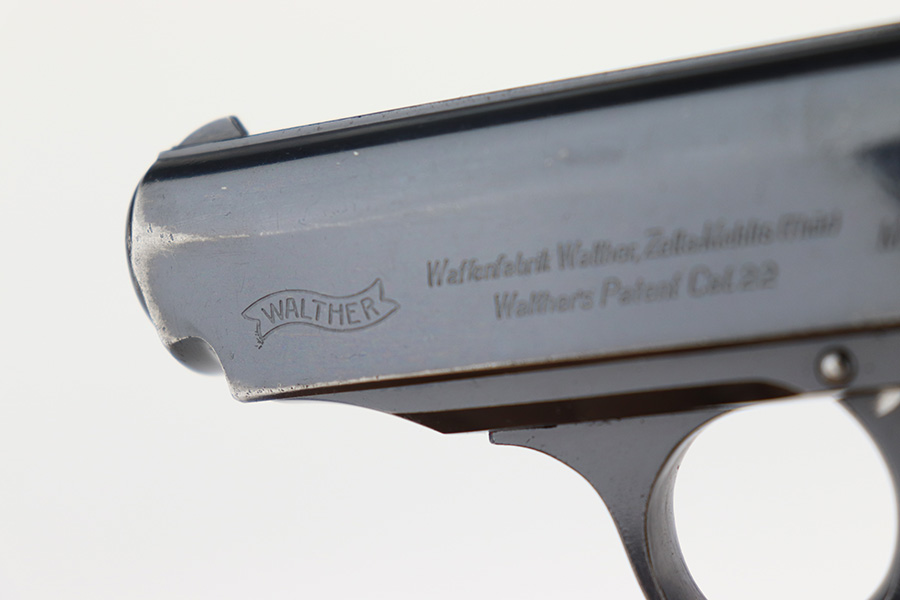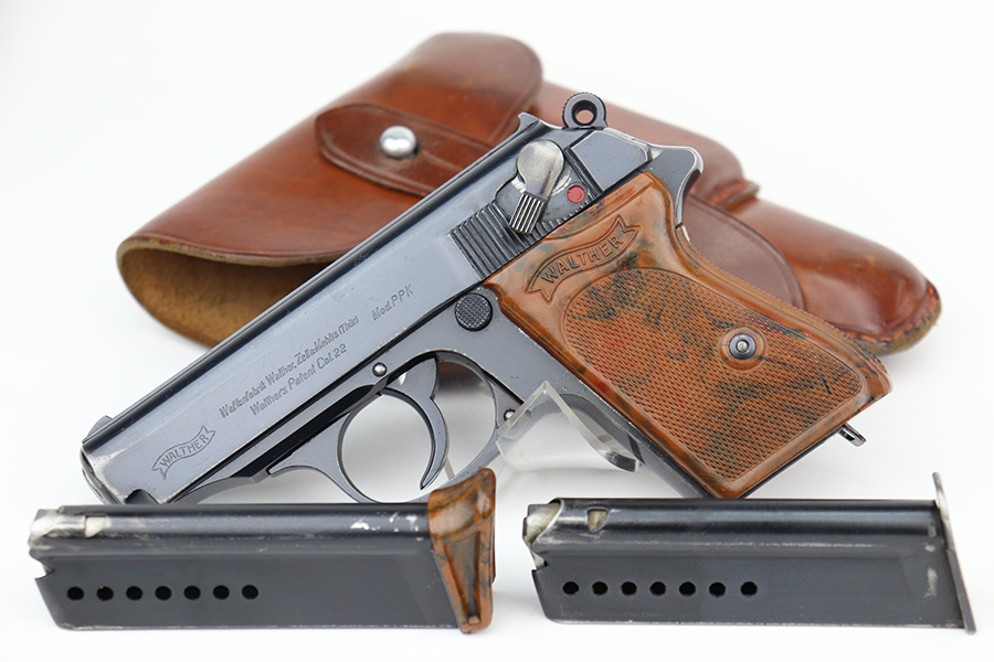 11/28/22 – This is an excellent example of rare .22 Caliber Walther PPK, manufactured in 1935. The gun is all matching and has the proper “Crown N” commercial proofs. It comes as a rig with a very nice period-correct tan leather holster (no maker mark) and two rare “7-hole” magazines – one has a finger extension bottom. The gun itself has retained about 96-97% of its original high polish finish. There is wear around the muzzle and areas of light spotty wear on the front strap and along both sides of the slide. A couple of very light scratches here and there on the slide. Comes with an excellent brown Walther grip – no cracks or chips. Mint bore.