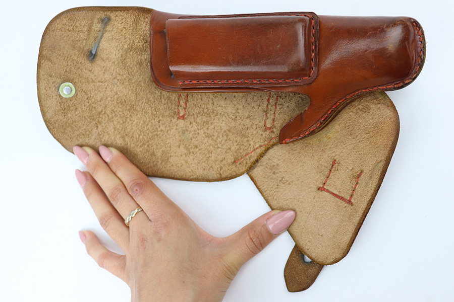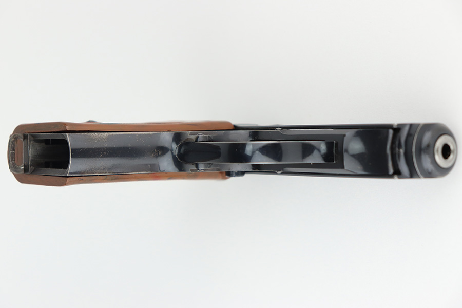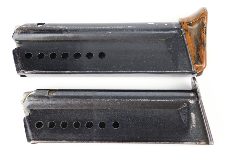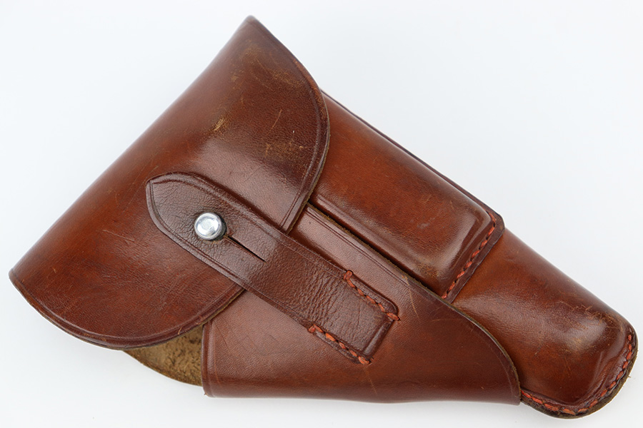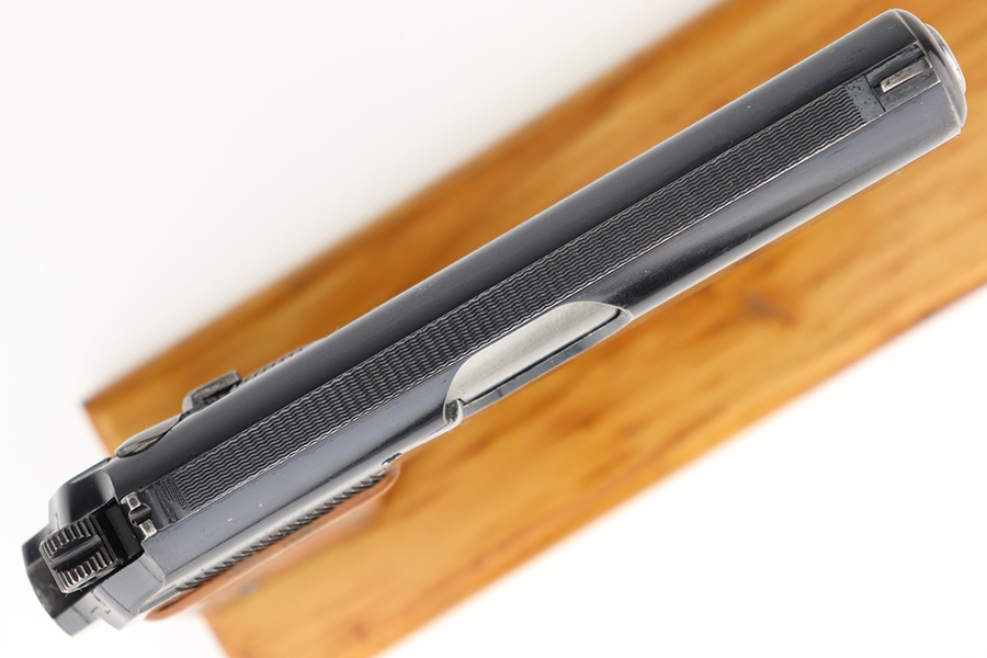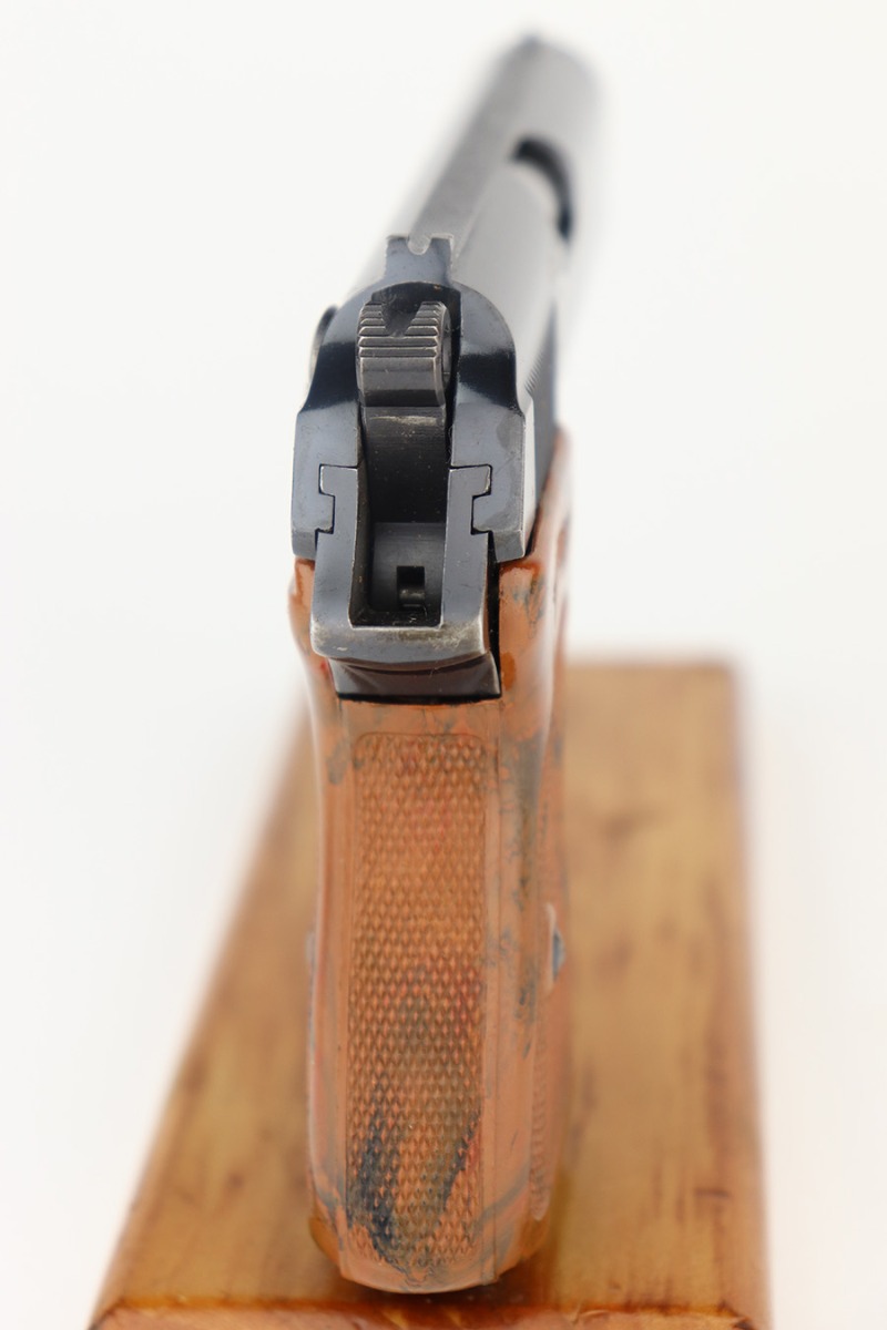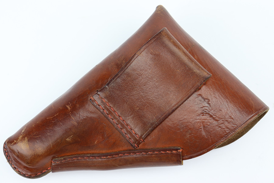 11/28/22 – This is an excellent example of rare .22 Caliber Walther PPK, manufactured in 1935. The gun is all matching and has the proper “Crown N” commercial proofs. It comes as a rig with a very nice period-correct tan leather holster (no maker mark) and two rare “7-hole” magazines – one has a finger extension bottom. The gun itself has retained about 96-97% of its original high polish finish. There is wear around the muzzle and areas of light spotty wear on the front strap and along both sides of the slide. A couple of very light scratches here and there on the slide. Comes with an excellent brown Walther grip – no cracks or chips. Mint bore.