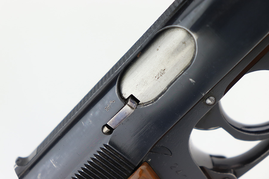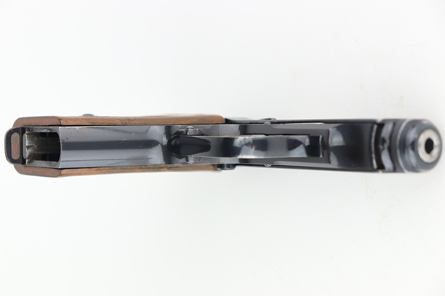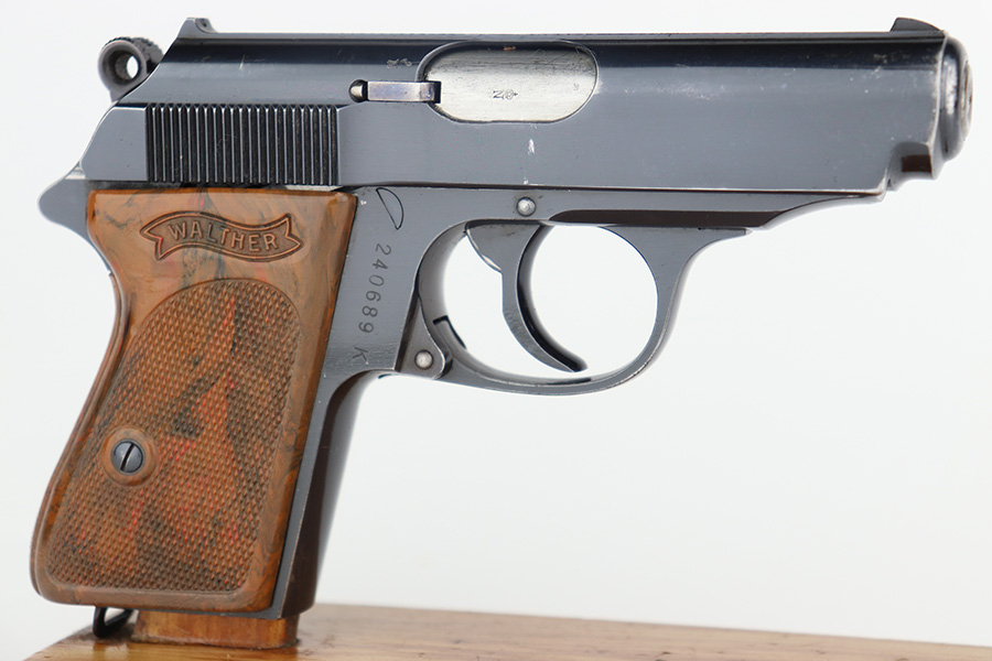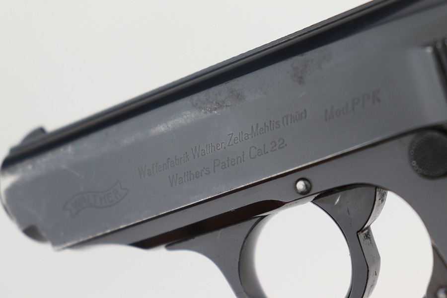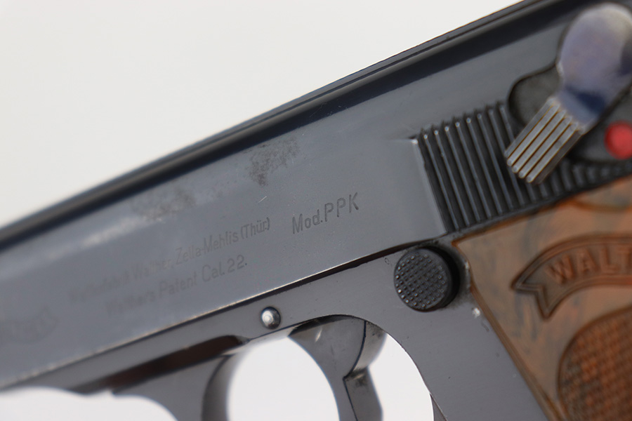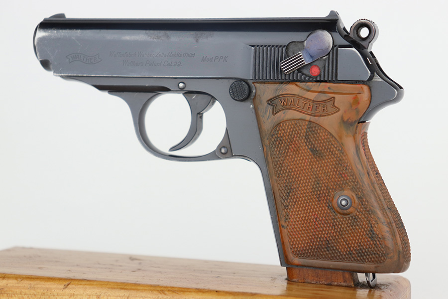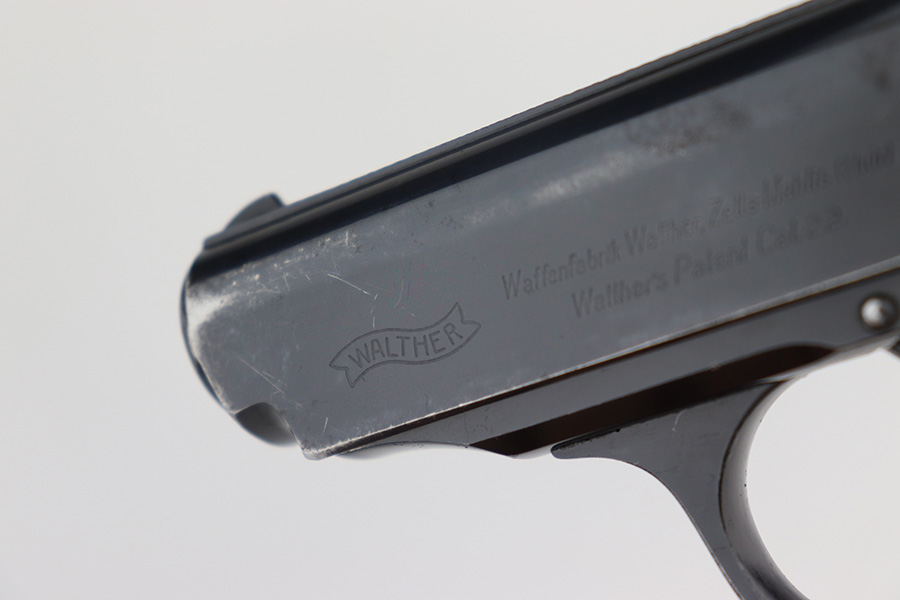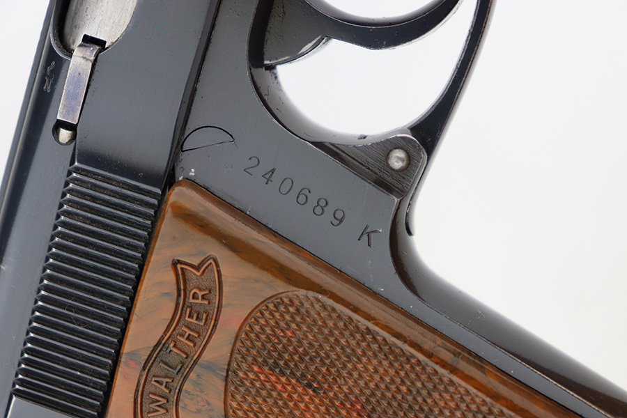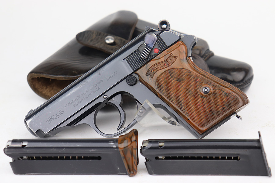 11/28/22 – This is an excellent example of rare .22 Caliber Walther PPK, manufactured in 1939. The gun is all matching and has the proper “Crown N” commercial proofs. It comes as a rig with a nice period-correct chocolate leather Akah holster and two period-correct magazines – one has a finger extension bottom. The gun itself has retained about 96-97% of its original high polish finish. The majority of the wear is around the muzzle, but there is also some very light wear along both sides of the slide. A couple of small areas of very light pin-pricking on the left side of the slide. Comes with an excellent brown Walther grip – no cracks or chips. Mint bore.