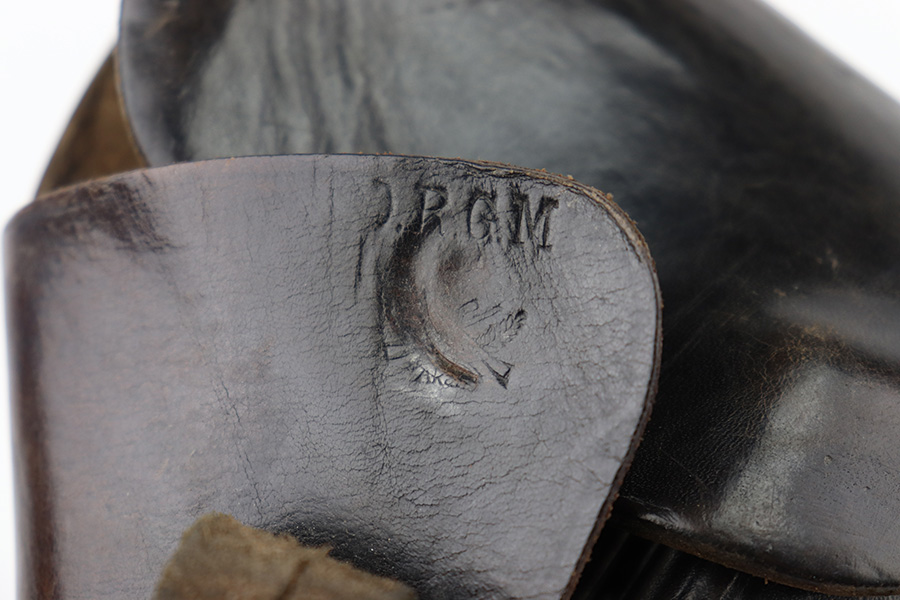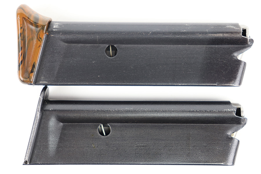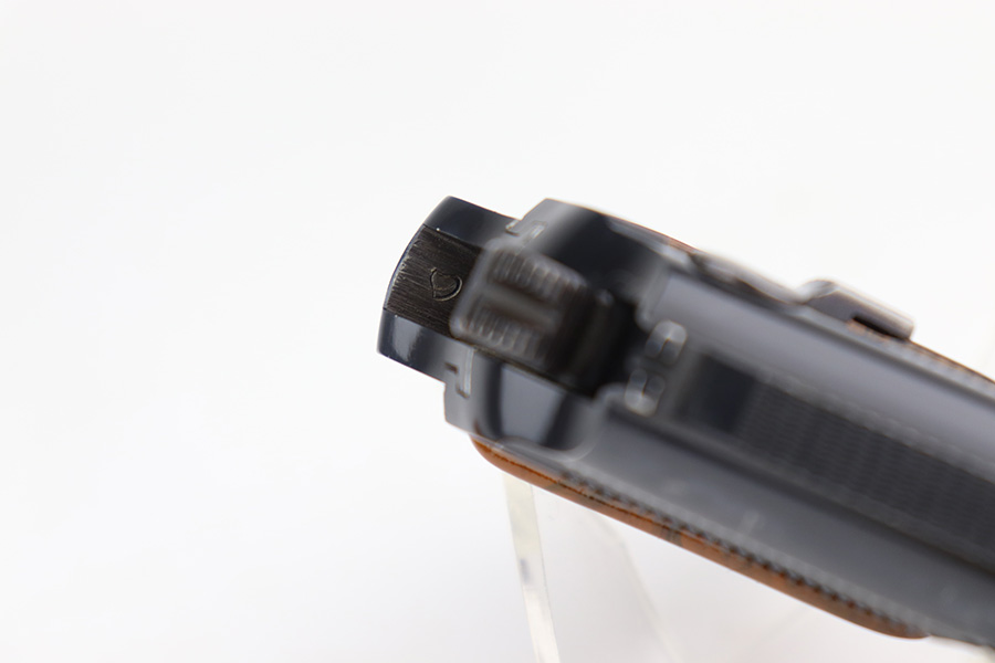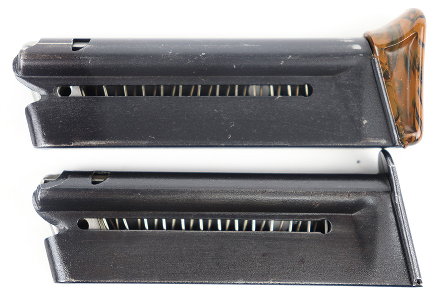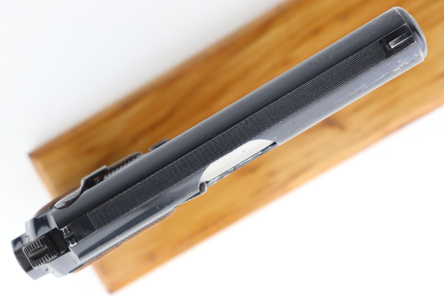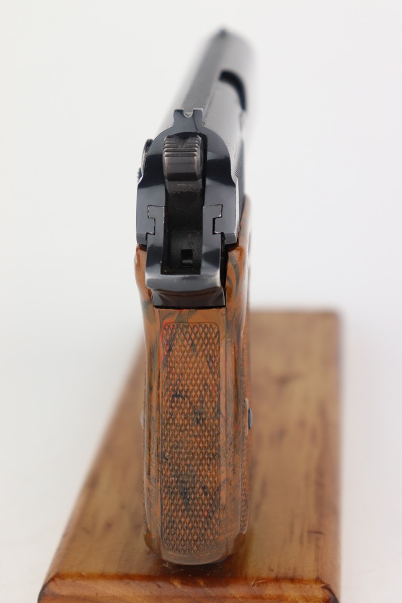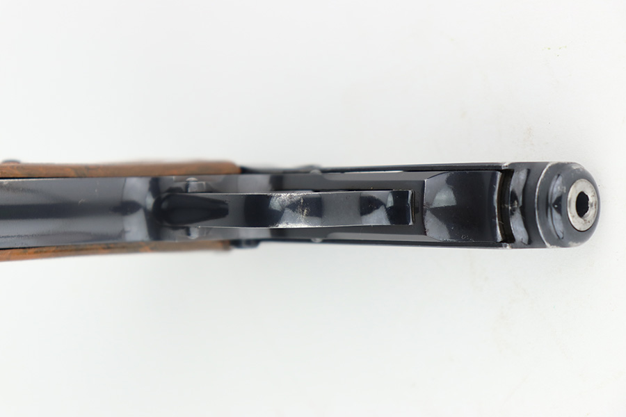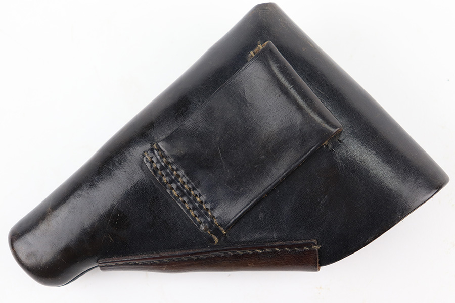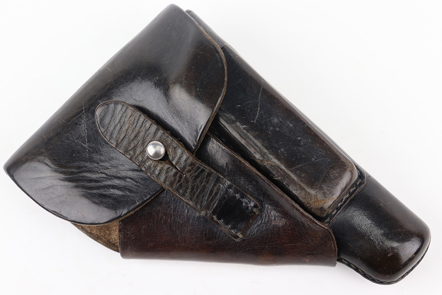 11/28/22 – This is an excellent example of rare .22 Caliber Walther PPK, manufactured in 1939. The gun is all matching and has the proper “Crown N” commercial proofs. It comes as a rig with a nice period-correct chocolate leather Akah holster and two period-correct magazines – one has a finger extension bottom. The gun itself has retained about 96-97% of its original high polish finish. The majority of the wear is around the muzzle, but there is also some very light wear along both sides of the slide. A couple of small areas of very light pin-pricking on the left side of the slide. Comes with an excellent brown Walther grip – no cracks or chips. Mint bore.