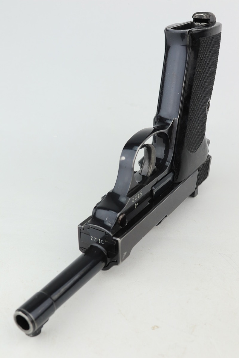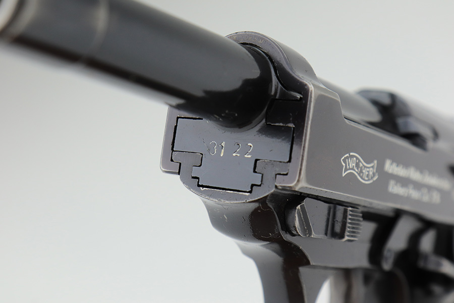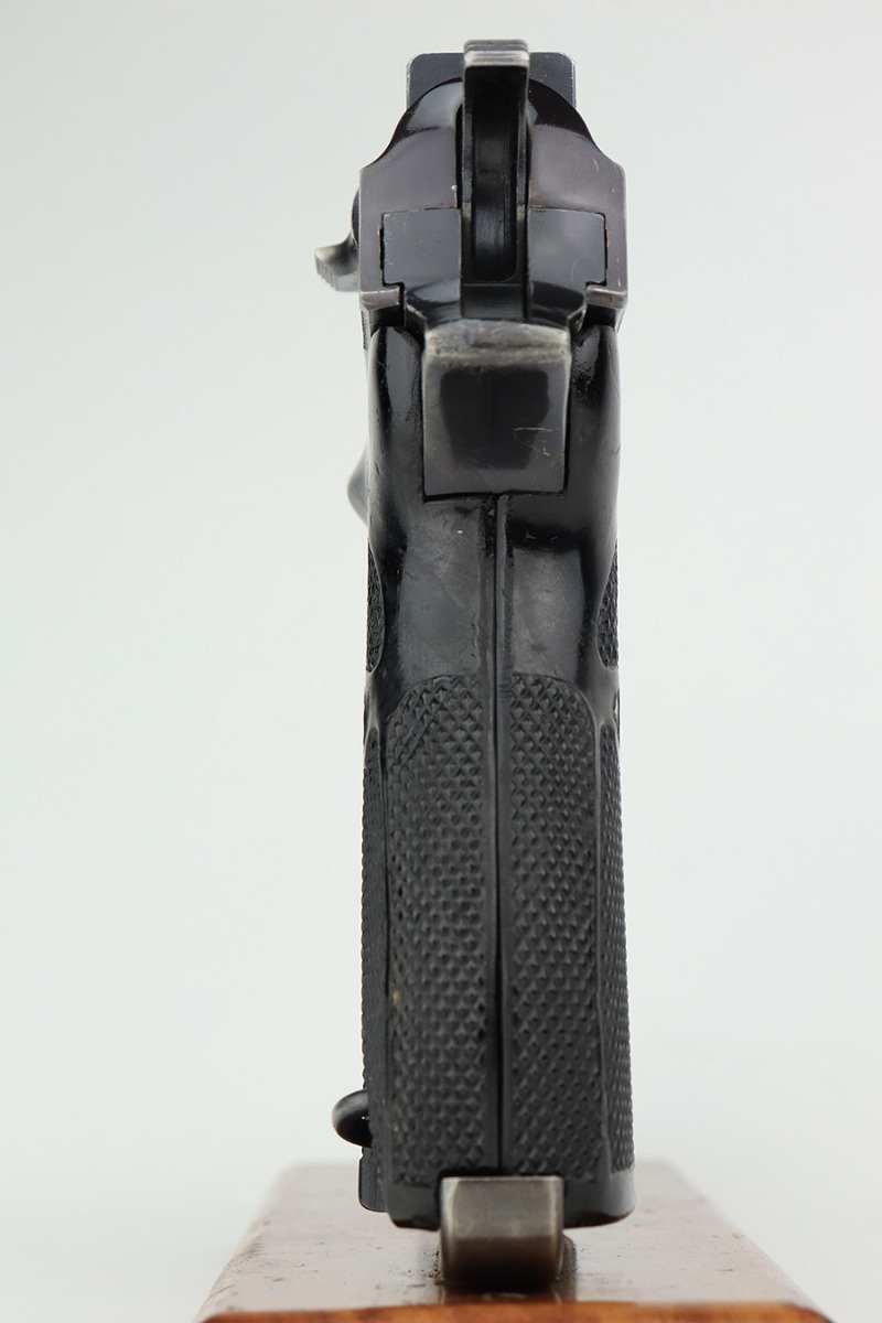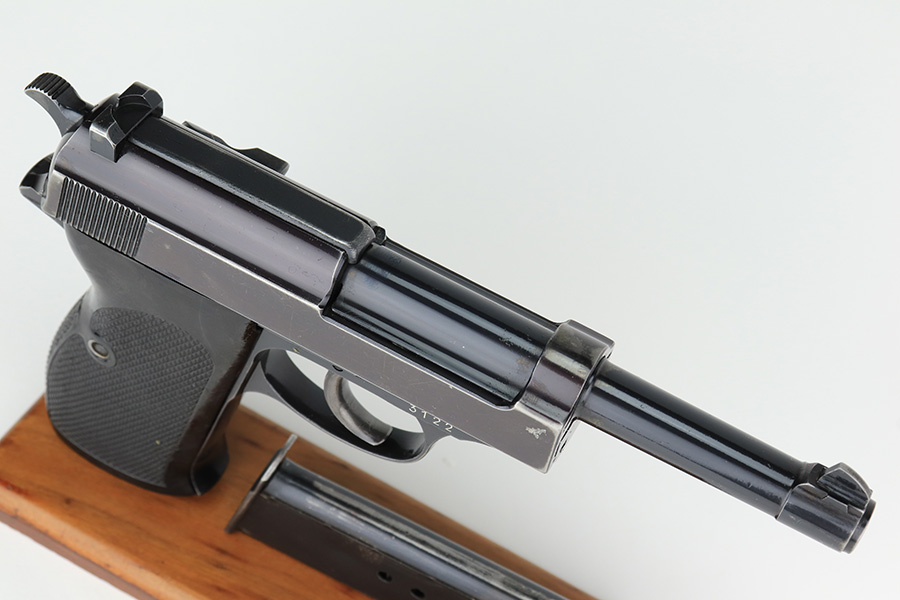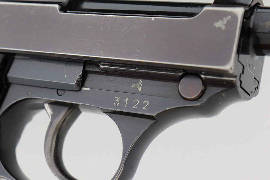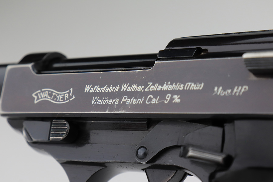 1/19/23 – This is an excellent example of a rare Walther Mod HP sold in the commercial market in the 1940’s. It is all matching and has the proper “Eagle N” proofs. The proof on the right side of the slide is factory double-stamped. The gun has retained about 96-97% of its original high polish finish. The bluing on the slide has a really nice plum tint to it. There is very minor wear around the muzzle and around the high edges of the slide. Some tiny scratches on the right side of the slide and some light scratchy wear on the front strap. Fitted with an excellent set of “Eagle 359” military proofed grips and comes with an un-marked magazine. Mint bore. De-cocker is functional.