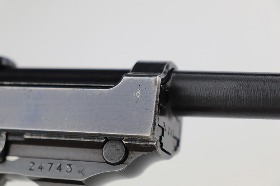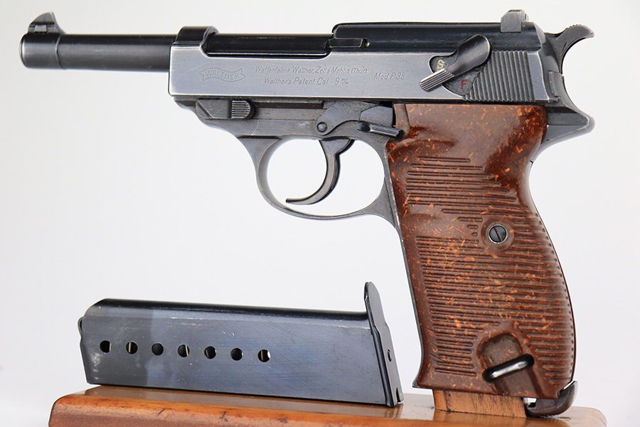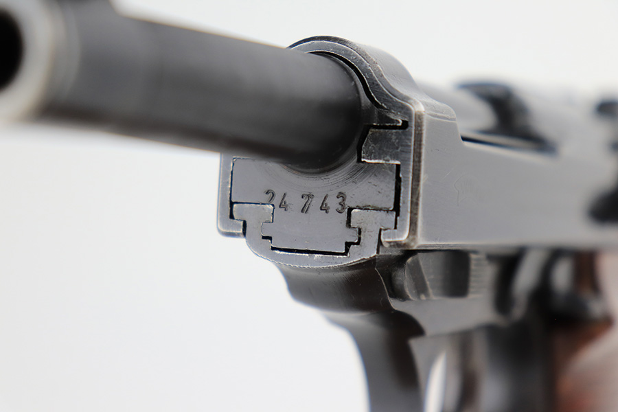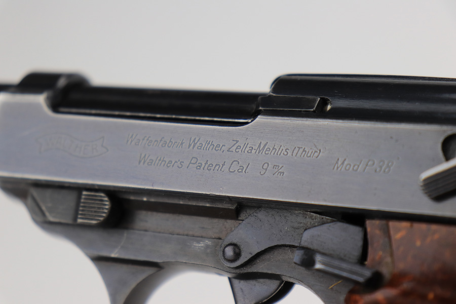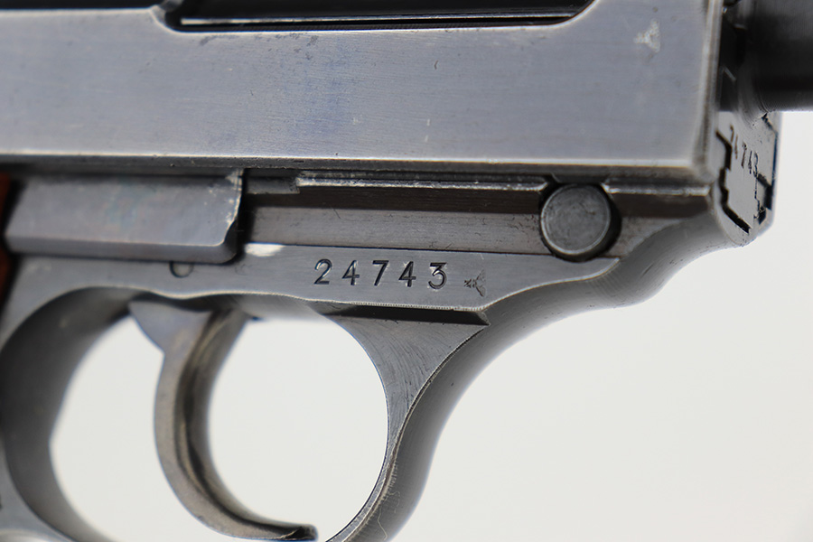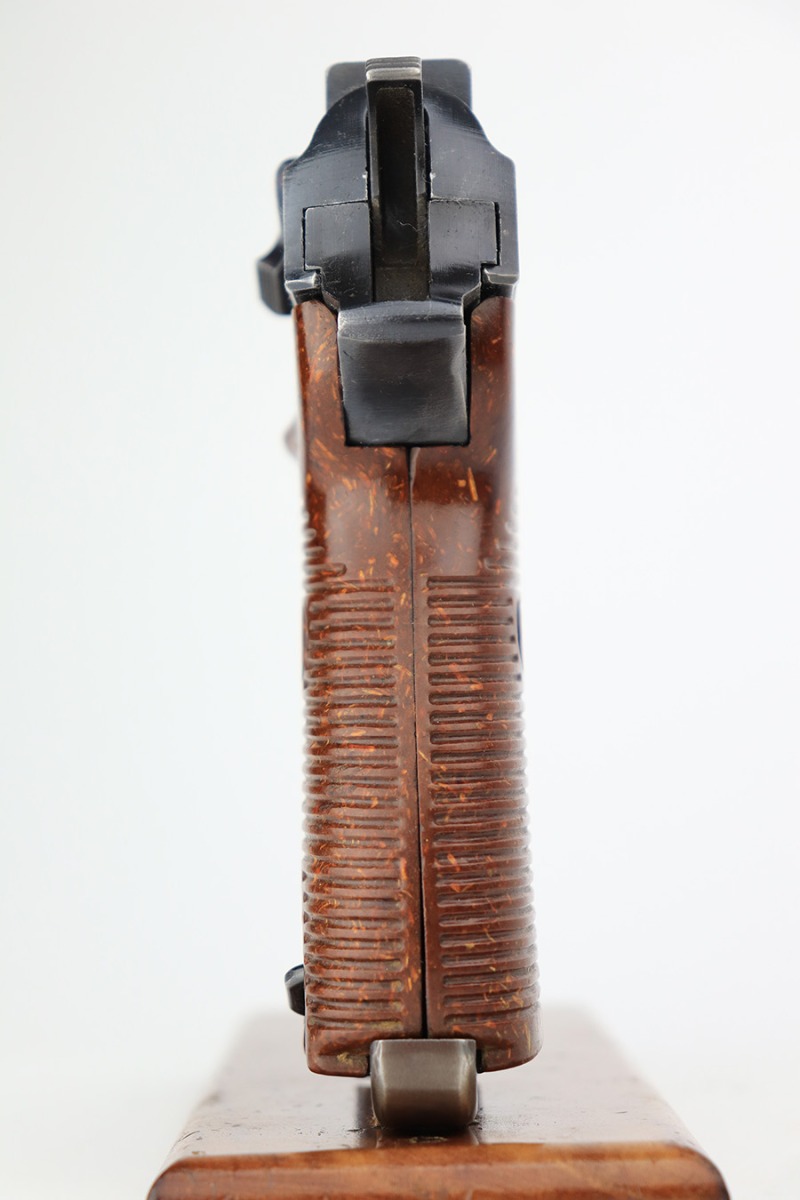 5/5/23 – This is an excellent example of a rare Walther Mod P.38 sold in the commercial market during WW2. This one is all matching and has the proper “Eagle N” proofs. This gun is rare as only 1,800 were produced. It has retained about 94-95% of its original finish. Very minor wear around the muzzle and on the high edges. Very minor wear on the front strap and on both sides of the slide. A few tiny scratches here and there. Fitted with excellent reddish particle grips. Comes with an un-marked magazine. The bore has strong rifling, but there is light freckling in the grooves. De-cocker is functional.