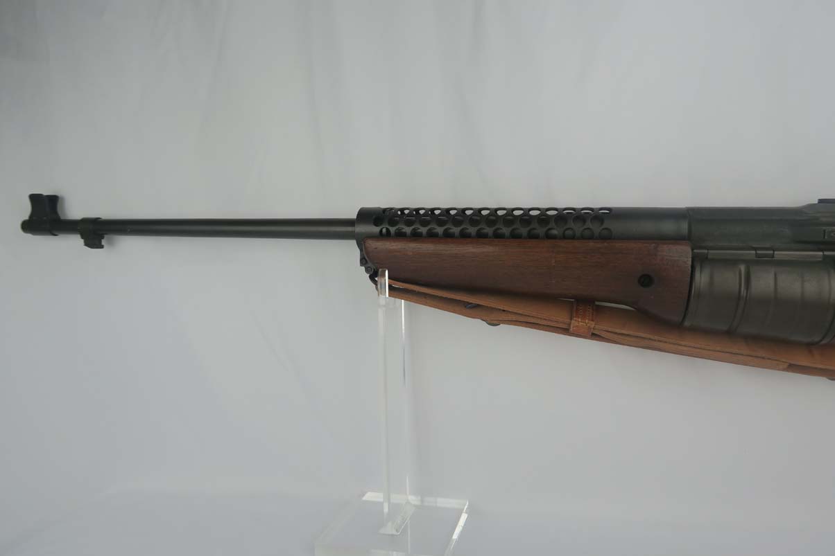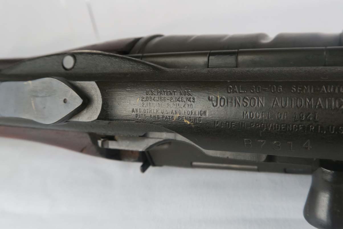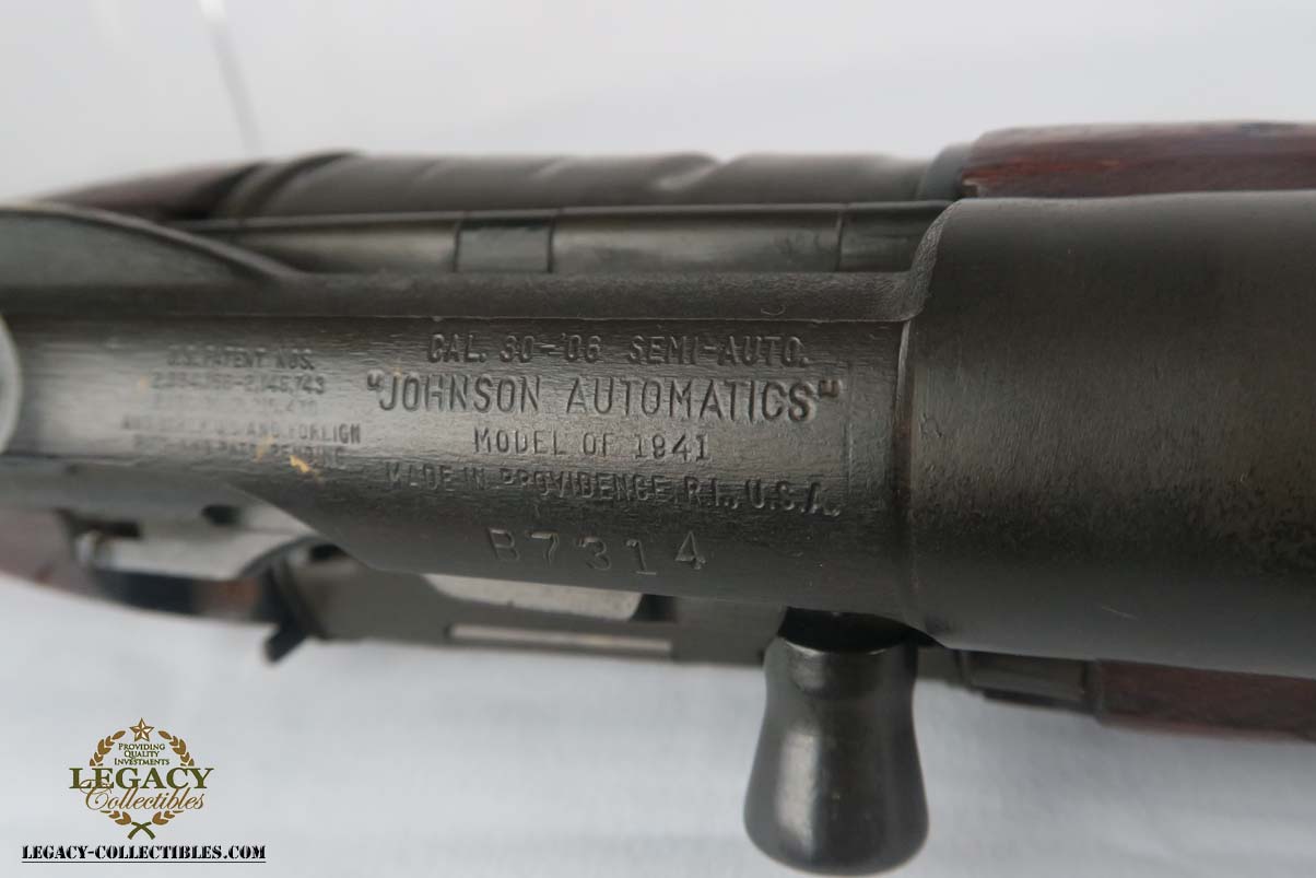 7/14/17 –  This is an excellent Johnson M1941 Rifle from World War II! The finish is all original and in near mint condition. The wood is excellent with a few minor dings and scratches, and a surface scratch that appears as a crack in photos, but does not go through the surface level of the wood. It has not been sanded or refinished. The bore is mirror with excellent rifling. Only 20,000 manufactured! The Johnson Semi-Automatic rifle was invented by Captain Melvin M. Johnson, Jr. of the US Marine Corps Reserve, also the inventor of the Johnson Light Machine Gun, in 1936. After development completed, manufacture was commenced in 1941 by Johnson Automatics, Incorporated, and its subsidiary, The Johnson Automatics Manufactured Company, at Cranston, Rhode Island. The M1941 was ordered by the Netherlands for issue to the KNIL in the Dutch East Indies, but the Japanese invaded the islands before the rifles could be shipped from California. At this time, the U.S. Marine Corps found itself in need of a modern fast-firing infantry rifle, and acquired some rifles from the Dutch East Indies shipment for issue to its Paramarine battalions then preparing to deploy for action in the Pacific theatre. By all accounts, the M1941 performed acceptably in combat with the Marines in the early days of the Pacific fighting.