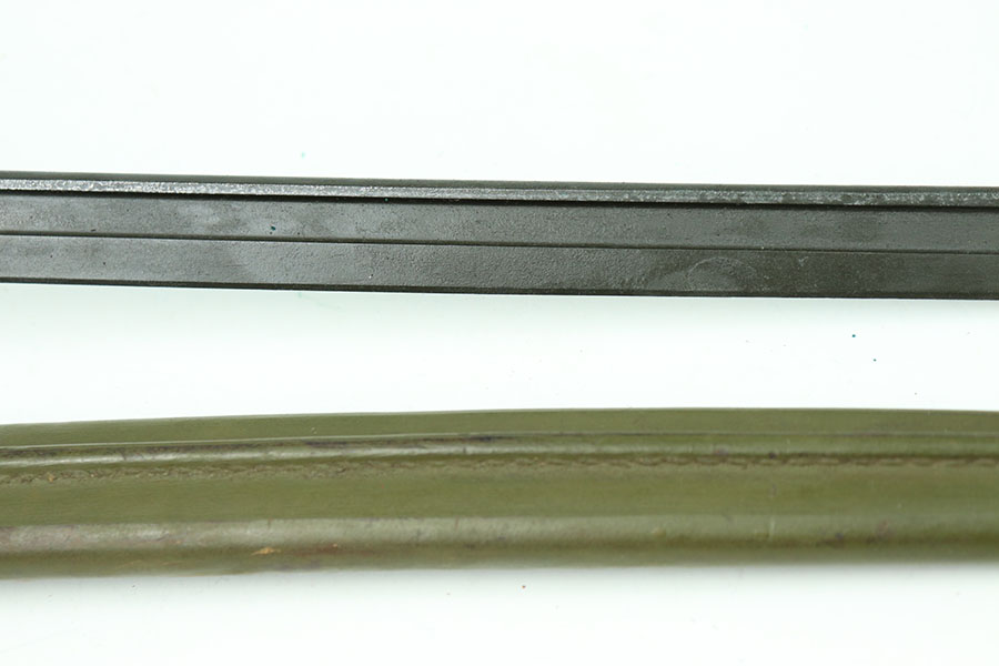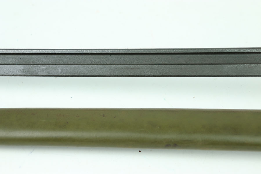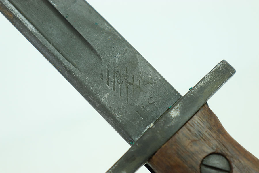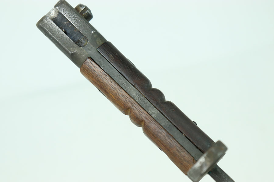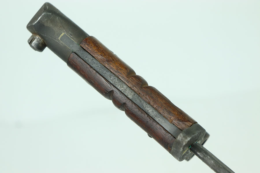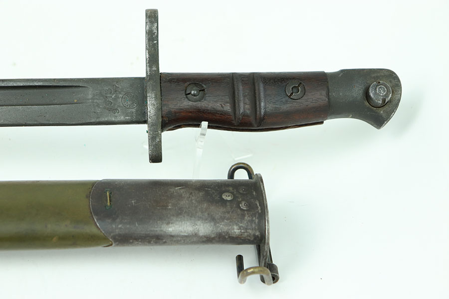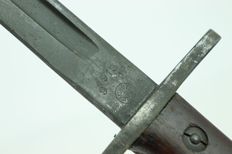 5/21/24 – Original and excellent– condition. WW1 era Remington model 1913 bayonet for the Springfield M1903 or similar US / British weapon. The bayonet blade is excellent with minimal wear and no signs of sharpening. The base is maker stamped, 1913 dated with a Remington logo. The reverse is stamped “US” with other characters that have been crossed out. Excellent wood handles. The scabbard appears to have the original finish. The throat and tip are stamped “GF”. No major issues just on minor dent on the opposite side of the “GF”.