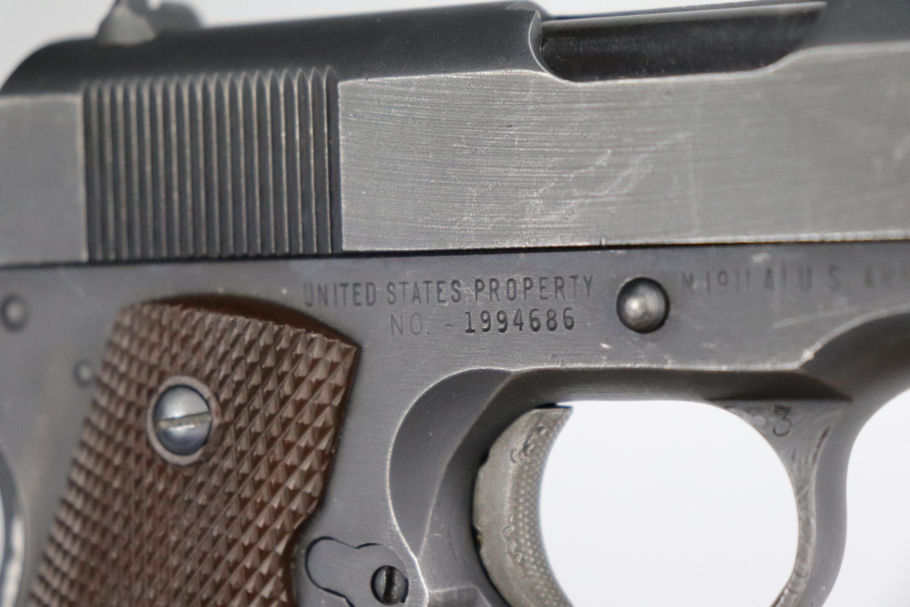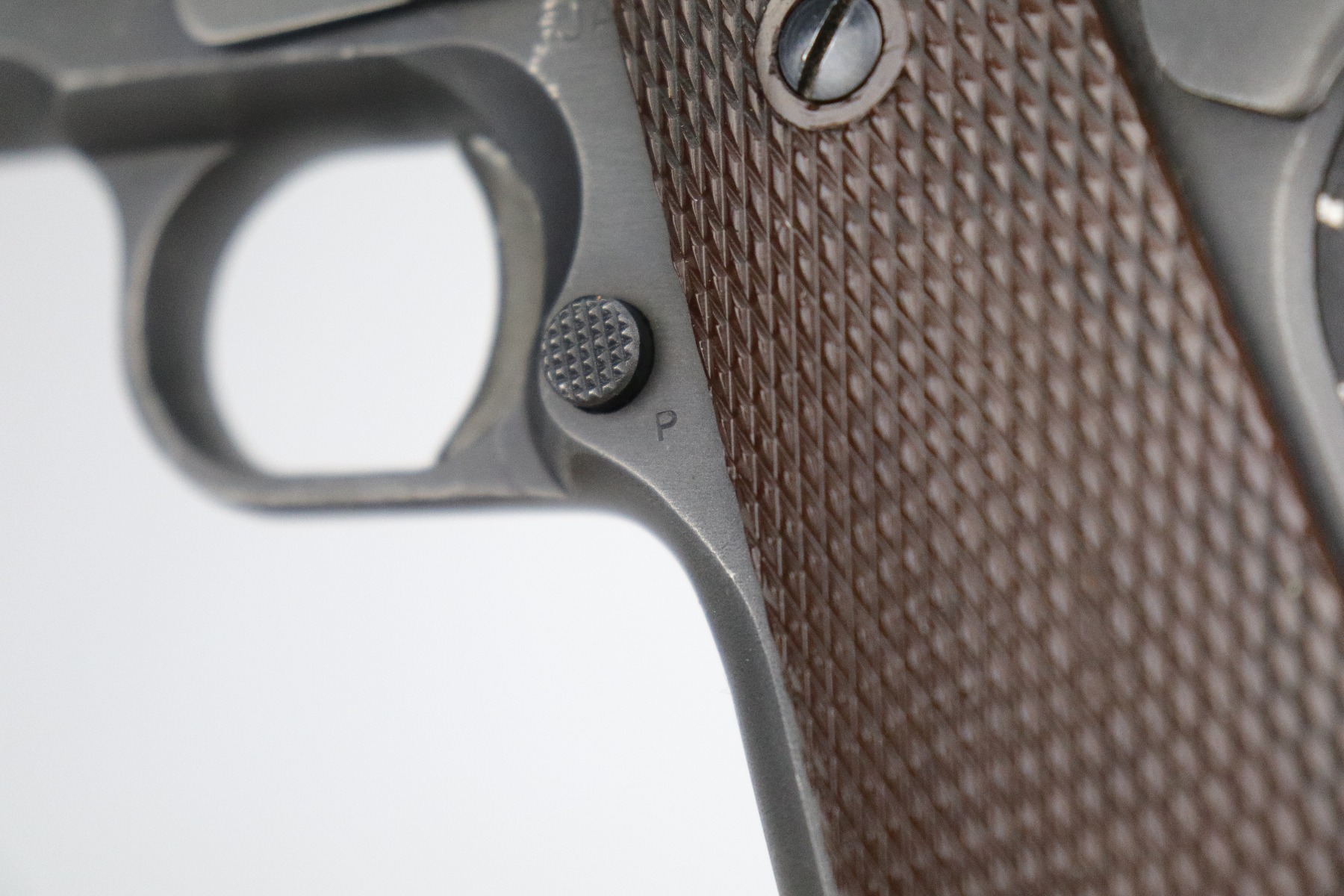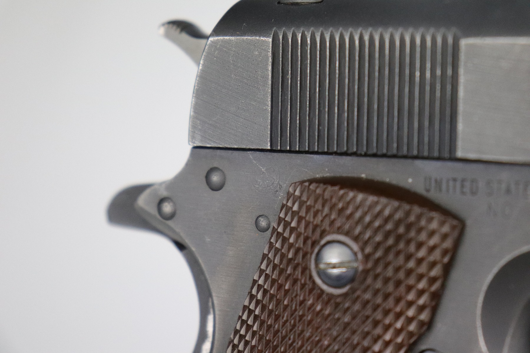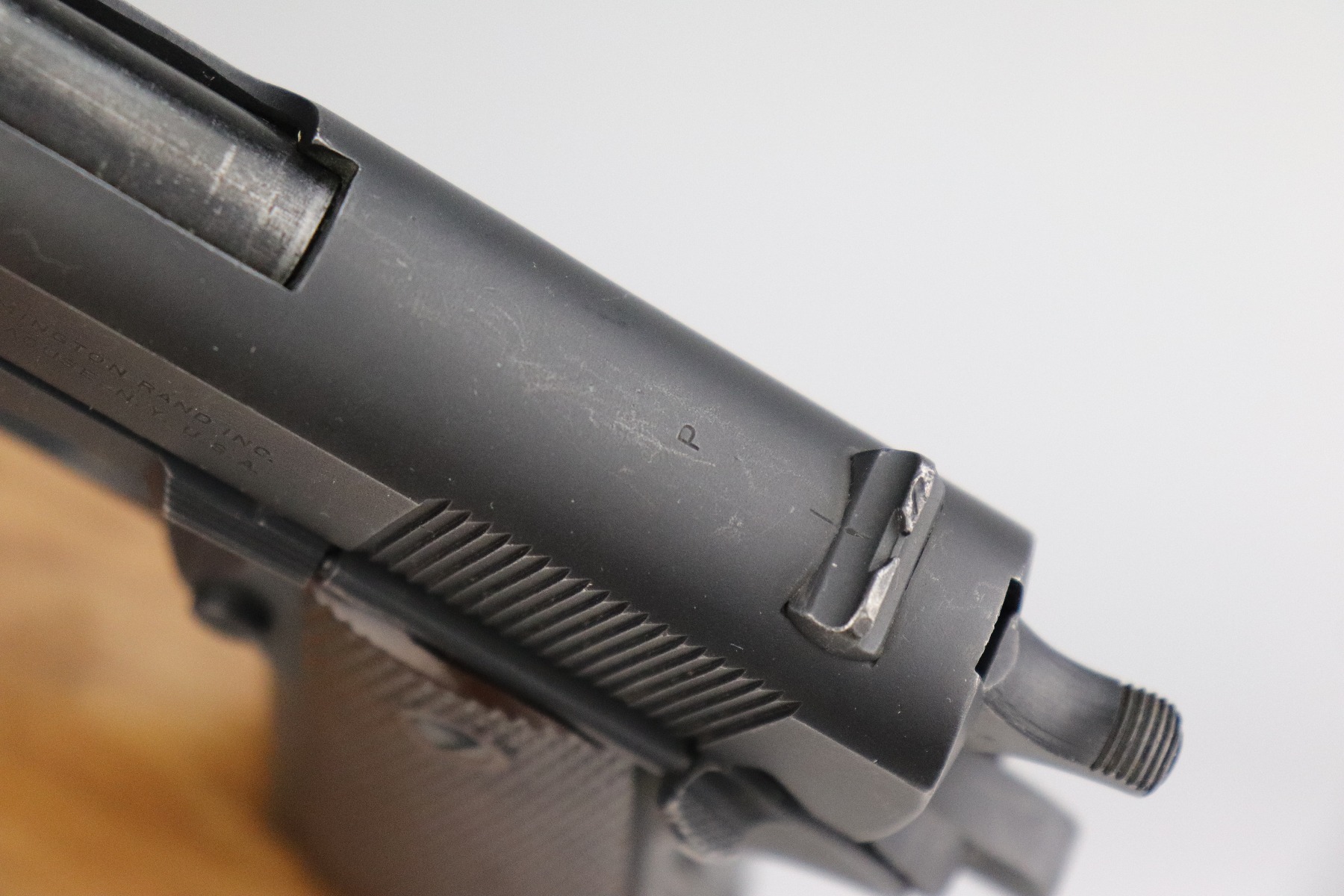 8/20/20 – This is an original WW2 Remington Rand 1911A1 issued to the US military in 1944. It has “FJA” inspector’s initials and a “P” proof on the left side of the gun. It has a military cross-canon cartouche and a “United States Property” mark on the right side. It has a correct Hi Standard barrel. Overall, the gun is in excellent condition, retaining about 97% of its original finish. There is very minor muzzle and general high edge wear. One spot of discoloration on the right side of the frame, near the tang. Very minor thinning on the front strap. Excellent grips. Comes with a period-correct, “L” marked magazine. The bore is excellent – shiny with strong rifling.