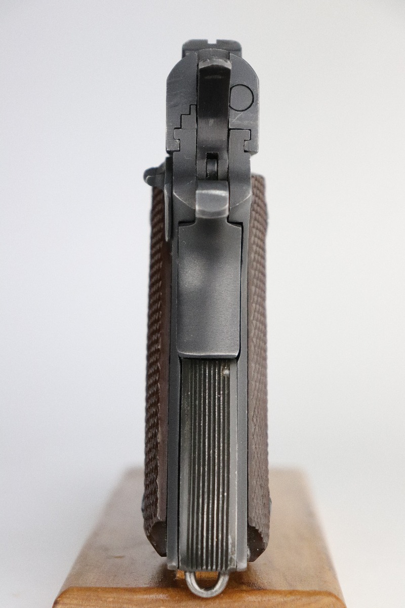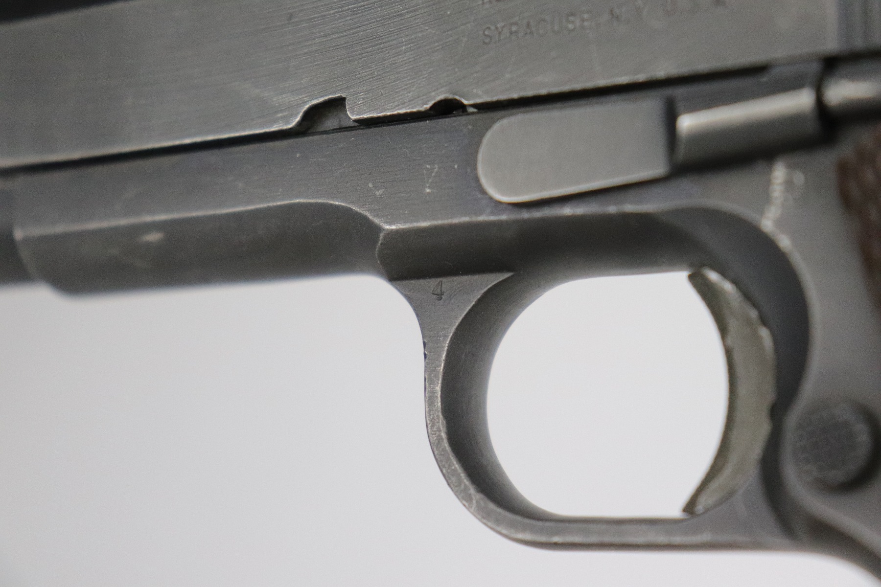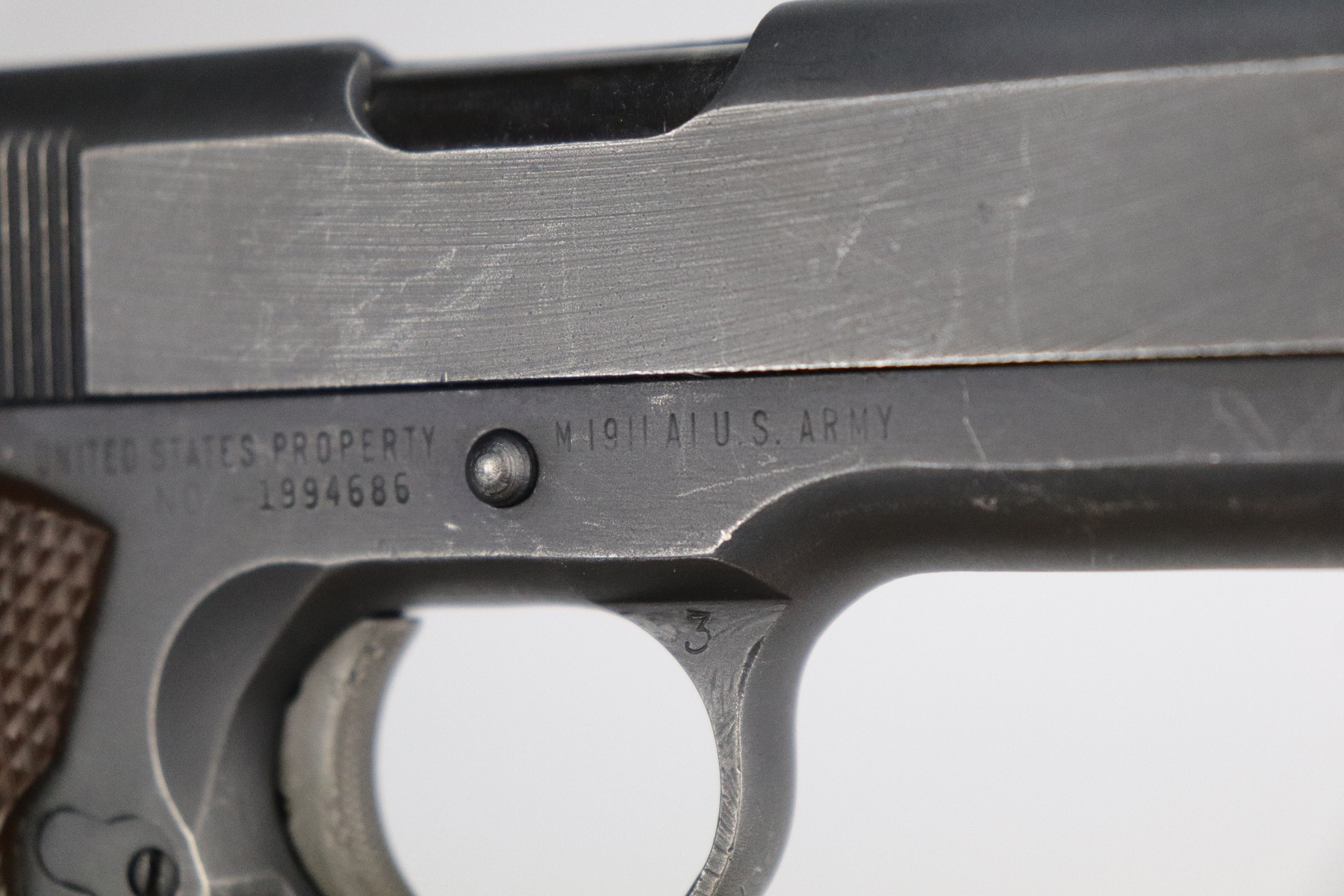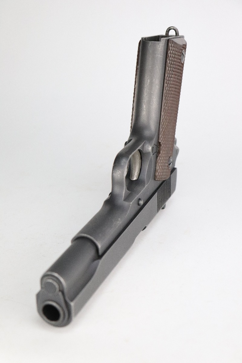8/20/20 – This is an original WW2 Remington Rand 1911A1 issued to the US military in 1944. It has “FJA” inspector’s initials and a “P” proof on the left side of the gun. It has a military cross-canon cartouche and a “United States Property” mark on the right side. It has a correct Hi Standard barrel. Overall, the gun is in excellent condition, retaining about 97% of its original finish. There is very minor muzzle and general high edge wear. One spot of discoloration on the right side of the frame, near the tang. Very minor thinning on the front strap. Excellent grips. Comes with a period-correct, “L” marked magazine. The bore is excellent – shiny with strong rifling.