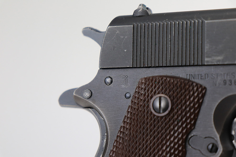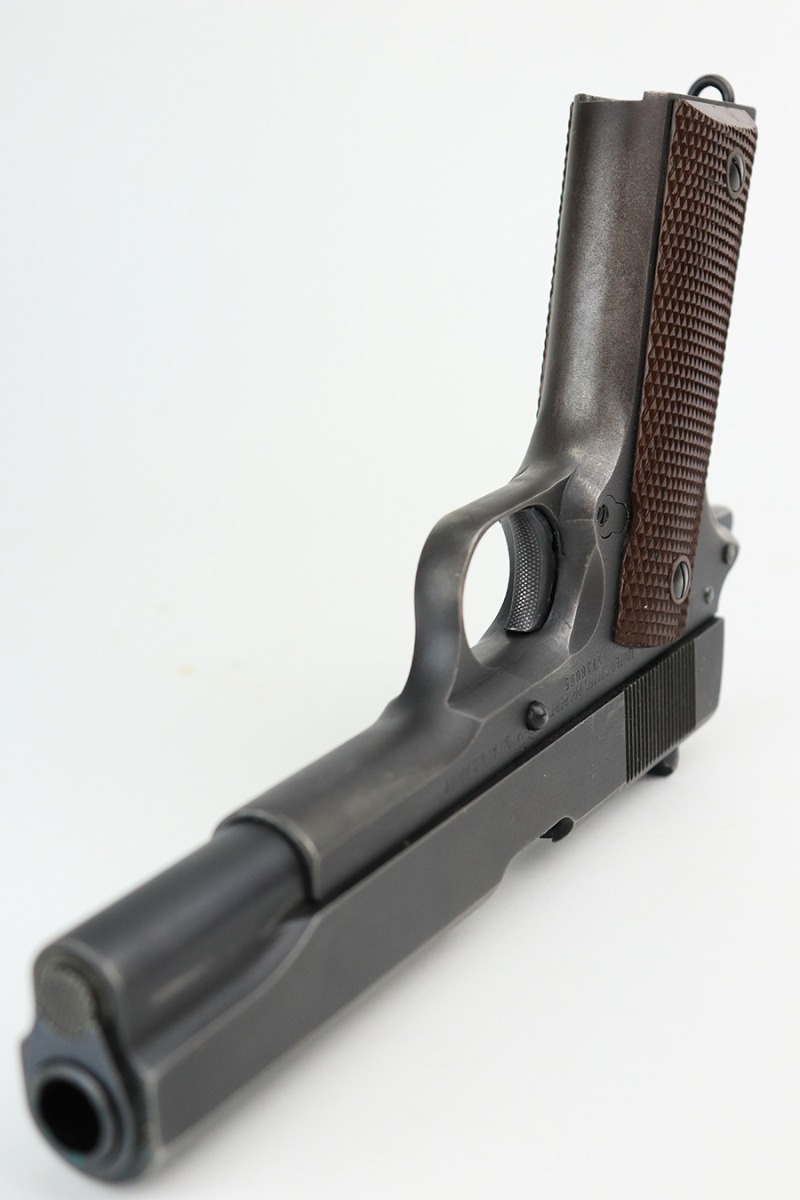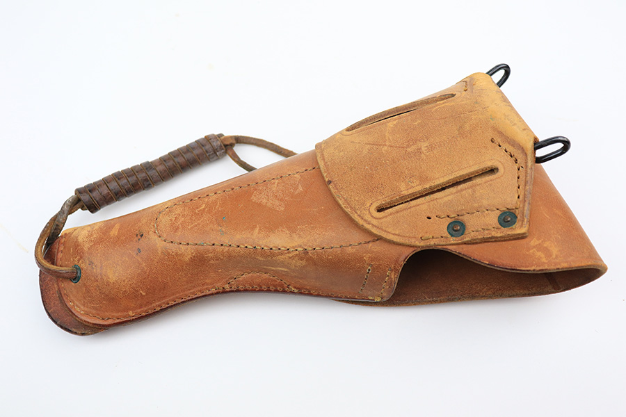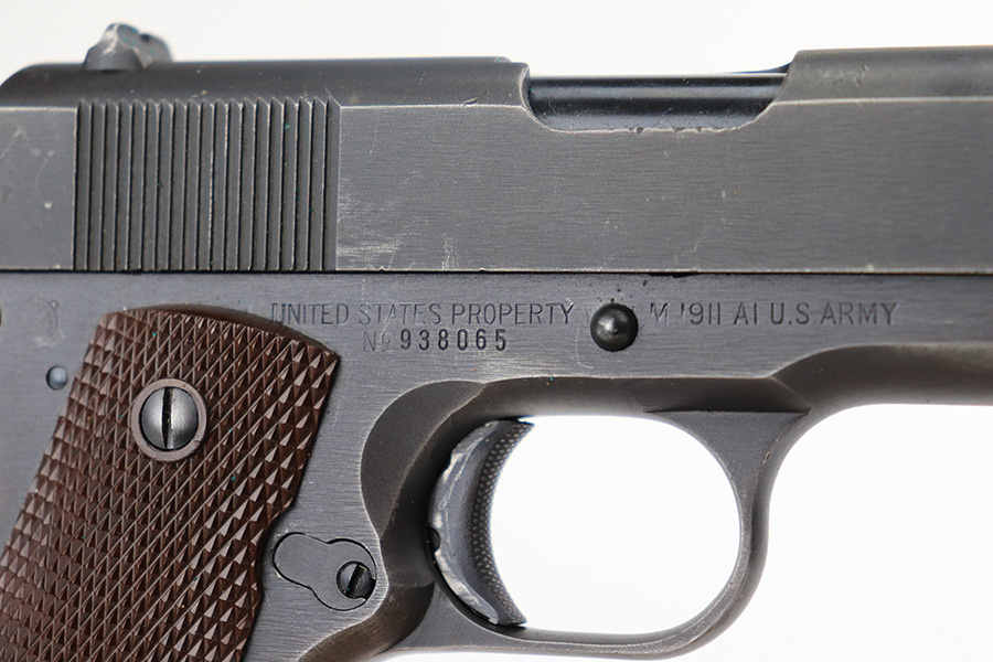 5/19/22 – This is an excellent example of a Remington Rand Model 1911A1 issued to the US military in 1943. It is “United States Property” marked, has a cross-cannon military cartouche, and has the proper “FJA” inspector initials. This one also has a scarce 2nd variation slide and is in the proper serial range for this variation. The gun comes as a rig with one period-correct “R” marked magazine and a very nice 1942-dated tan leather holster with its original lanyard. The gun itself has retained about 96% of its finish. There is very minor wear around the muzzle and around the high edges of the slide. Minor thinning on both grip straps and a few tiny handling marks here and there. Comes with excellent period-correct plastic grips. Mint bore.