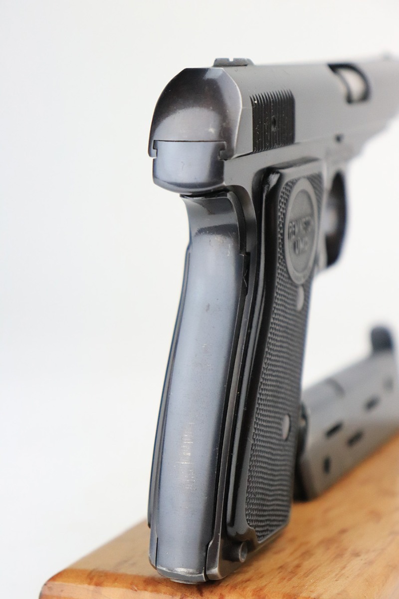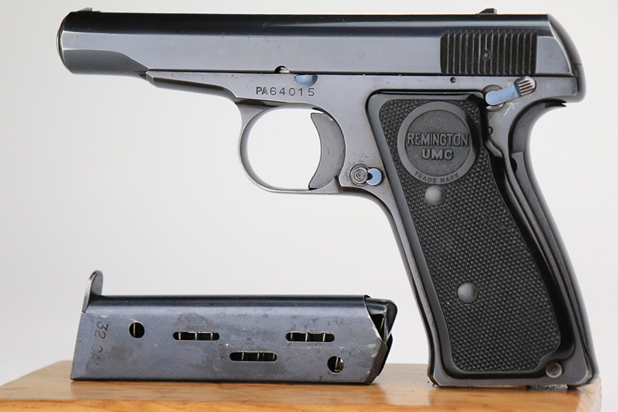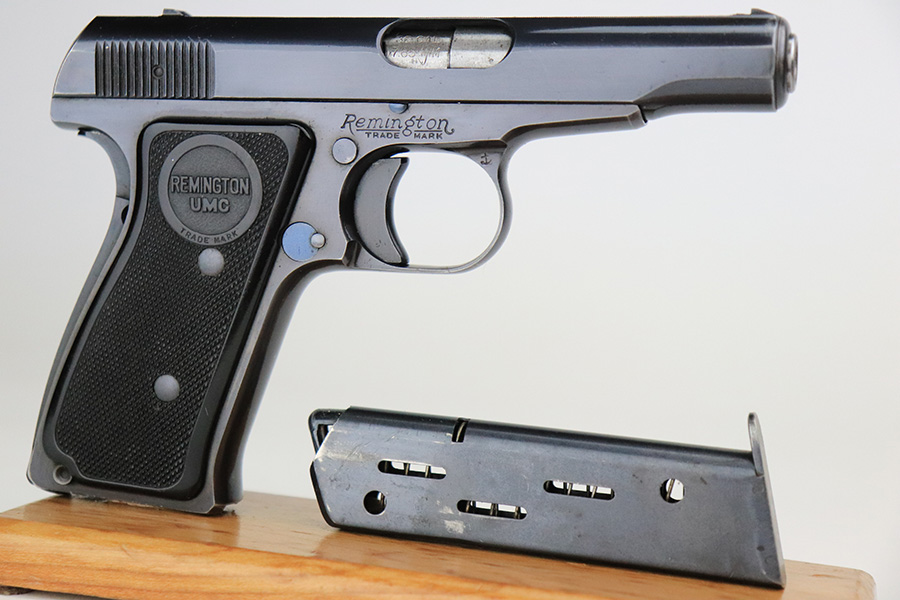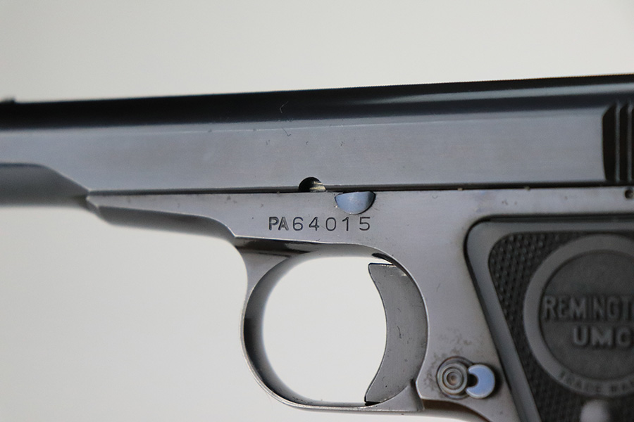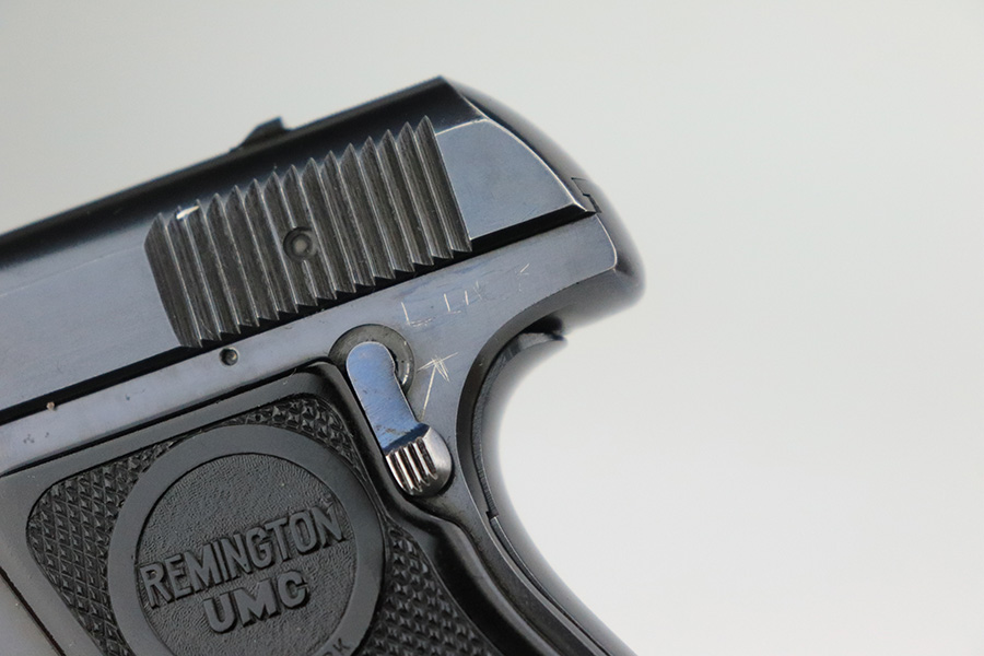 6/8/22 – This is an excellent example of a Remington UMC Model 51. This is a Type II example, chambered in 7.65mm or .32 ACP and manufactured around 1923. It is characterized by having 15 slide serrations and “32 CAL over 7.65 M/M” on the barrel. It has retained about 97% of its original bluing. There is very minor muzzle wear and some light scratchy wear on both grip straps. There is an arrow and the word “LOCK” lightly scratched into the left side of the frame, just behind the safety lever. Comes with excellent period-correct black bakelite grips and a proper magazine. Excellent bore with strong rifling and some very minor frosting in the grooves.