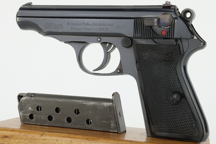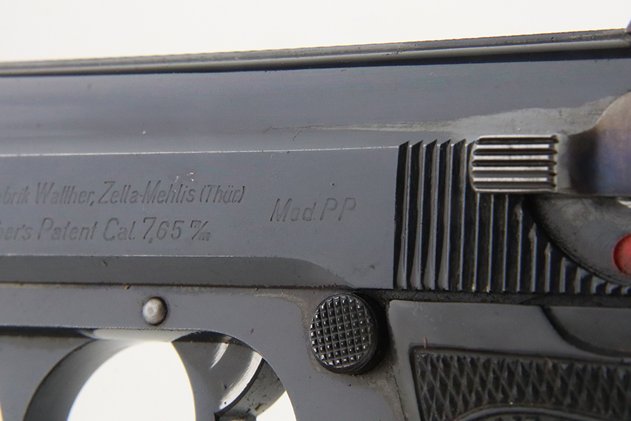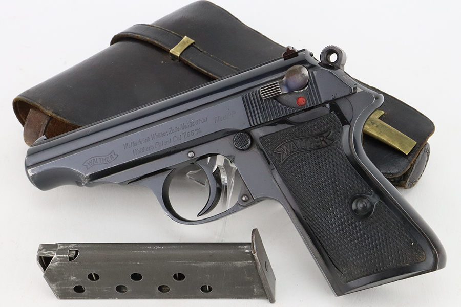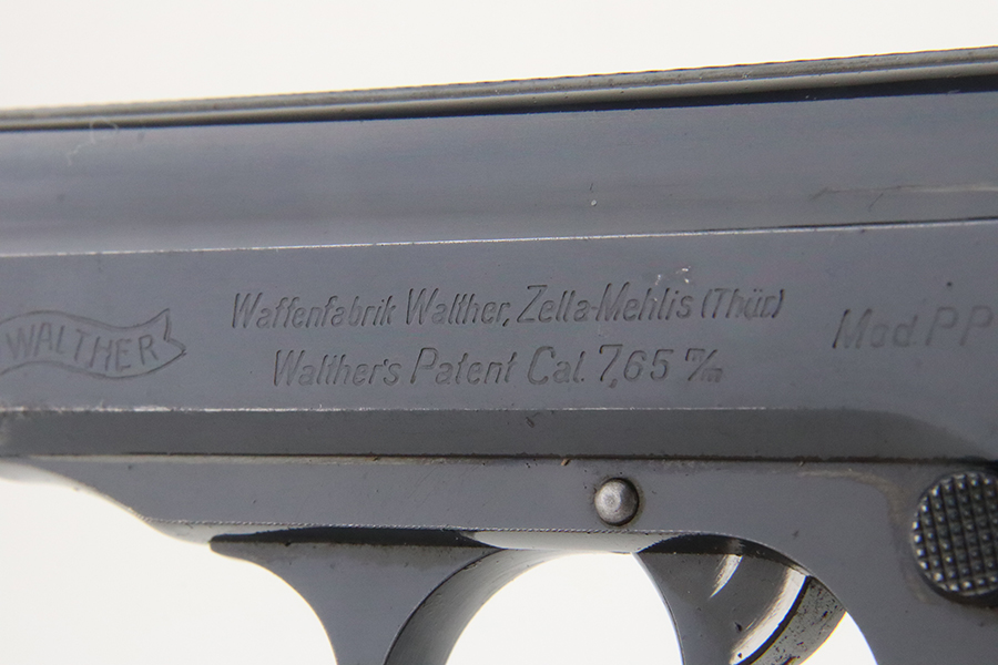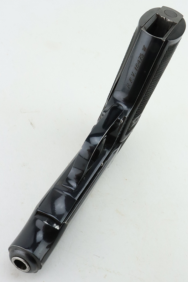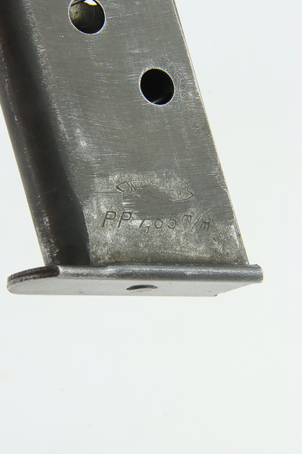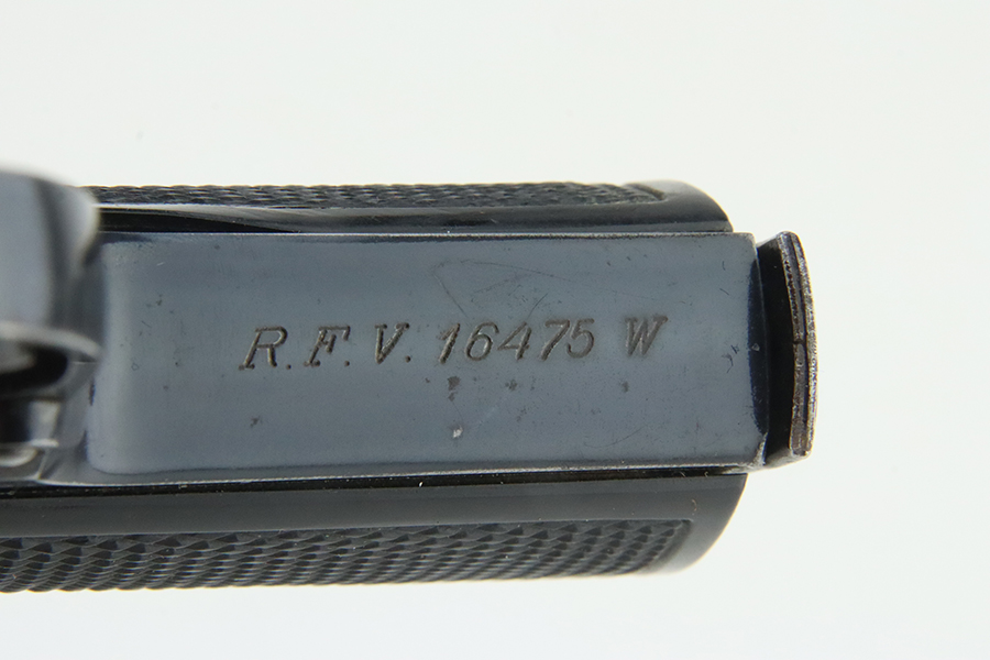 1/29/24 – This is an original Walther PP designated for the Reichs Finanz Verwaltung. It is marked “R.F.V. 16475 W” on the front strap. This Nazi department was in charge of the borders as well as government financial matters – much like our own IRS and border police. This one has retained about 96% of its original finish. Just minor muzzle wear and an area with tiny pitting on the right side of the slide. Fitted with black bakelite grips – there is cracking along the edge of the left panel. Comes as a rig with a generic holster and a scarce, late-war, “w” marked magazine. Excellent, shiny bore.