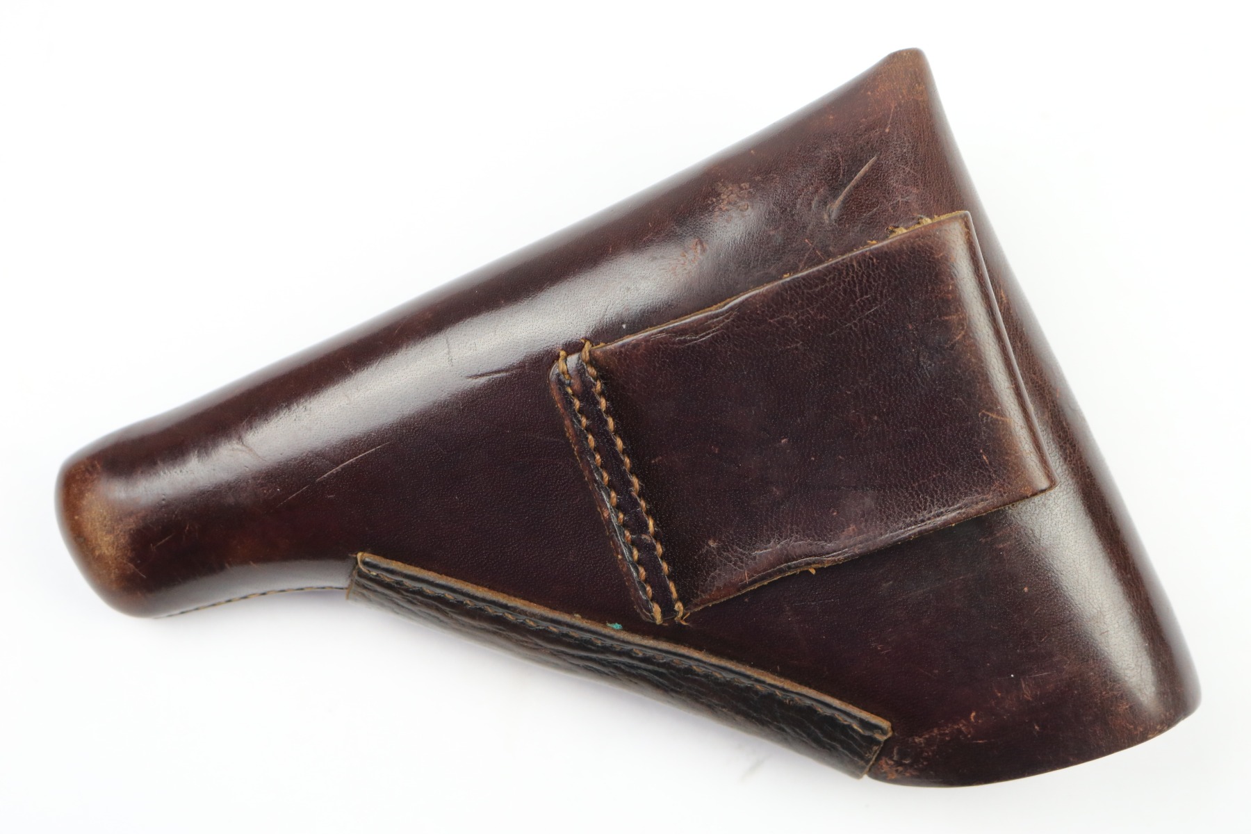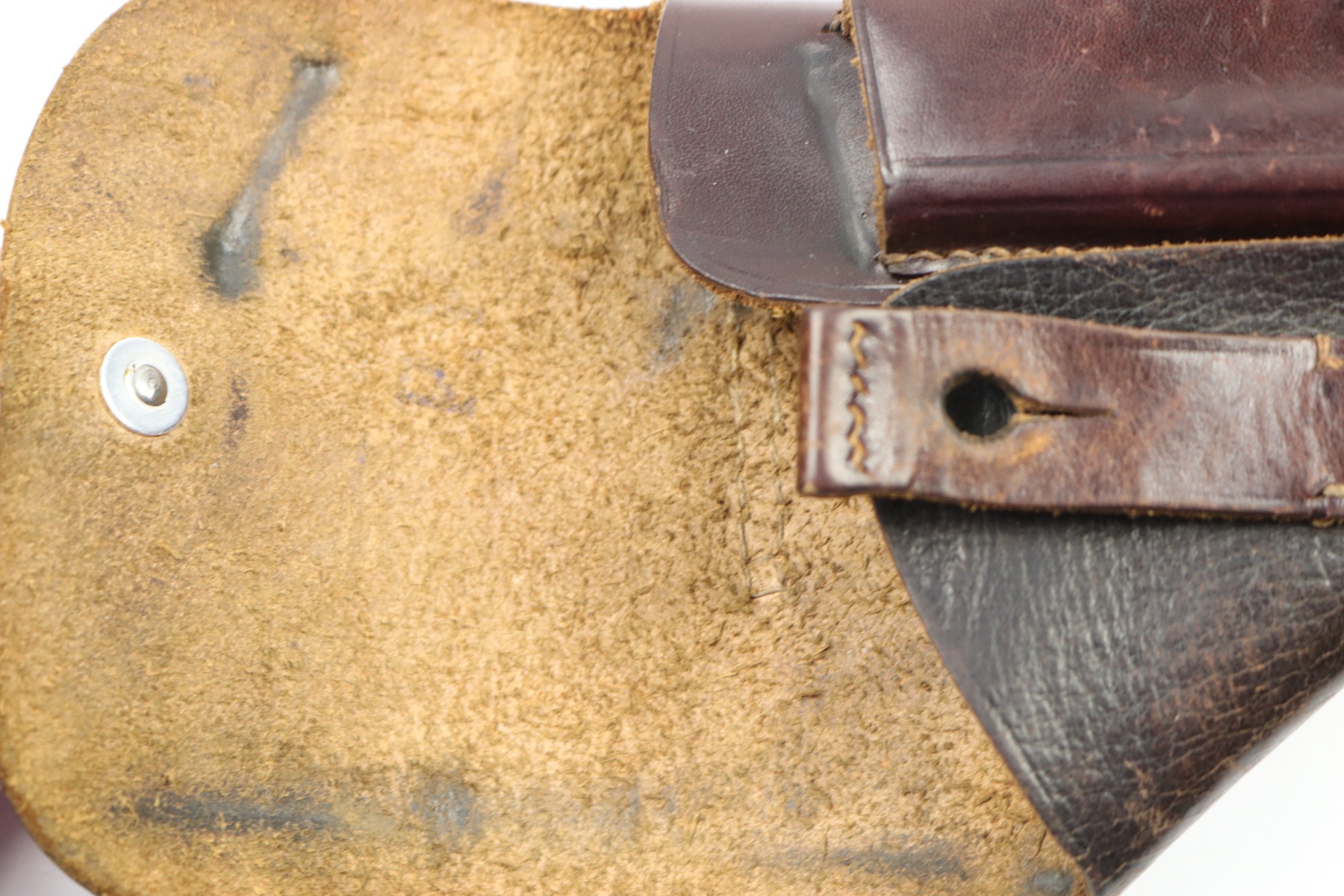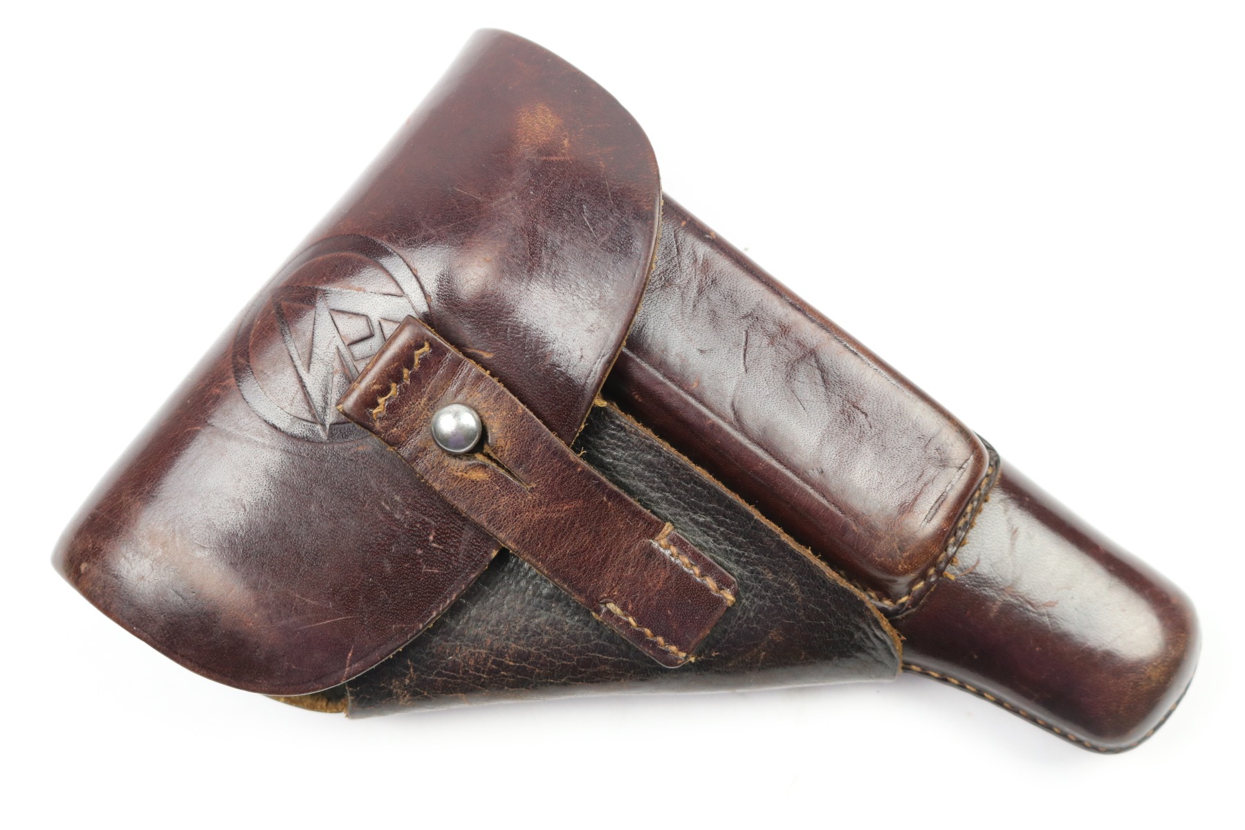 7/18/18 – This is an original AKAH Walther PP holster designated for Hitler’s SA. The front of the holster is SA stamped – this stamp is crisp and prominent. There is an AKAH DRGM maker stamp under the closure strap. This stamp is lightly faded – but still visible. The leather is reddish brown with some light fading in a few areas but no cracking or wrinkling. The interior leather has some dark spots from holding a PP pistol. The leather is pliable and soft but excellent. The stitching is all tight, original, and in tact. Guaranteed original.