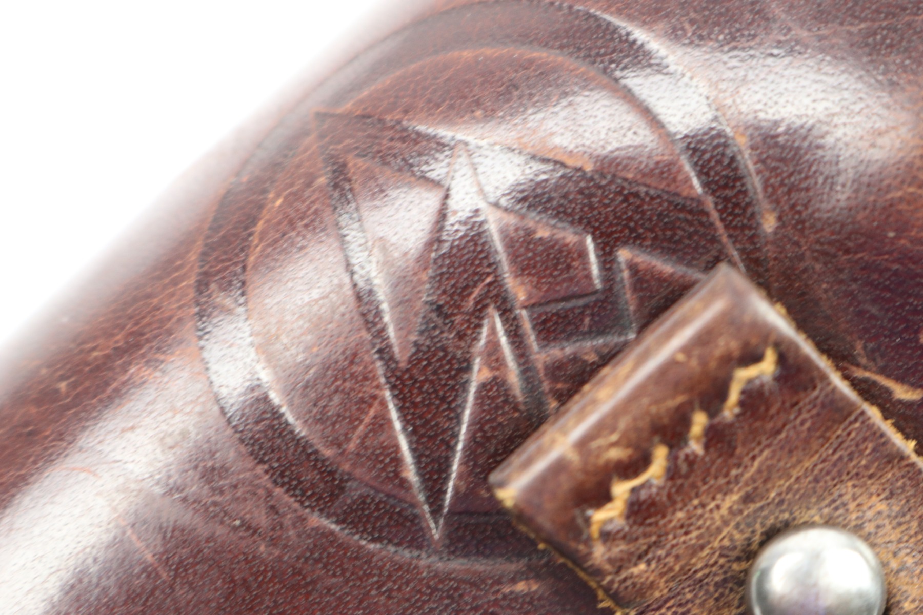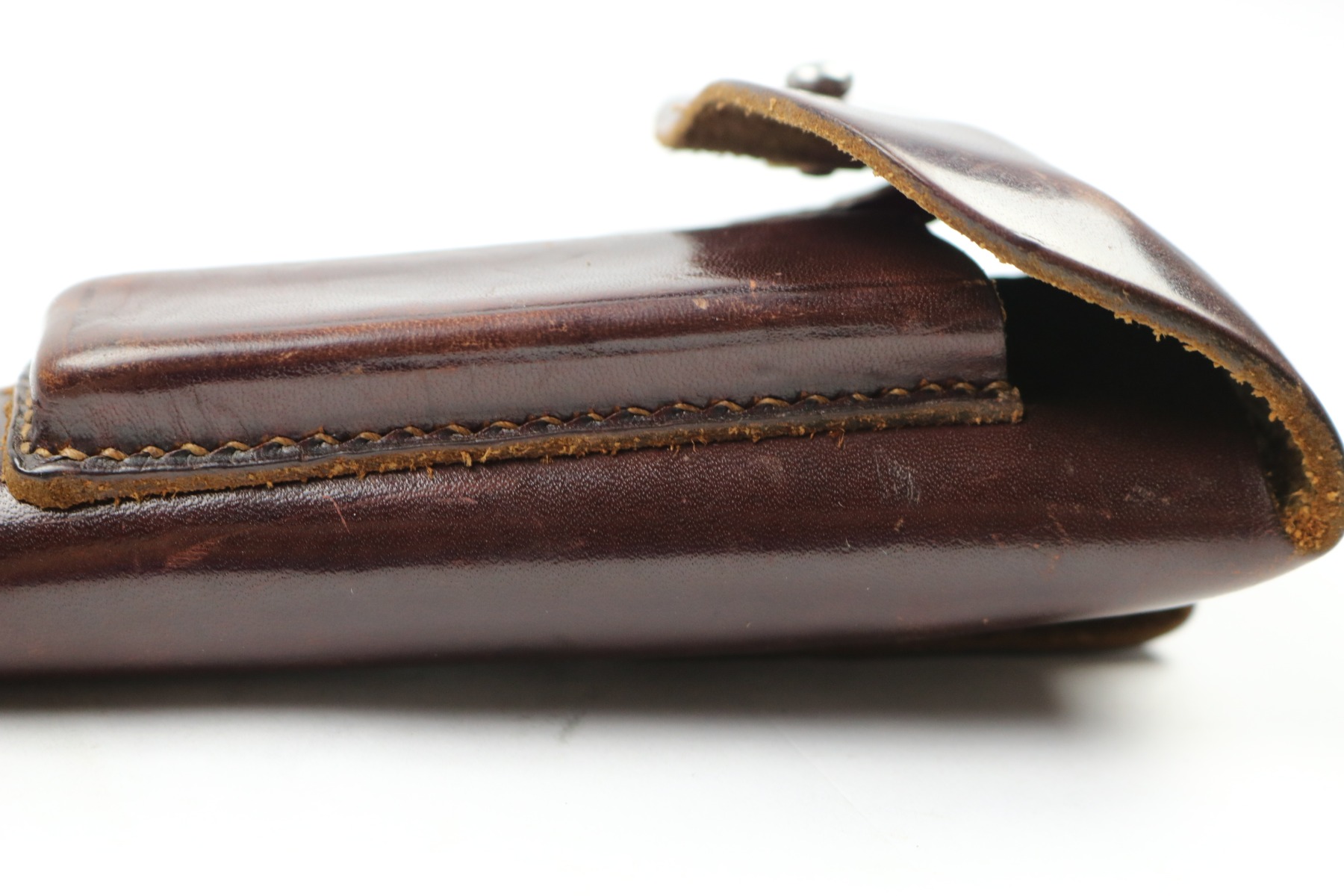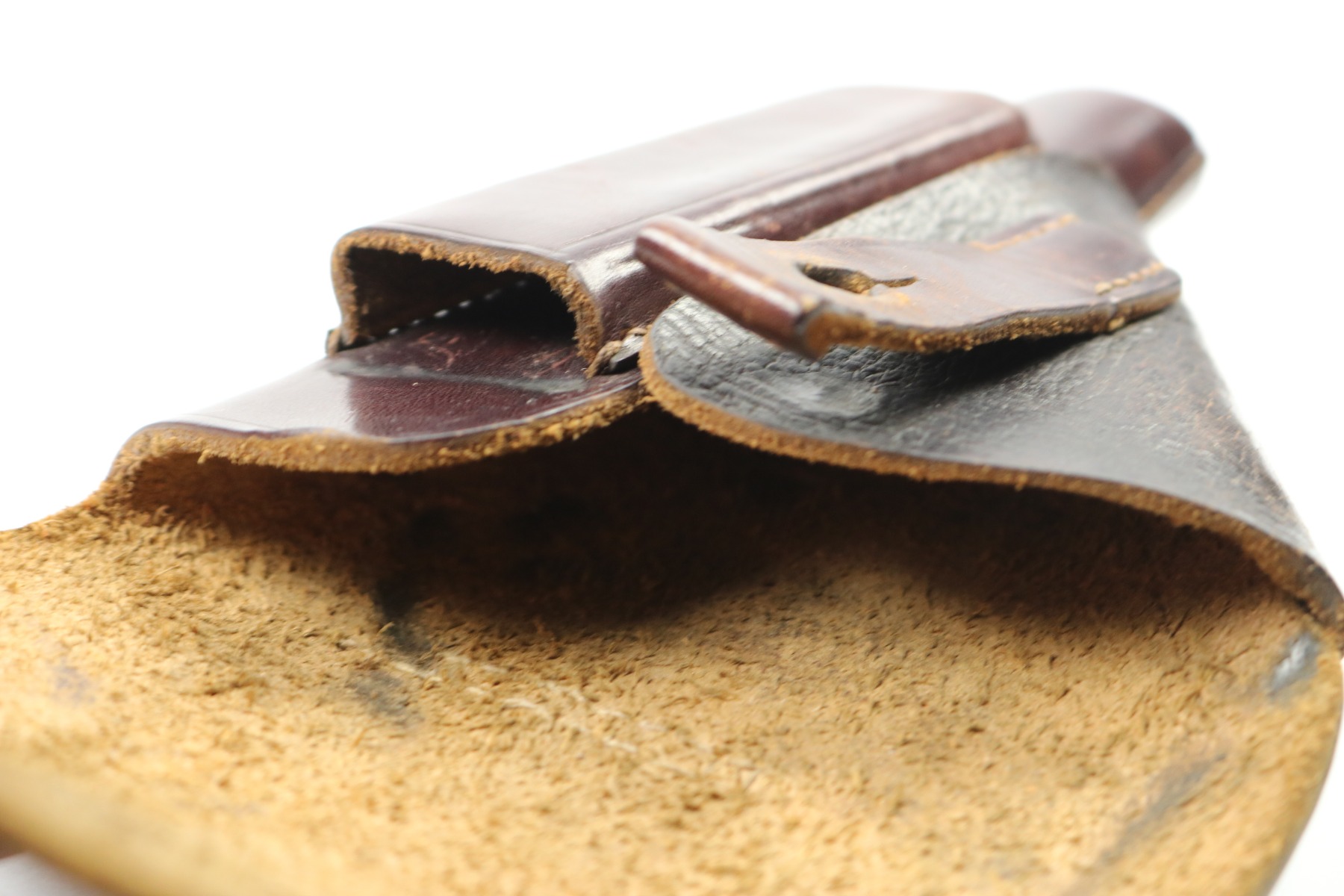 7/18/18 – This is an original AKAH Walther PP holster designated for Hitler’s SA. The front of the holster is SA stamped – this stamp is crisp and prominent. There is an AKAH DRGM maker stamp under the closure strap. This stamp is lightly faded – but still visible. The leather is reddish brown with some light fading in a few areas but no cracking or wrinkling. The interior leather has some dark spots from holding a PP pistol. The leather is pliable and soft but excellent. The stitching is all tight, original, and in tact. Guaranteed original.