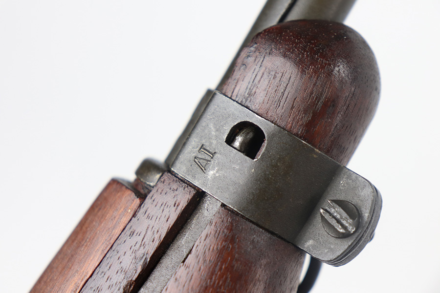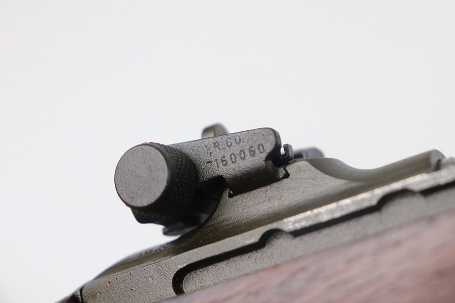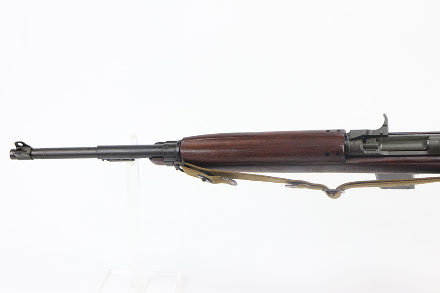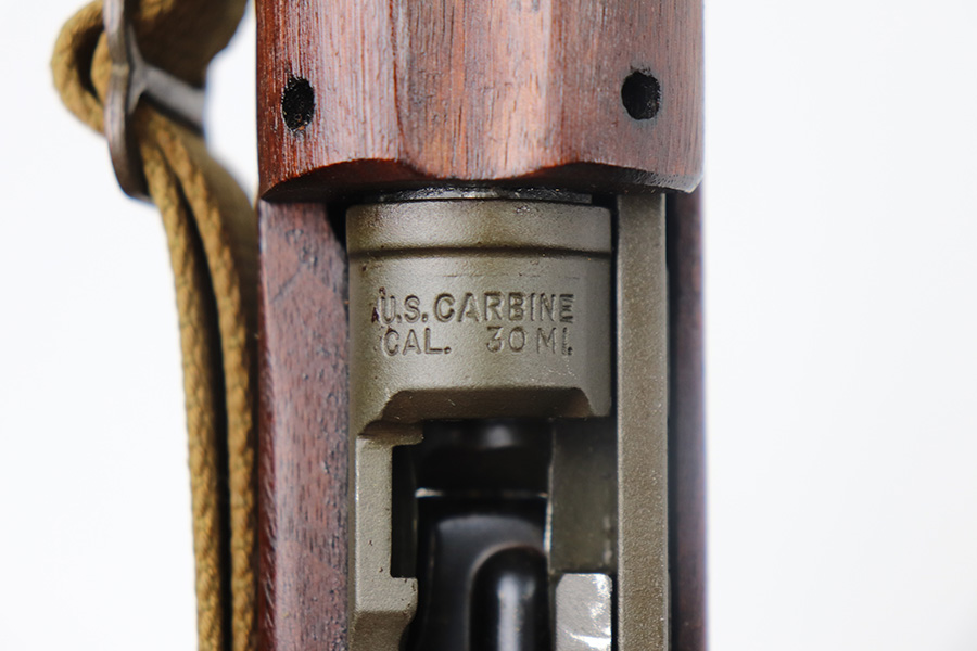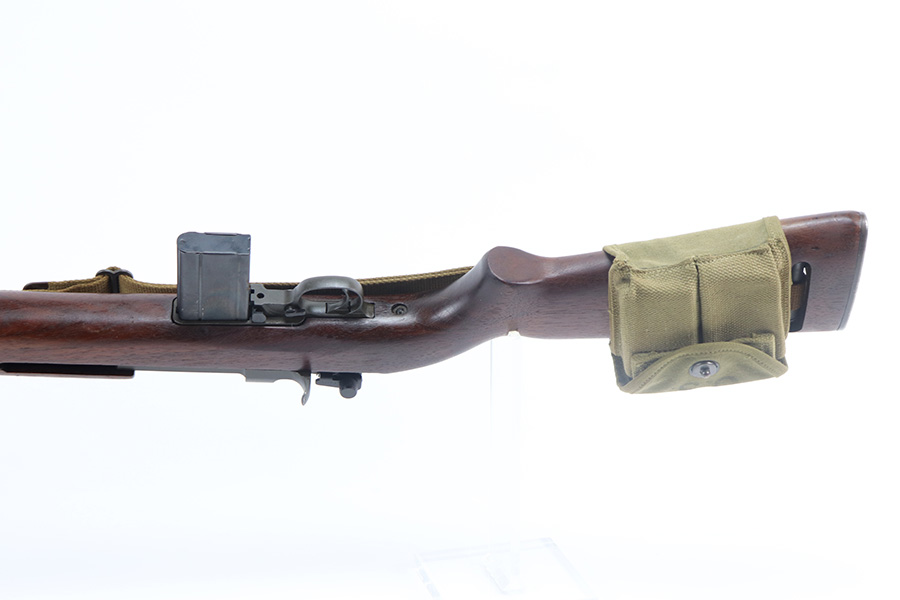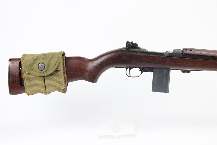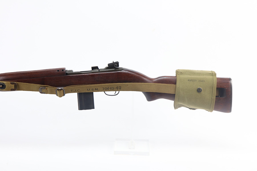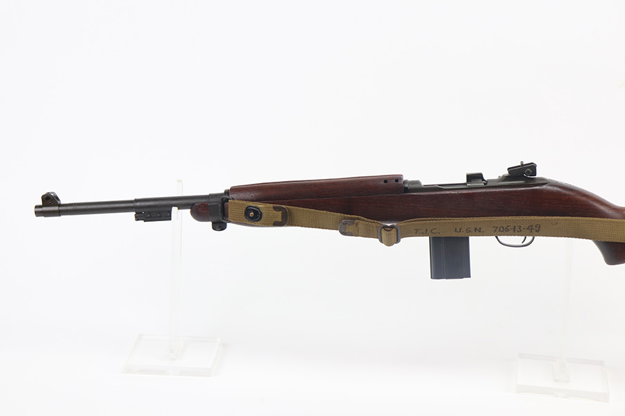 5/27/21 – This is an excellent example of a Saginaw M1 Carbine issued to the US military around 1944. It has a bayonet lug and adjustable rear sight, likely added for the Korean war. It comes with a two period-correct magazines, a 1943-dated magazine pouch, and a correct sling marked “USN”. The gun has retained almost all of its finish with spotty oxidation here and there. The stock is excellent. Below is a complete parts list with their markings. Mint bore.