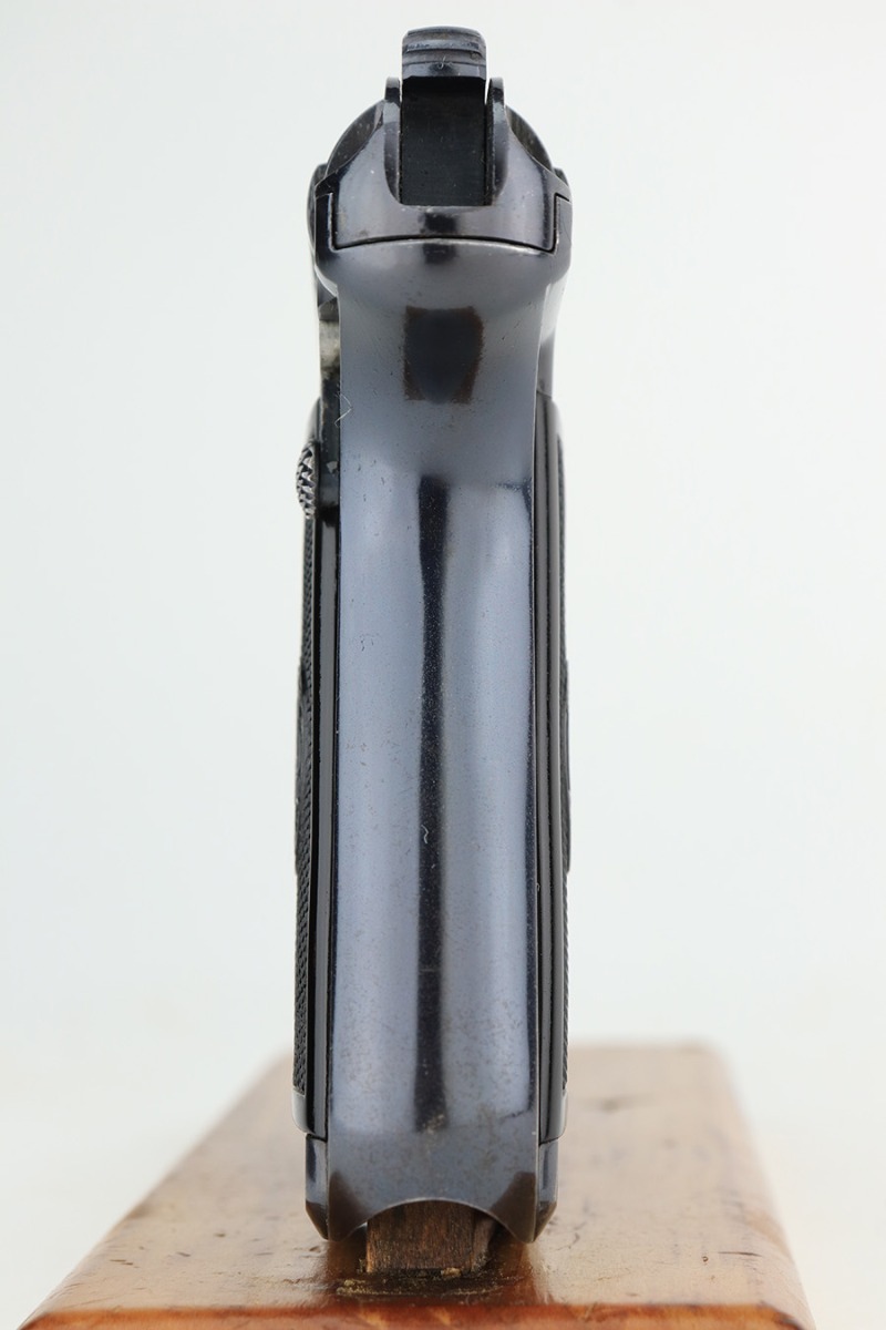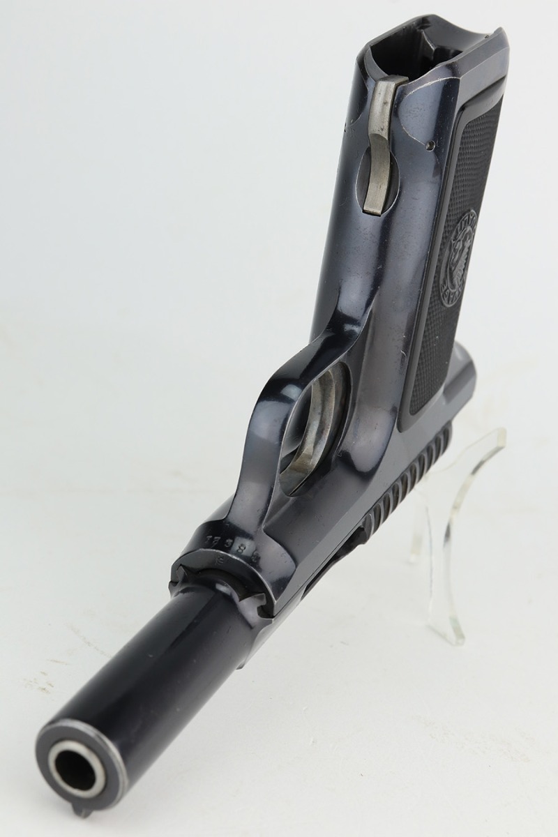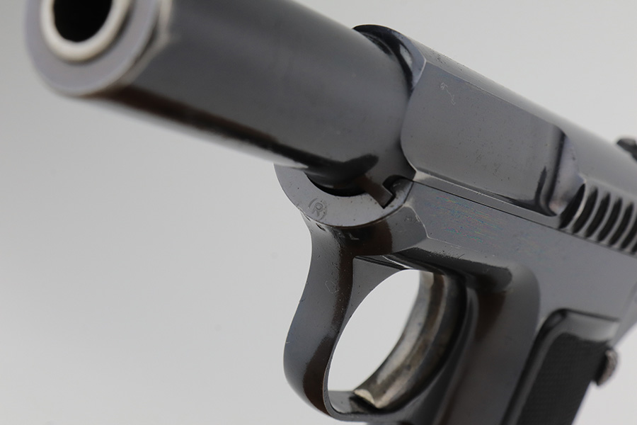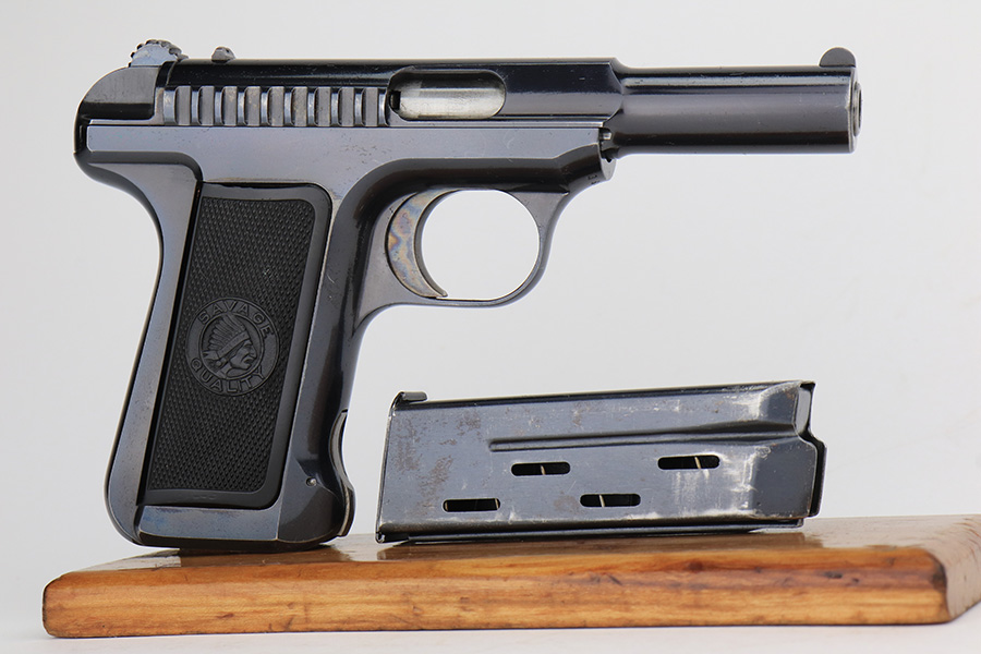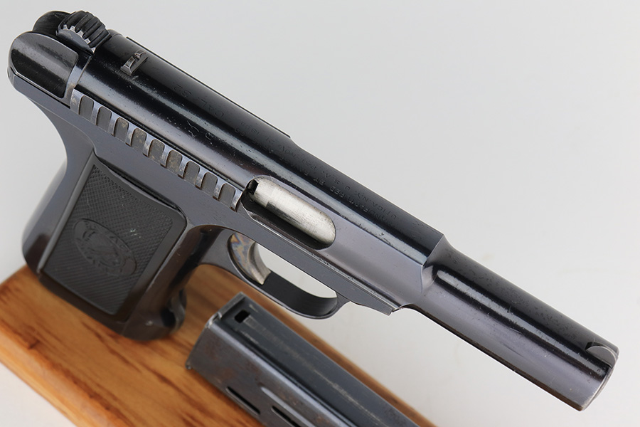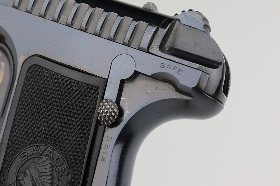 2/1/23 – This is an excellent example of a Savage Model 1907 manufactured in 1911 and chambered in .32 ACP. It has retained about 98% of its original high polish bluing with excellent case-hardening on the trigger. Just very minor wear around the muzzle and on some of the high edges. Just a hint of pin-pricking on the grip straps. Fitted with excellent period-correct black bakelite grips and comes with one proper magazine. Minty bore.