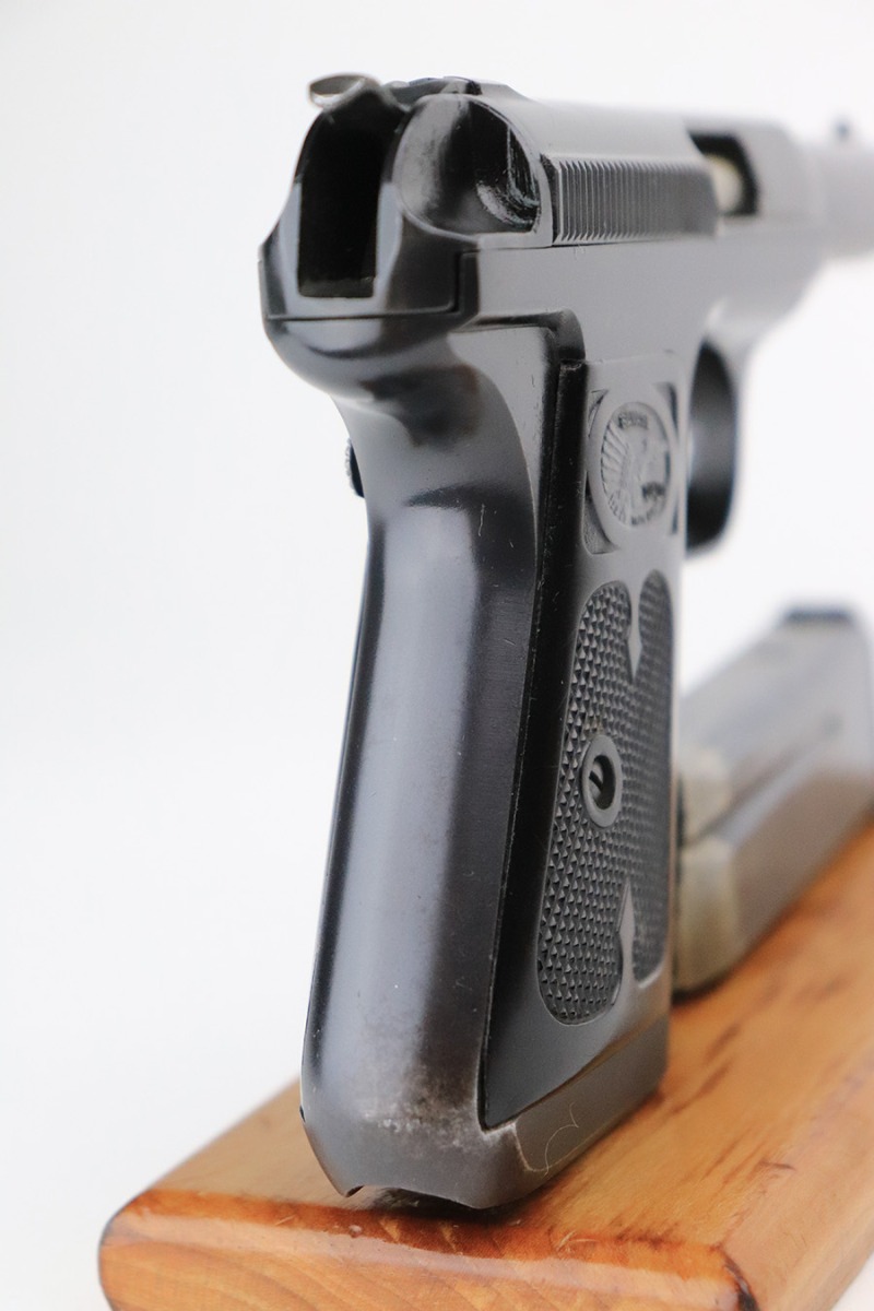 6/9/22 – This is an excellent example of a Savage Model 1917 manufactured in 1922-26 and chambered in .32 ACP. It has retained about 97% of its original finish. Most of the finish loss is around the muzzle, but there is very minor wear at the front edge of the frame and one small spot on the front. Nice case-hardening on the trigger. Comes with excellent black plastic grips and one proper magazine. Very nice bore with great rifling.