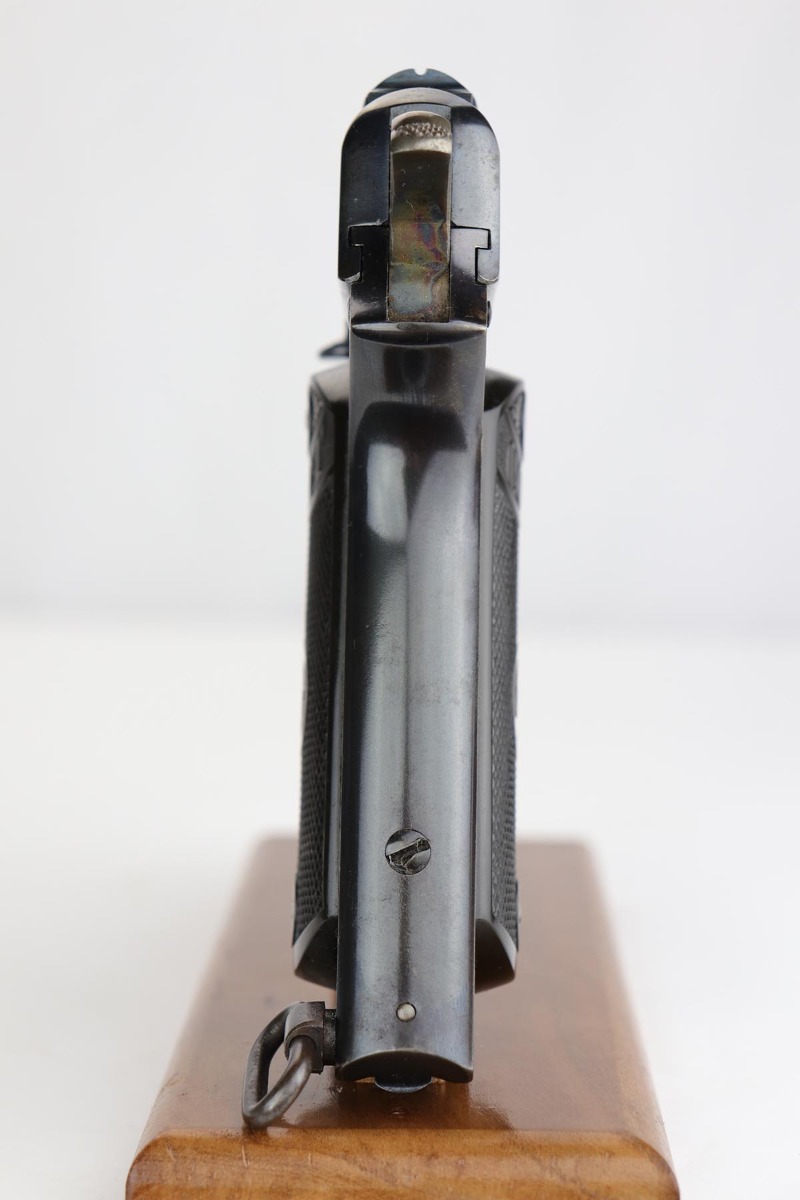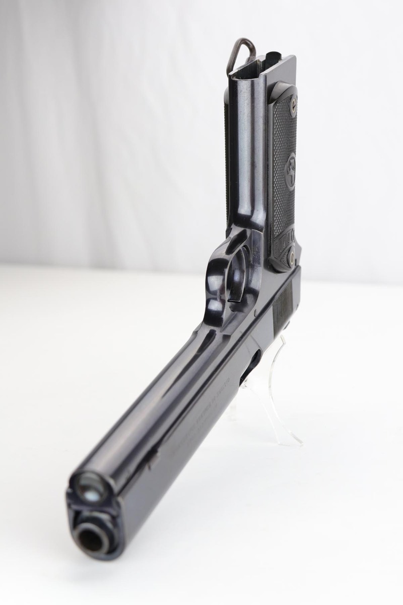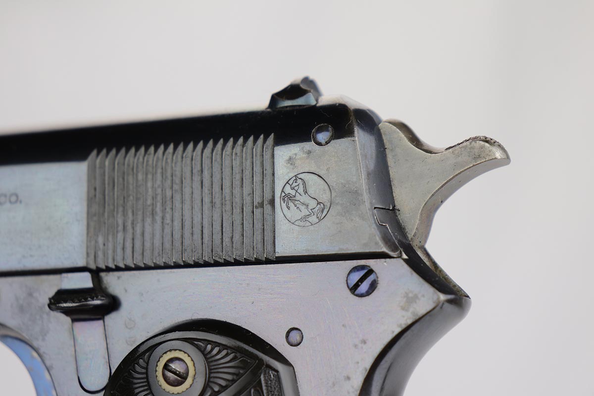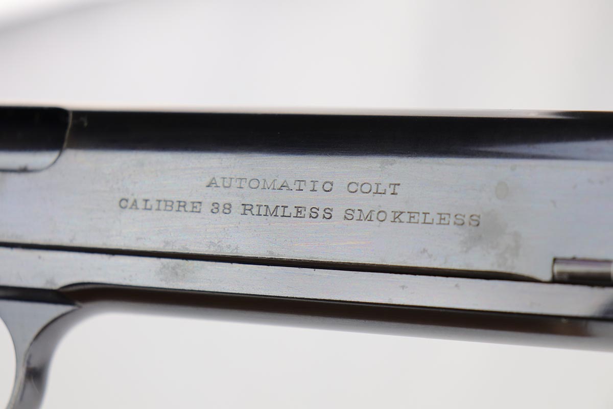 5/22/20 – This is an excellent example of the desirable Colt Model 1902 pistol, that was manufactured in 1909 for issue to the US military. There were only ~18,000 of this model produced, all between 1902 and 1928. The military model can be distinguished by the rectangular shape to the frame, swivel lanyard loop on frame, and the additional cartridge capacity in their magazines. This model was chambered for .38 ACP, and is very similar in design to the innovative M1900. This particular example has nice case hardening on the hammer and excellent fire blue on the trigger, and retains about 95-96% of the original, high-polish blue. There is minimal actual finish loss on the gun, but the left side of the slide appears to have gotten exposed to a little moisture, and as a result, there is an obvious area of freckling that is mostly smooth to the touch. Excellent, original grips. Terrific bore.