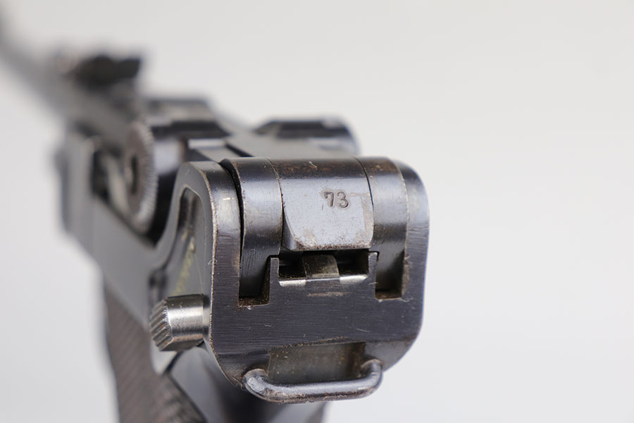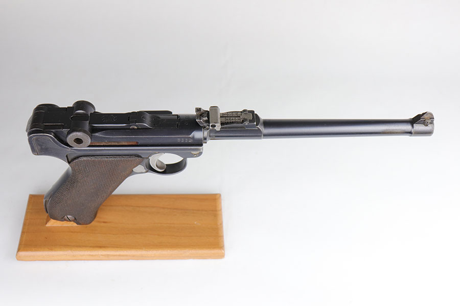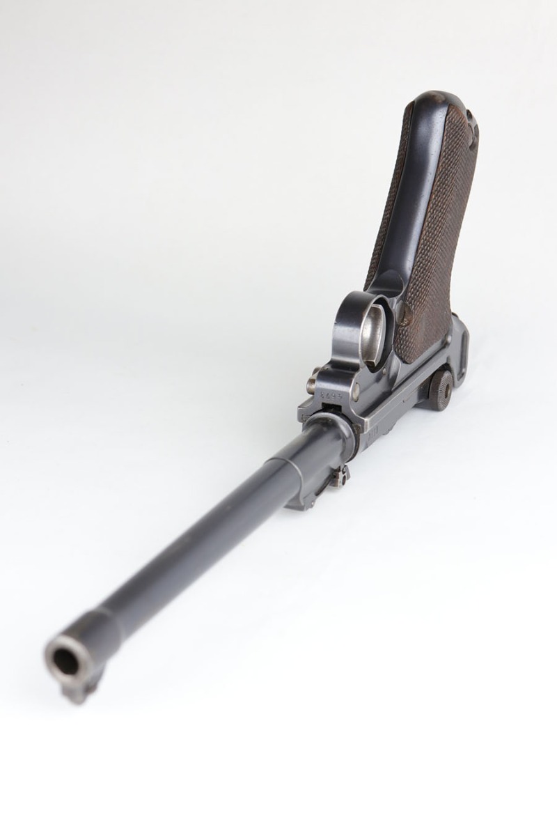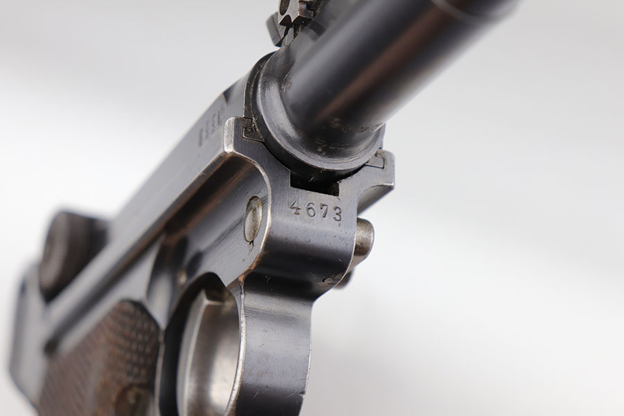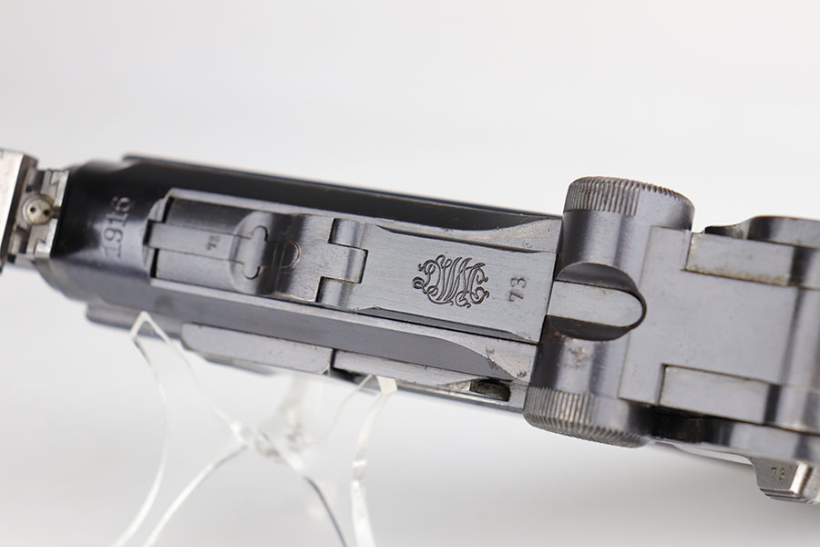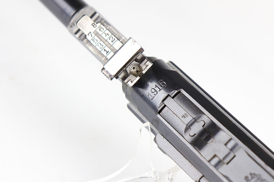 5/19/20 – This is an all matching and original DWM Artillery Luger that was made in 1916, one of only ~20,000 produced that year. Compared to the 90,000 of 1917, this production total is fairly low. It has about 96-97% blue remaining with standard high edge wear on muzzle, sideplate and right side rail. Also a hint of edge wear on the trigger guard, and a spot of finish loss on the bottom of the front strap. The original, matching grips are present, but the magazine is mismatched. The small parts show little to none of the original straw. Bore is shiny with strong rifling and just a bit of general frost.