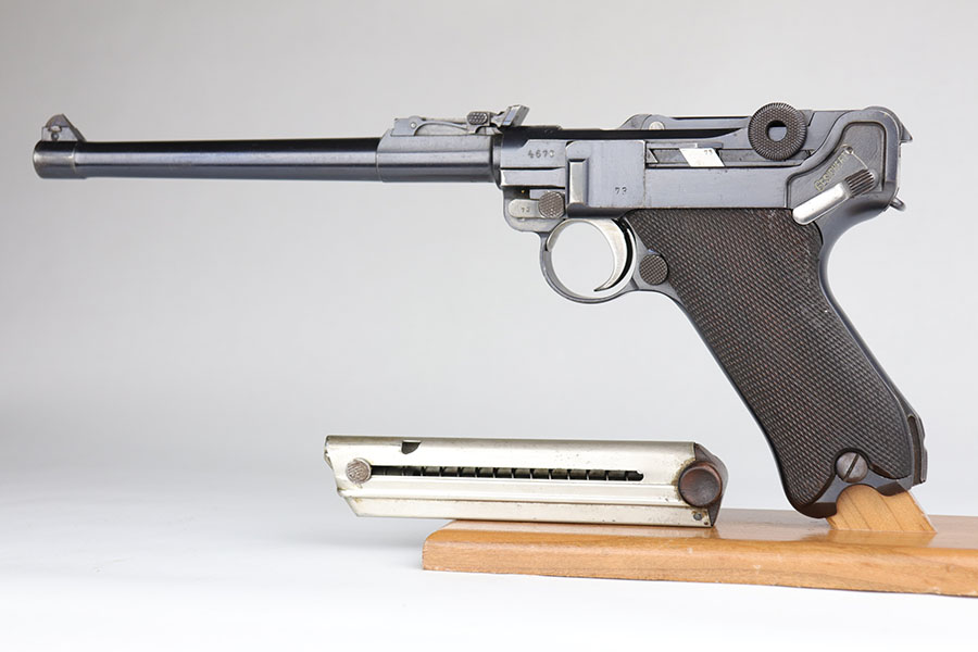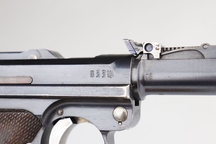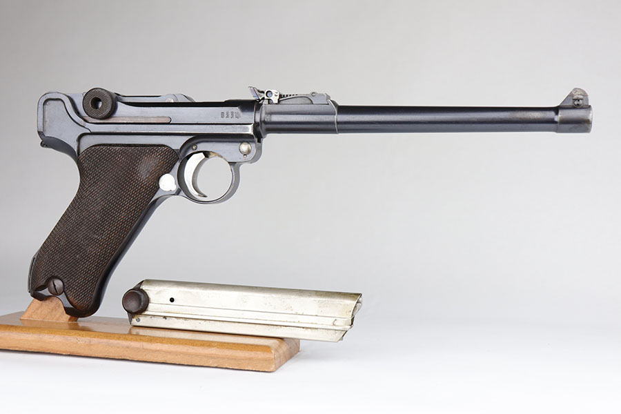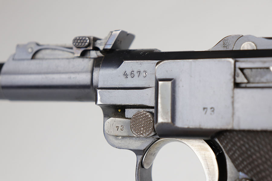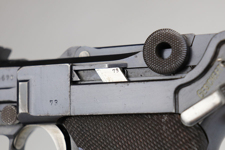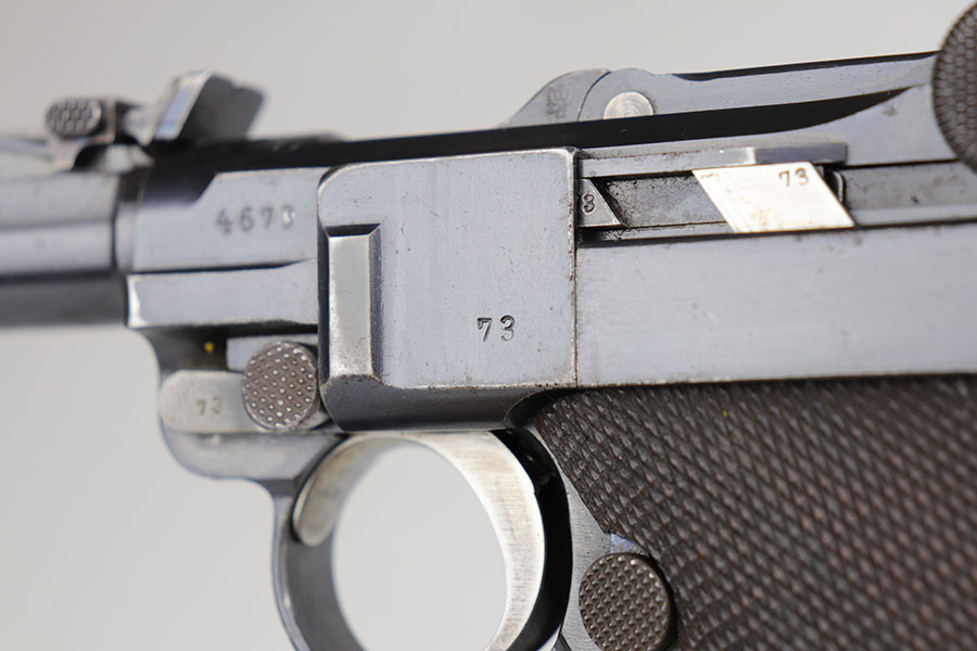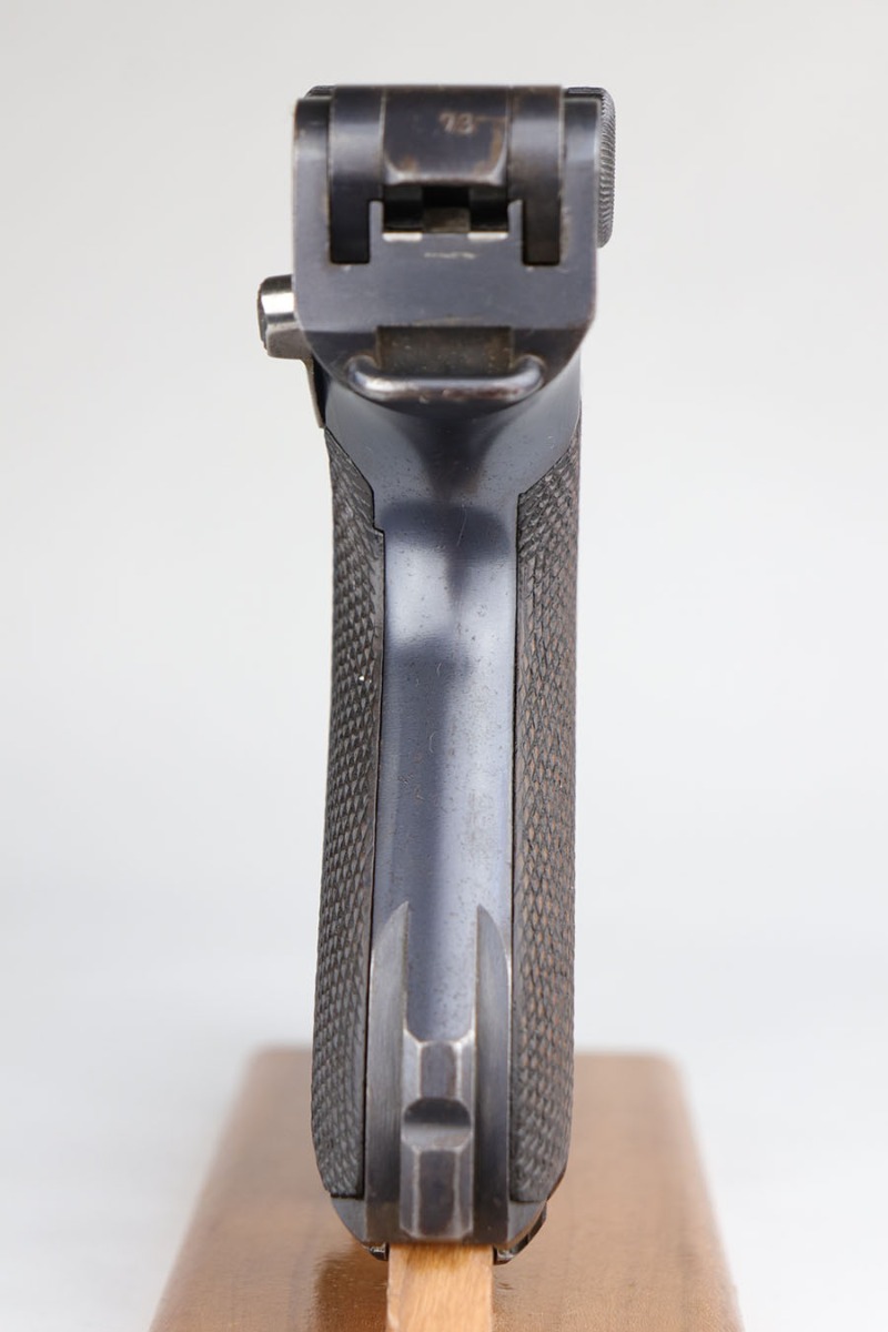 5/19/20 – This is an all matching and original DWM Artillery Luger that was made in 1916, one of only ~20,000 produced that year. Compared to the 90,000 of 1917, this production total is fairly low. It has about 96-97% blue remaining with standard high edge wear on muzzle, sideplate and right side rail. Also a hint of edge wear on the trigger guard, and a spot of finish loss on the bottom of the front strap. The original, matching grips are present, but the magazine is mismatched. The small parts show little to none of the original straw. Bore is shiny with strong rifling and just a bit of general frost.