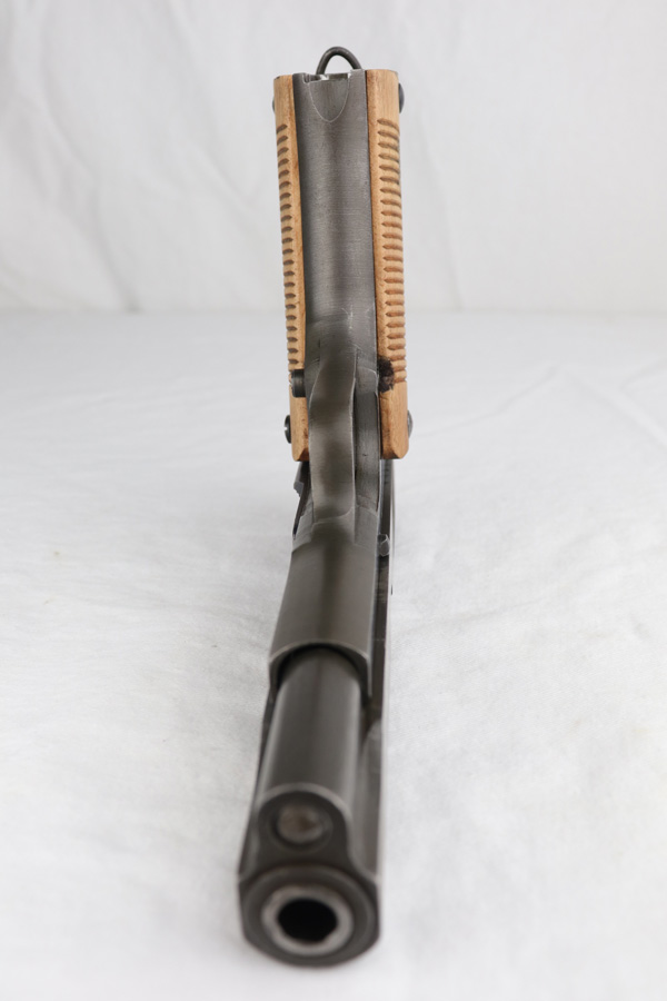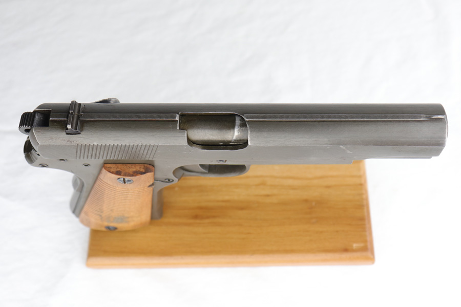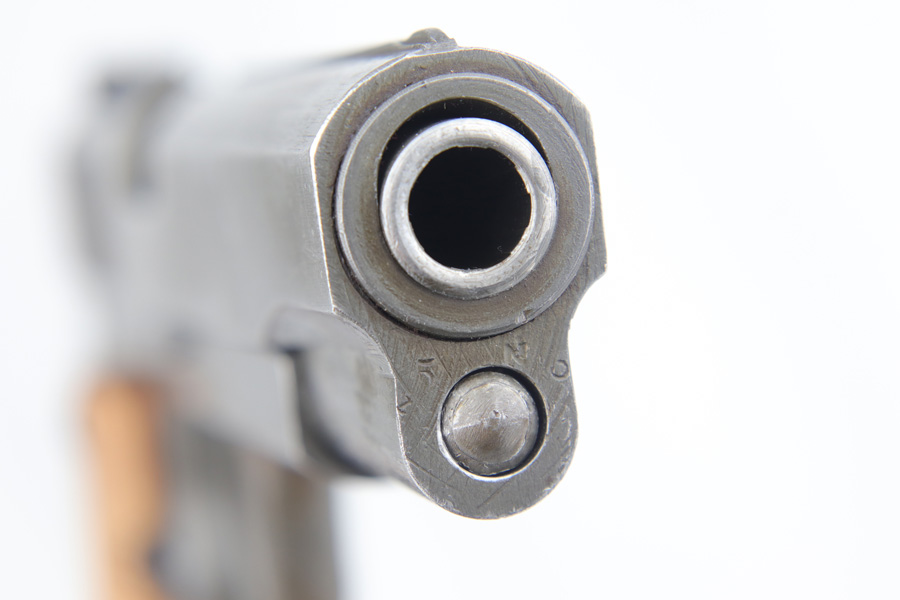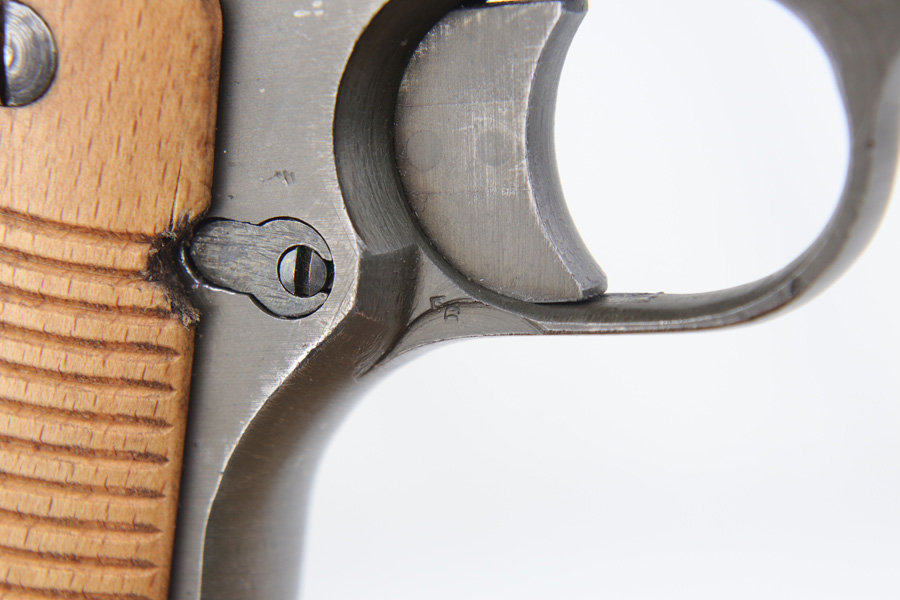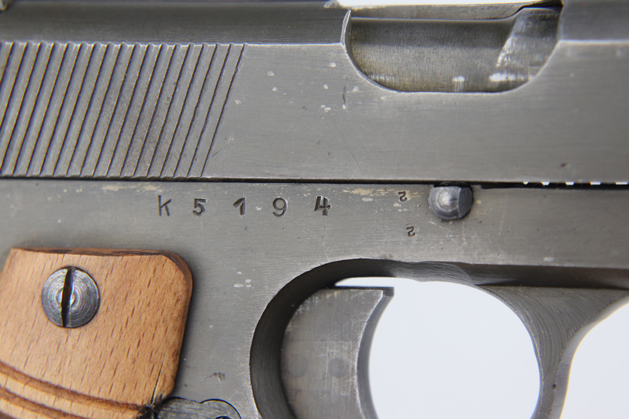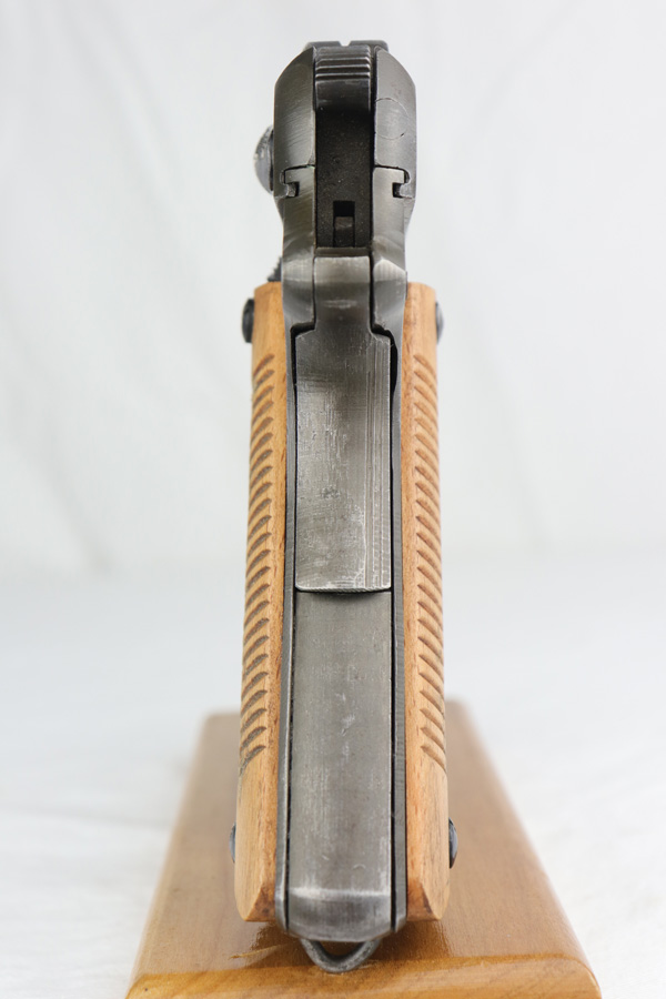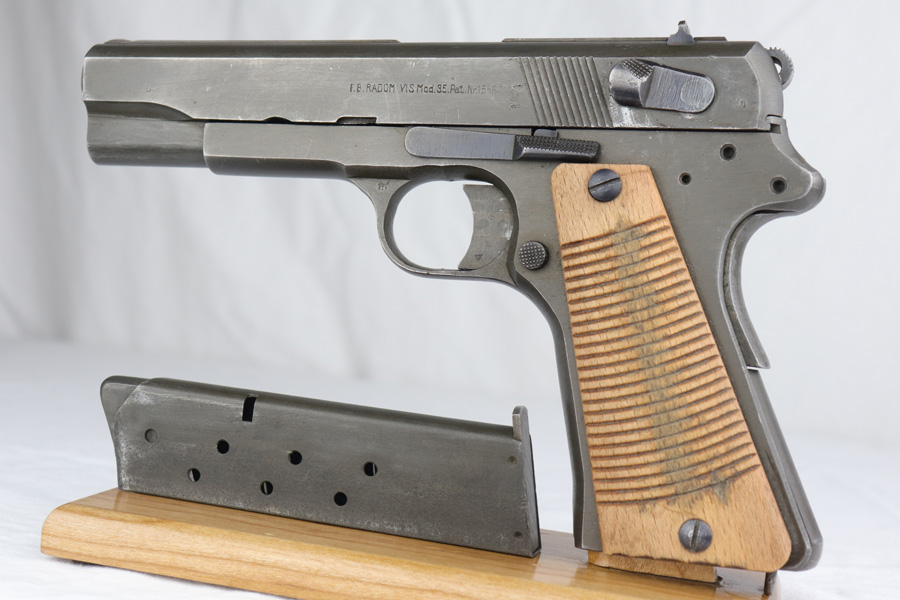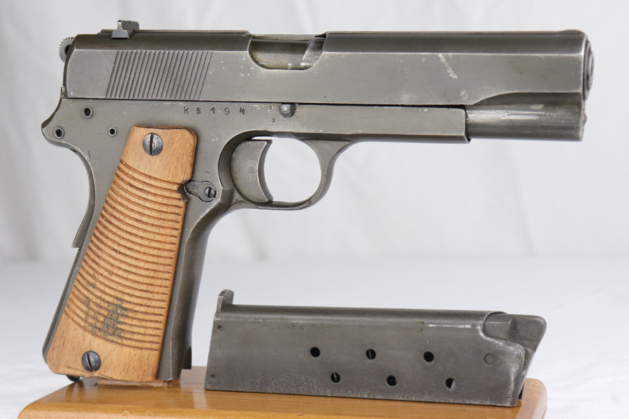12/20/18 – This is an increasingly hard-to-find Steyr produced Radom with late-war phosphate finish. There were only ~22,000 of these produced! This pistol is all correct, matching and original with some blued small parts. The phosphate finish is largely in excellent condition with minor edge rub wear, and an area of finish loss on the right side slide. Late-war wooden grips and the magazine is E/623 marked. Bore is minty, looks like it has barely been used.