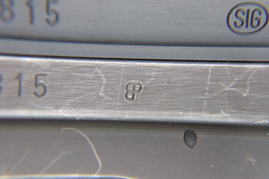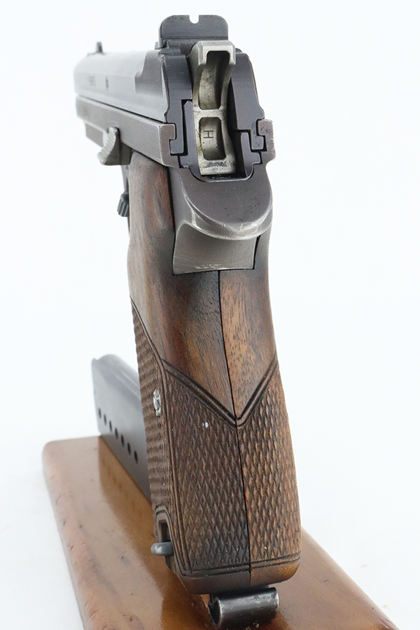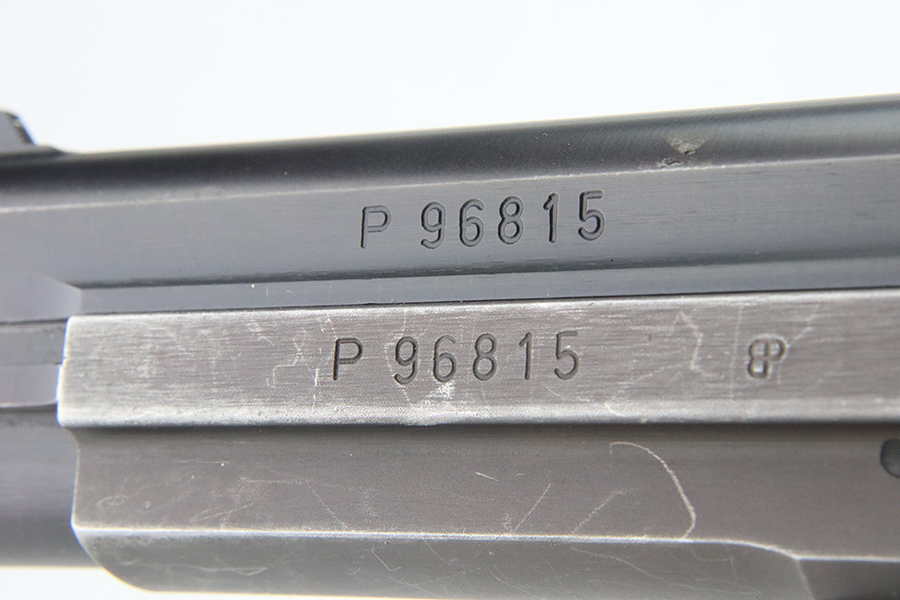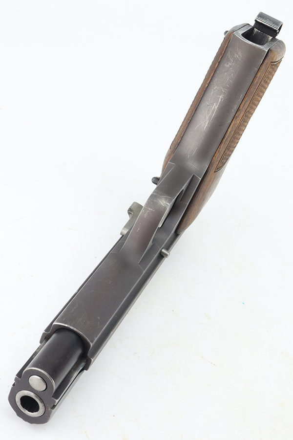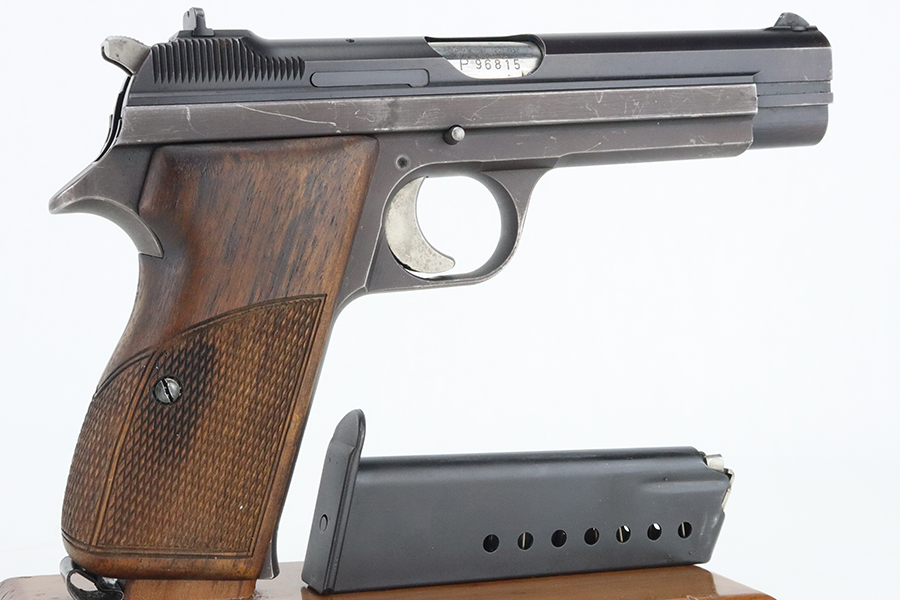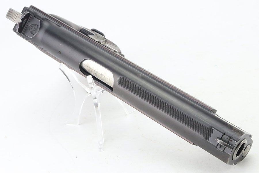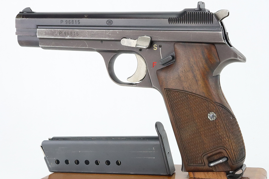 4/9/24 – This is an excellent example of a Sig P210-1 pistol made in Switzerland in the 1970’s. It has a “P” serial prefix, indicating this gun was sold in the private / commercial market. The gun is all matching with a “Swiss Cross” on the top of the slide. The gun has retained about 94% of its original finish with general high edge wear, a few small spots of oxidation, very minor thinning on the front strap, and a few light surface scuffs here and there. Fitted with excellent wood grips and comes with one proper magazine. Minty bore.