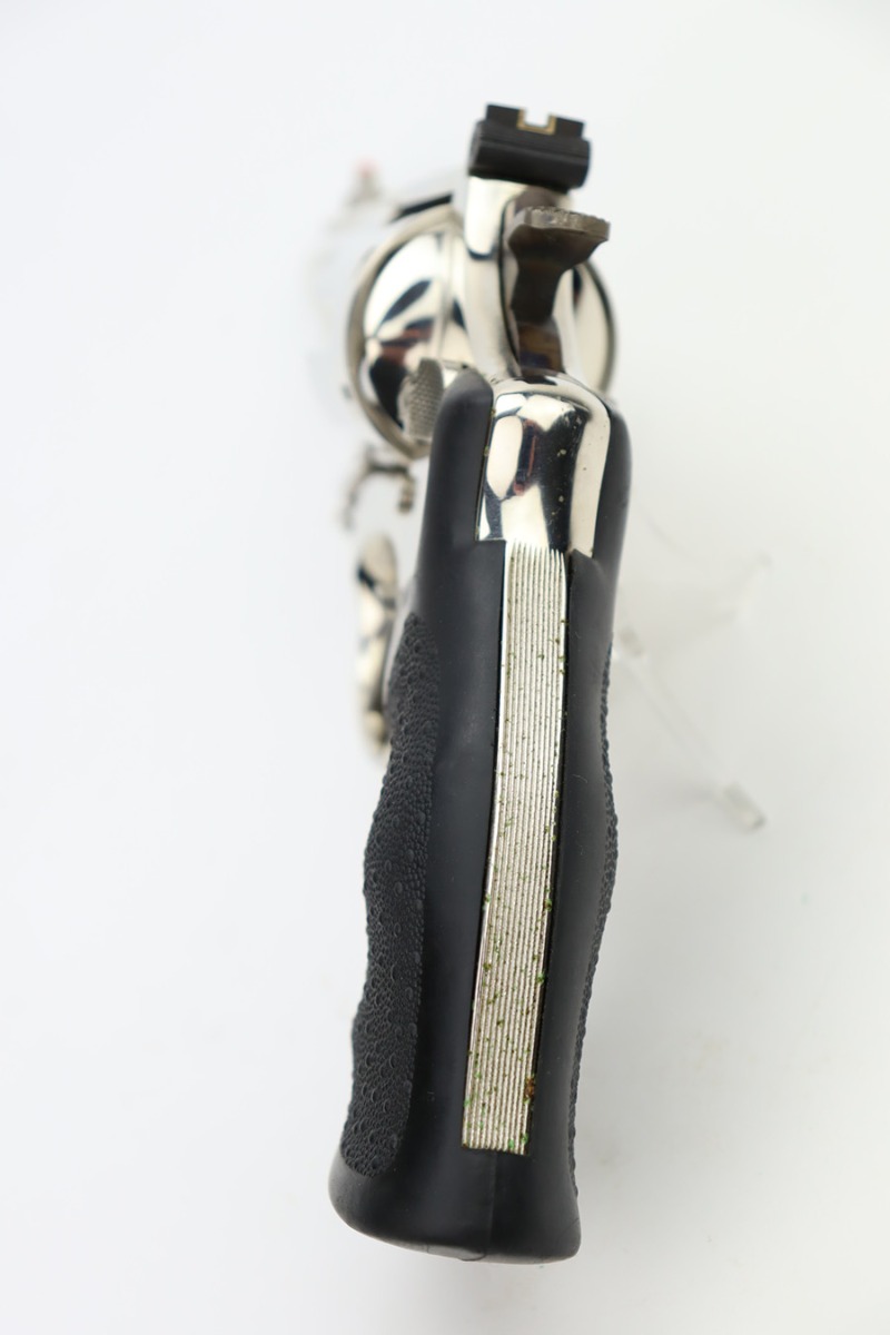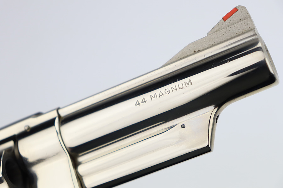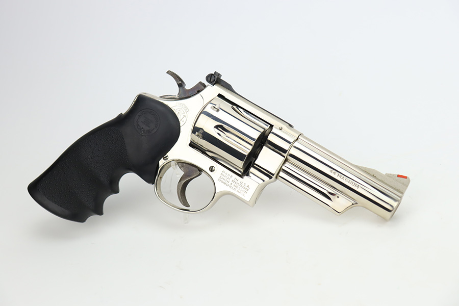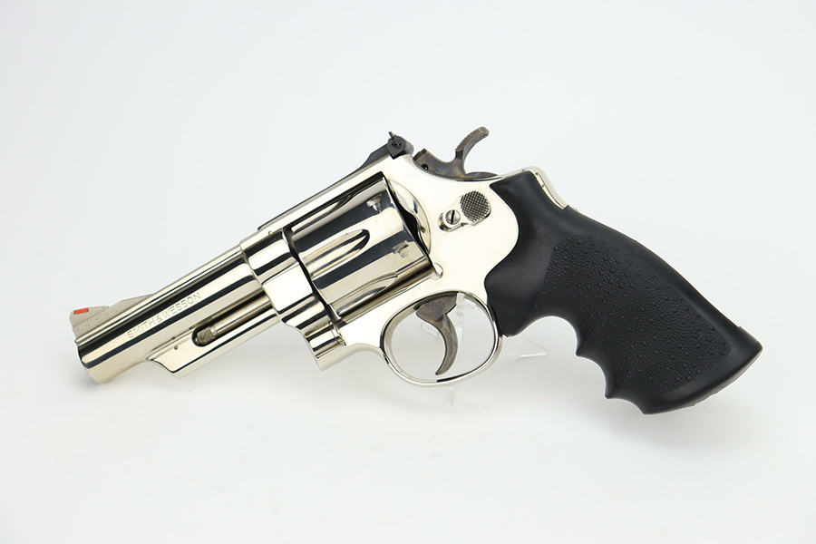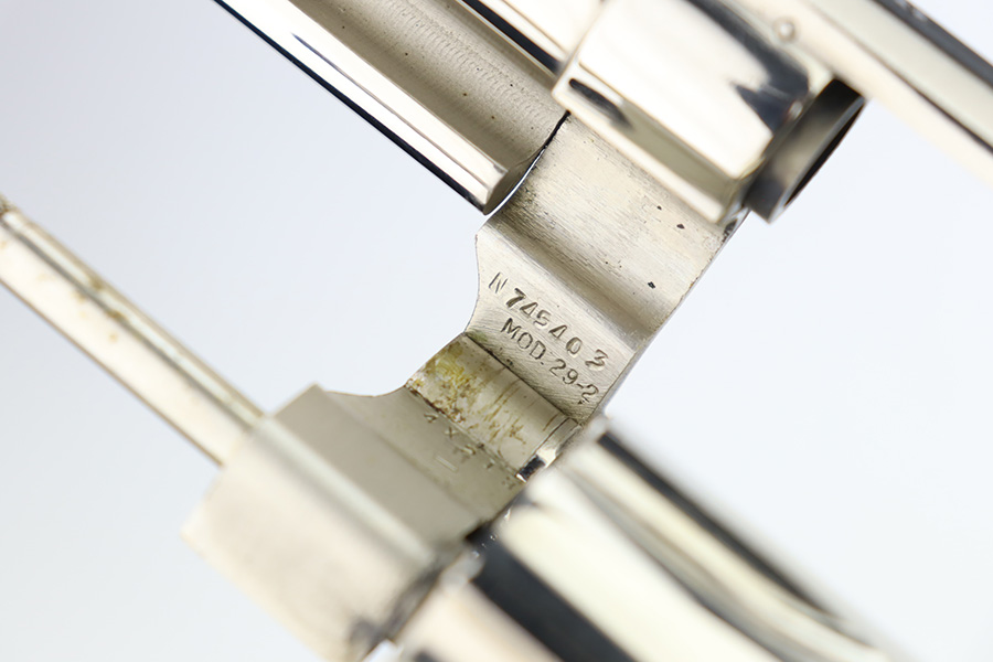 12/4/23 – This is an excellent Smith & Wesson Model 29-2 revolver from 1980. Factory nickel finish with light muzzle wear and turn line on cylinder. 4in barrel with minty bore. Some oxidation along the top of the frame and barrel. Hogue rubber grips. Good mechanics.