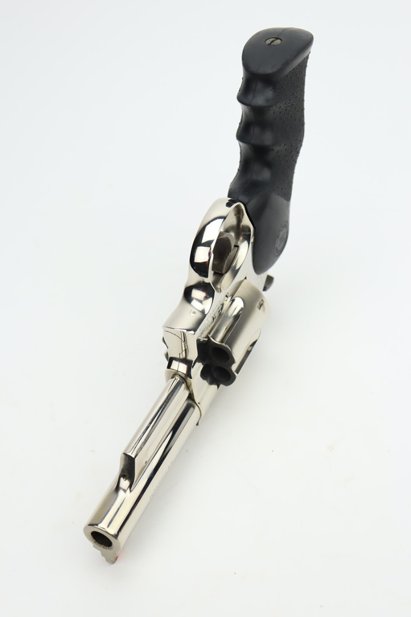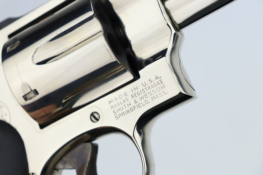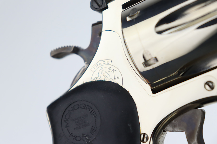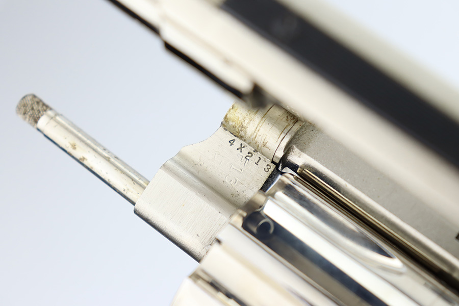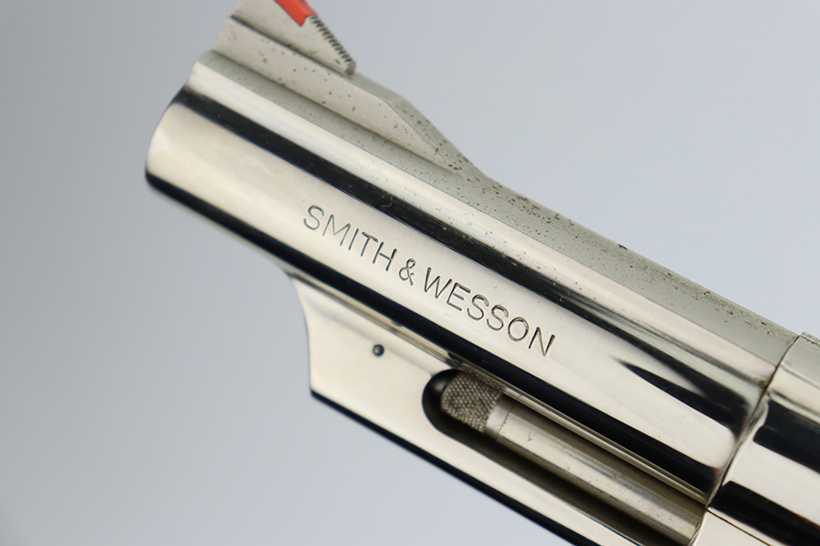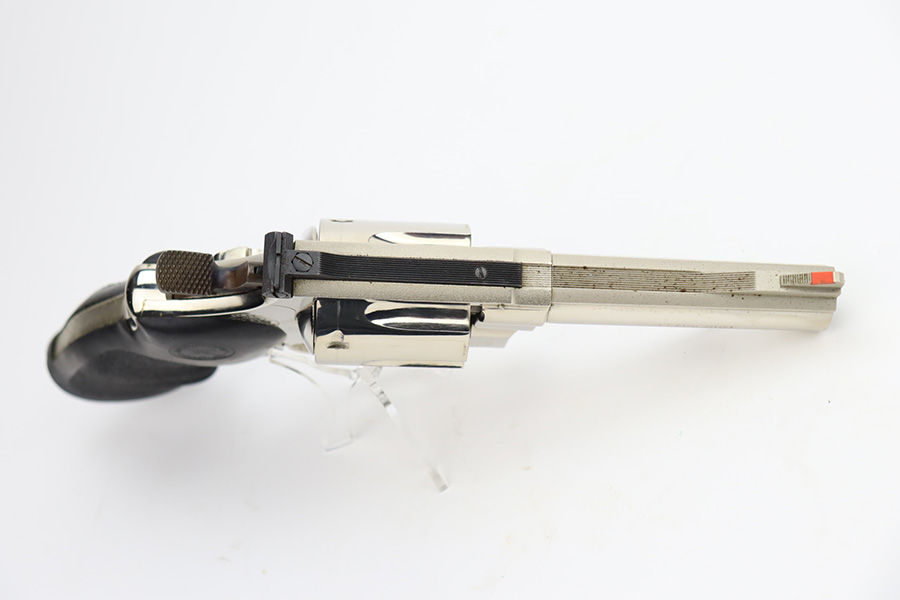 12/4/23 – This is an excellent Smith & Wesson Model 29-2 revolver from 1980. Factory nickel finish with light muzzle wear and turn line on cylinder. 4in barrel with minty bore. Some oxidation along the top of the frame and barrel. Hogue rubber grips. Good mechanics.