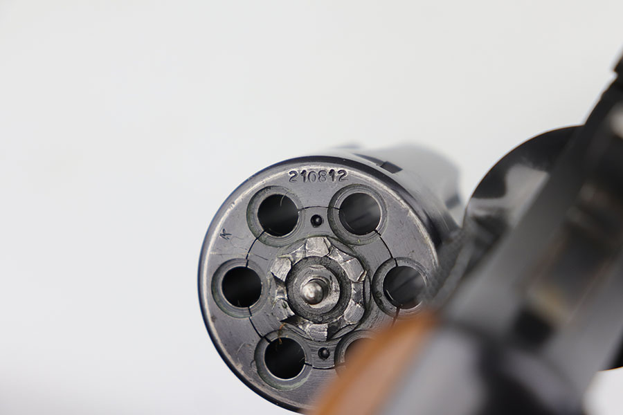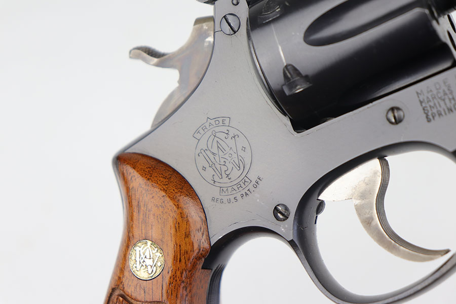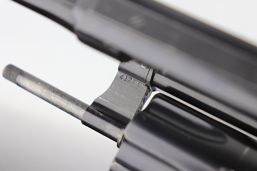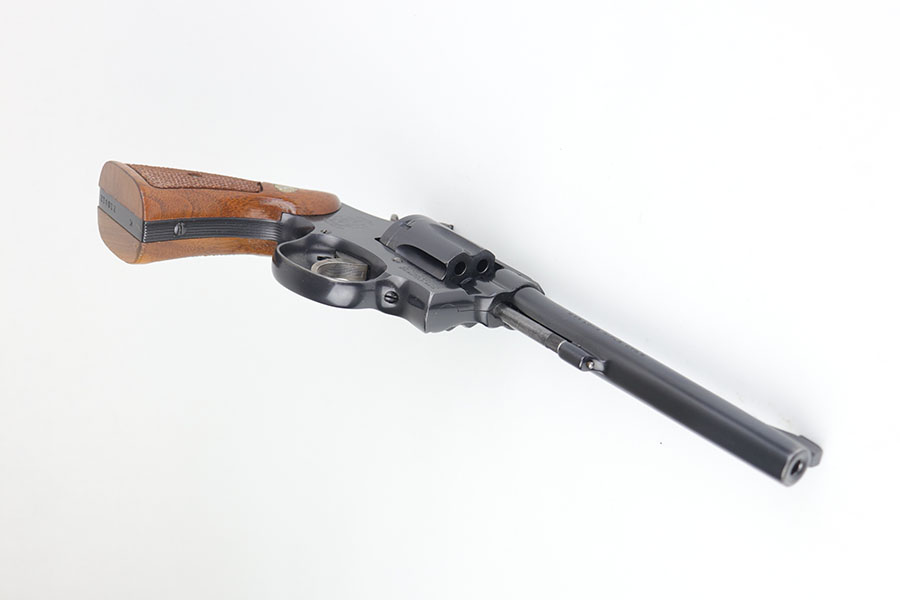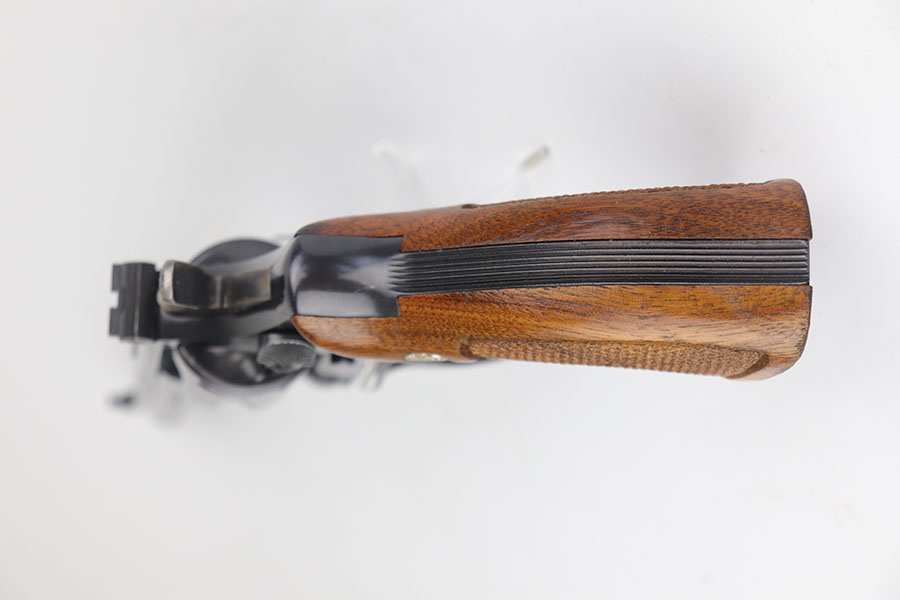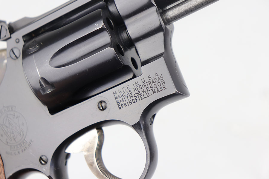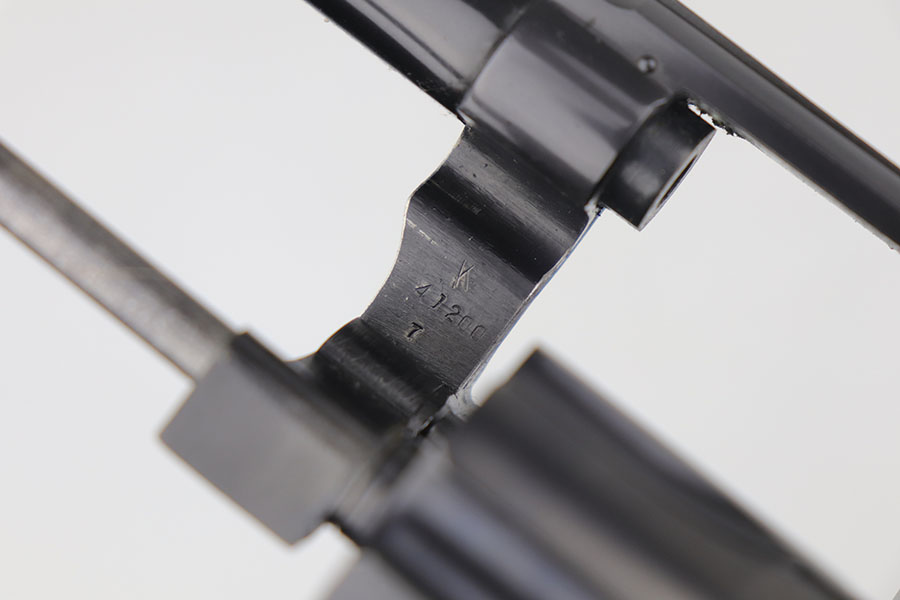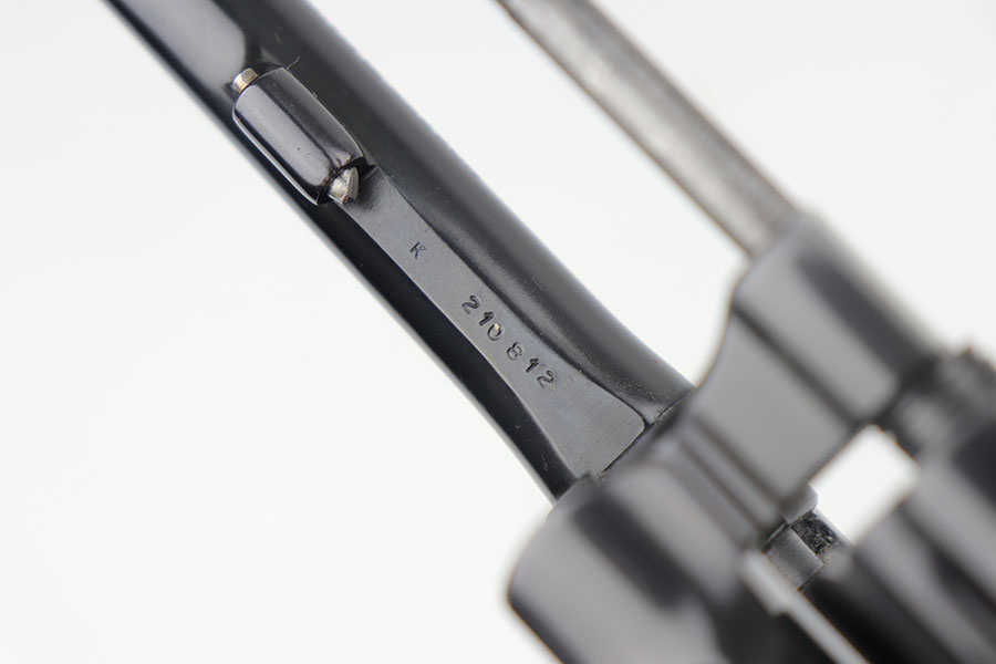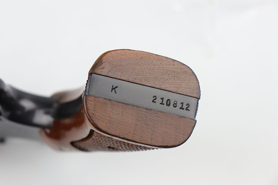 7/23/20 – This is an excellent Smith & Wesson K-22 revolver The serial dates the gun to 1953, and it’s got 95+% of the original blue remaining. There’s some finish loss on the left side of the barrel and the ejector rod, and a minor roll mark on the cylinder. Excellent grips that are correct for the gun and unmarked. Nice case hardening on hammer and trigger. Smooth mechanics. Mint bore.