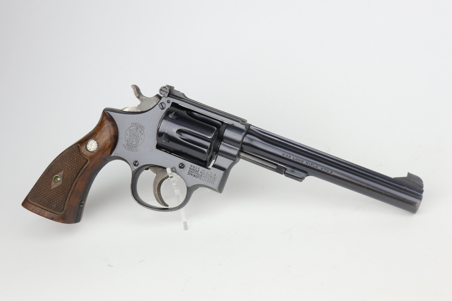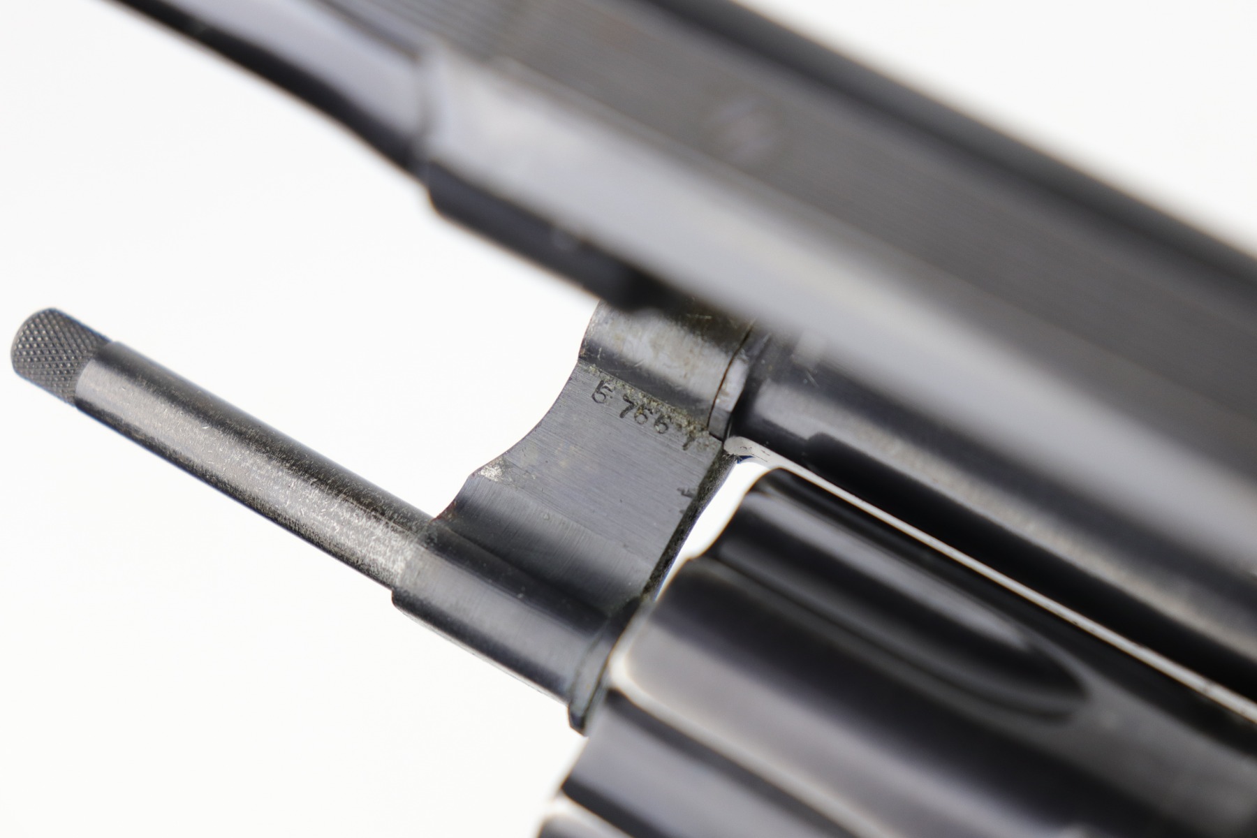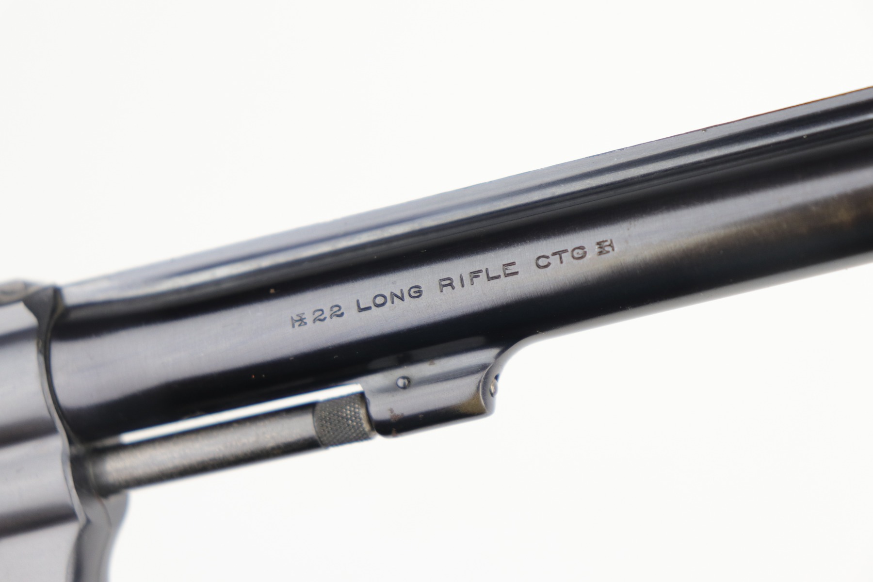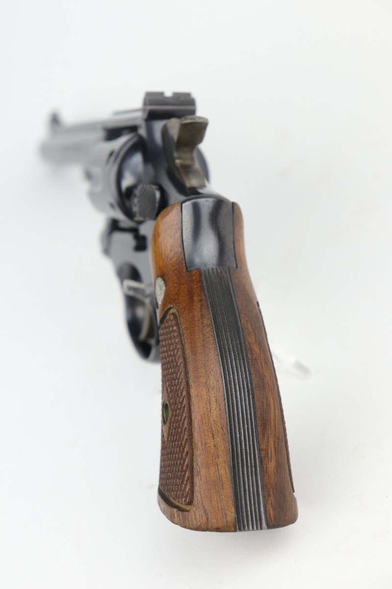 9/5/20 – This is an excellent example of a Smith & Wesson K-22 “K Frame” Revolver, chambered in .22 LR. From the serial number, it was made just after WW2, in 1948. This gun is fully functional and the action is smooth. The cylinder is tight. It has retained about 96-97% of its original bluing. There is very minor muzzle wear, and high edge wear here and there on the frame and cylinder. Very light roll mark on the cylinder. There are a few very light scratches on the frame just behind the hammer and on the underside of the frame near the trigger guard. Two very small dings on the butt. The bore is near-mint. Excellent S&W grips. 6″ barrel.