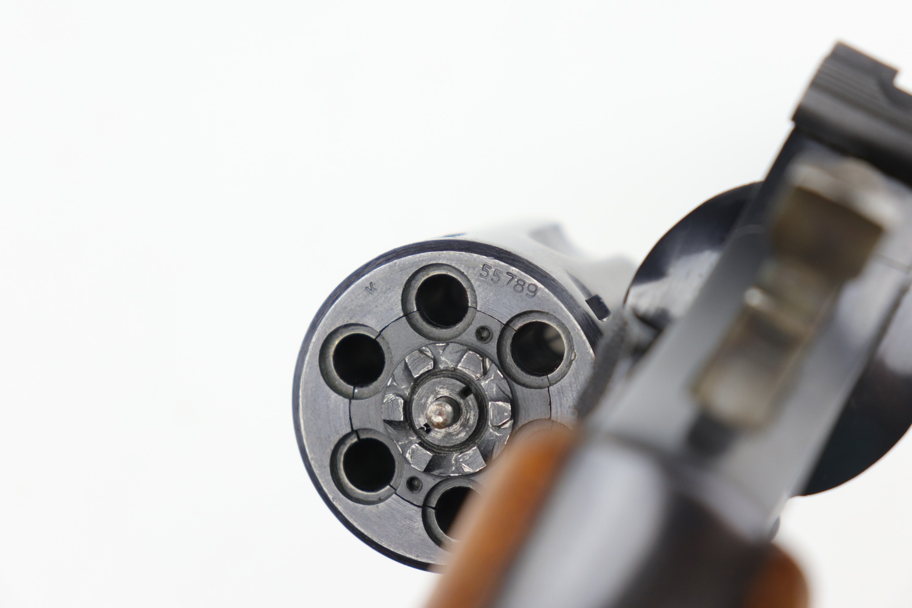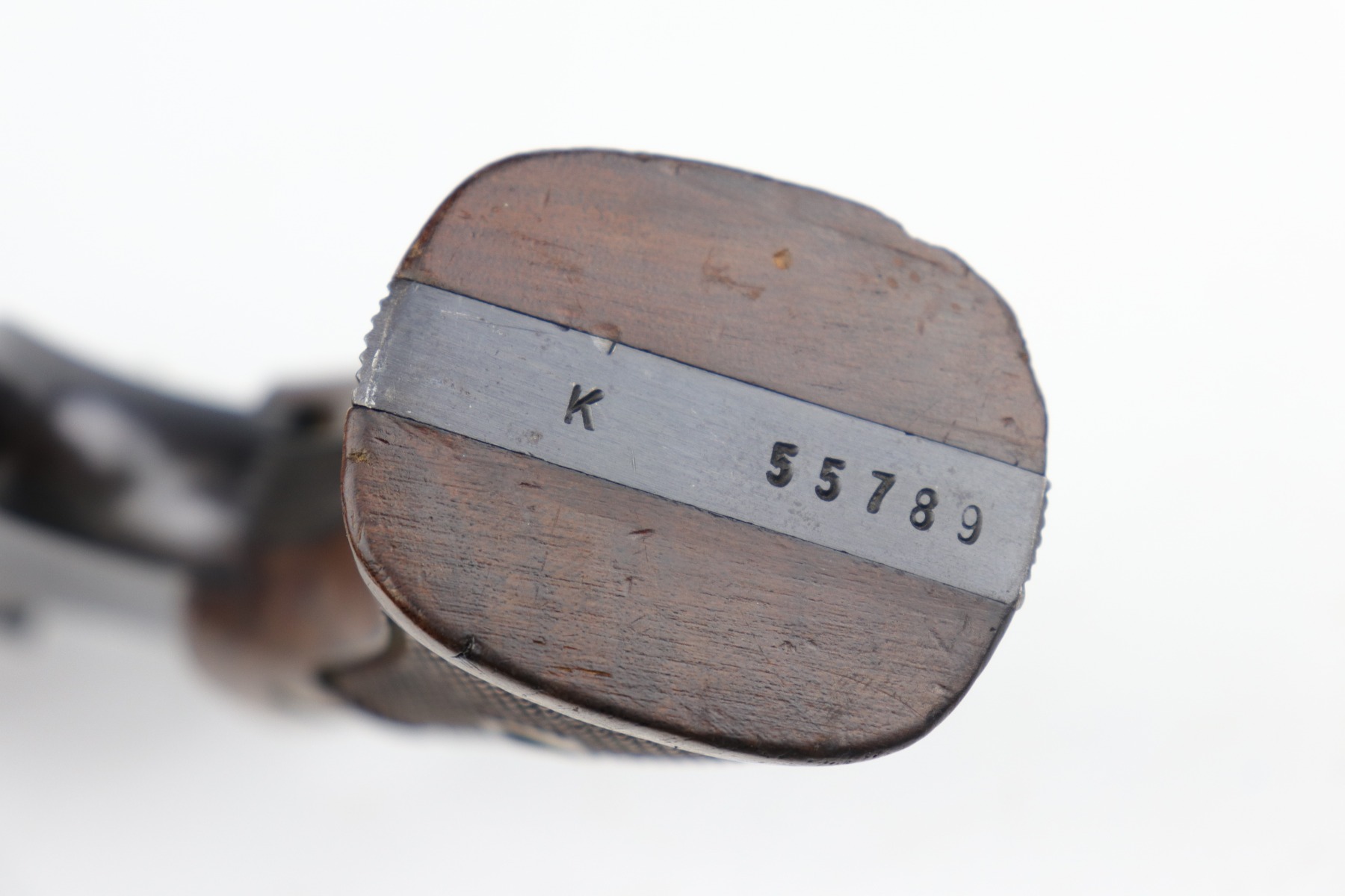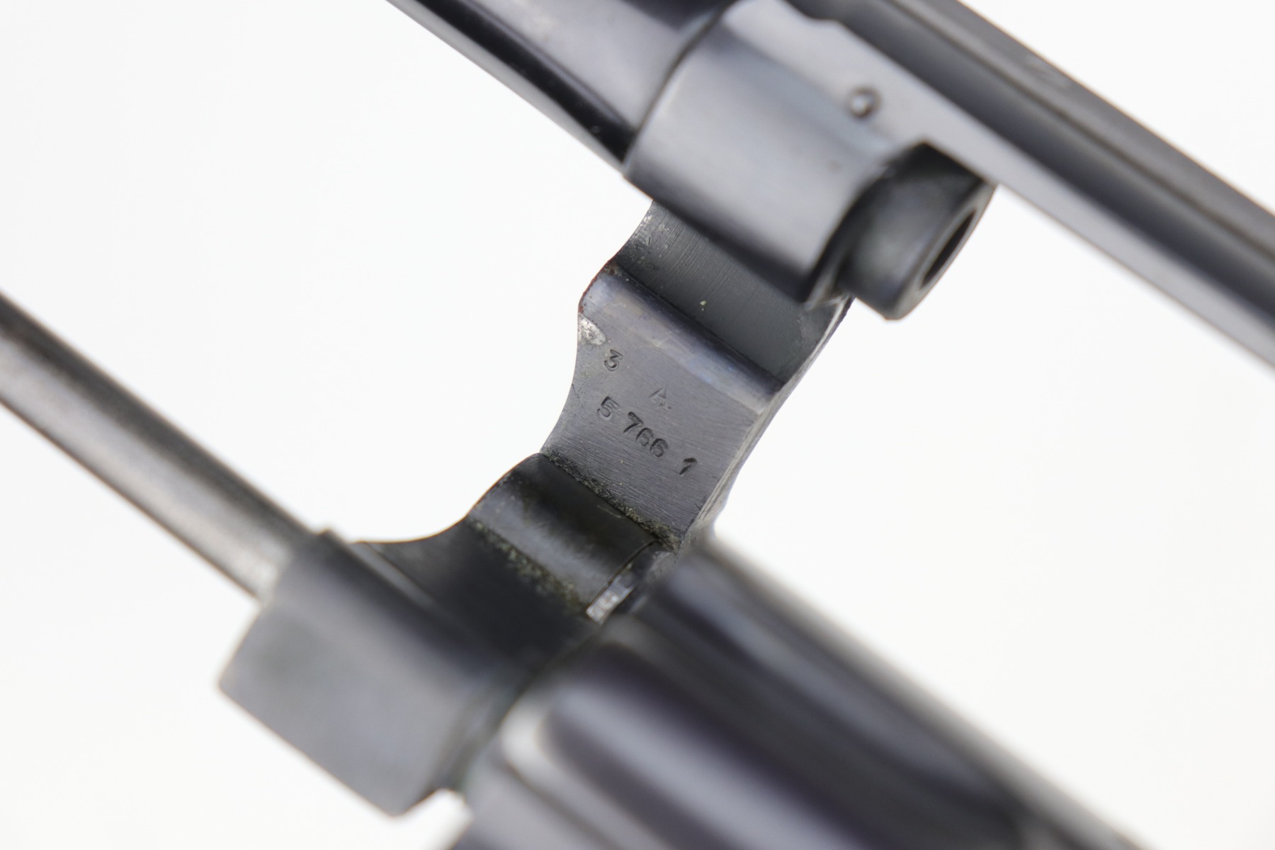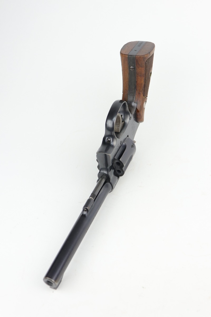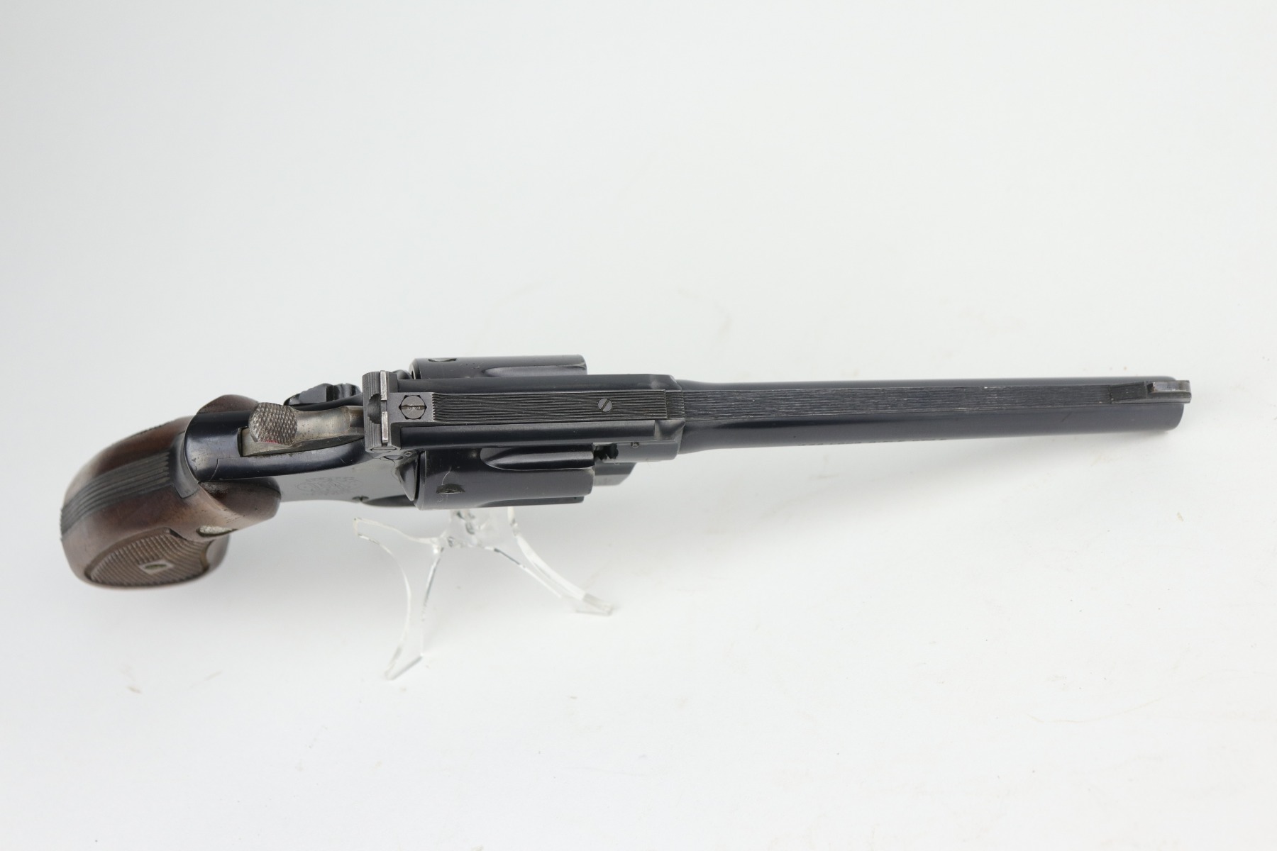 9/5/20 – This is an excellent example of a Smith & Wesson K-22 “K Frame” Revolver, chambered in .22 LR. From the serial number, it was made just after WW2, in 1948. This gun is fully functional and the action is smooth. The cylinder is tight. It has retained about 96-97% of its original bluing. There is very minor muzzle wear, and high edge wear here and there on the frame and cylinder. Very light roll mark on the cylinder. There are a few very light scratches on the frame just behind the hammer and on the underside of the frame near the trigger guard. Two very small dings on the butt. The bore is near-mint. Excellent S&W grips. 6″ barrel.