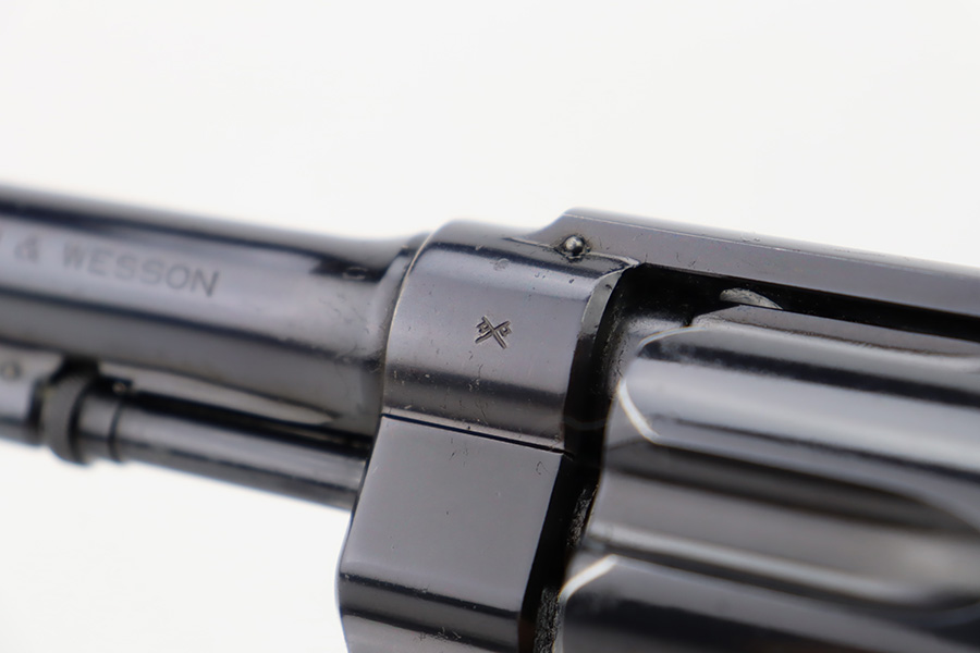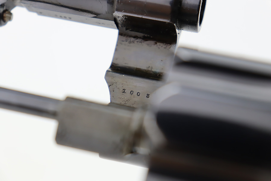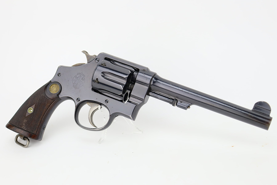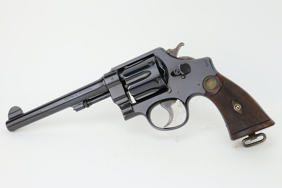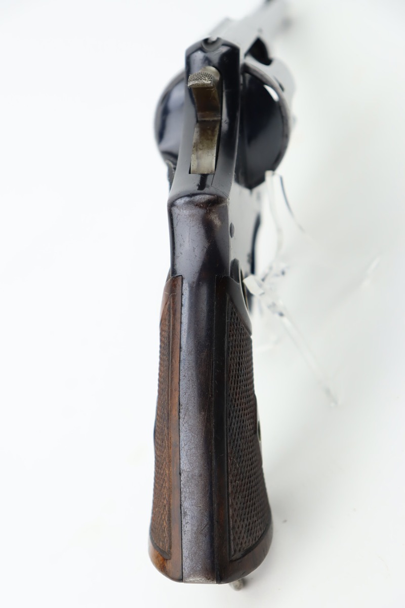 10/20/23 – Manufactured during WWI under contract for the Canadian military, this is a Smith & Wesson Mark II Hand-Ejector in .455 caliber. The revolver is all original, matching, and has retained about 97% of its original high polish finish. Just very minor wear around the muzzle and on some of the high edges. An area of very light pin-pricking and a few scratches on the right side of the frame. Fitted with excellent checkered wood grips. Mint bore.