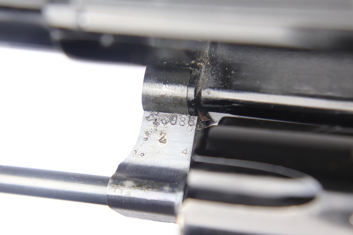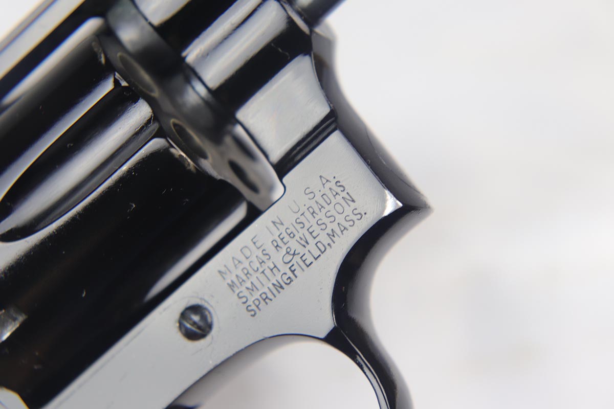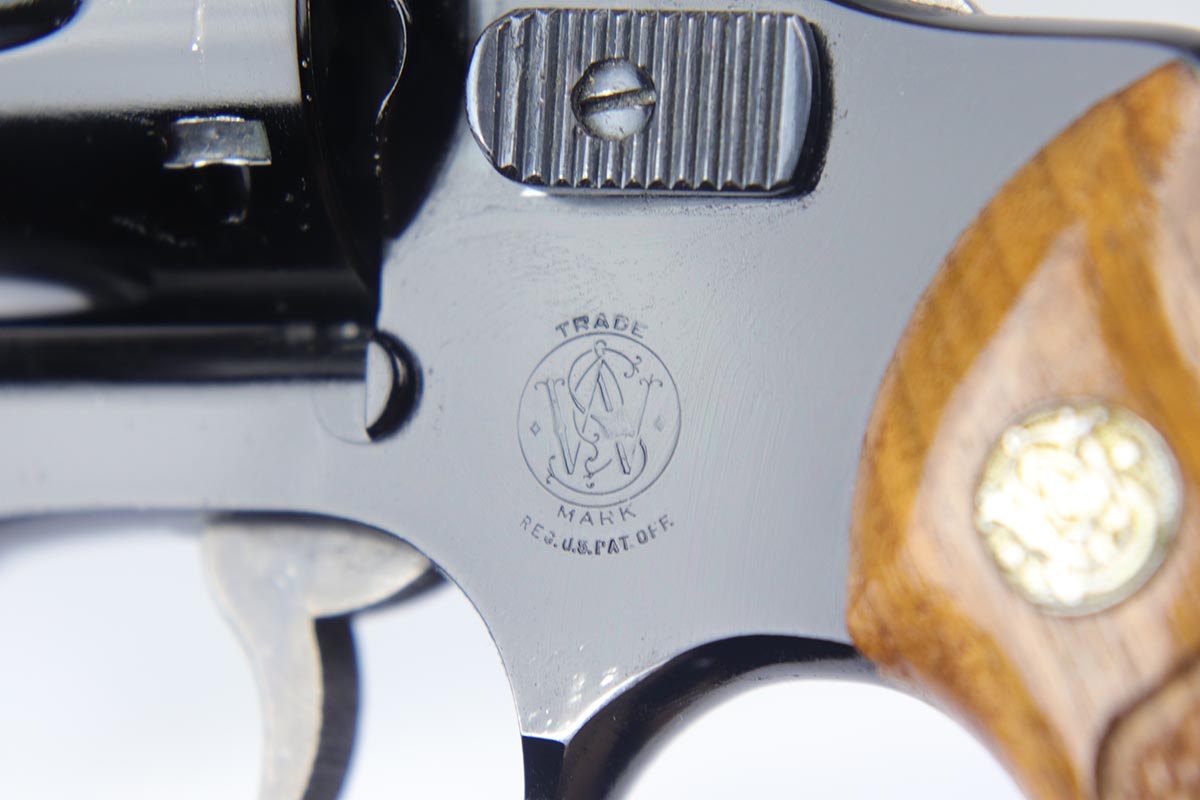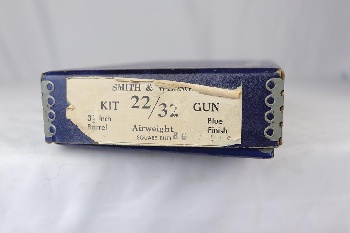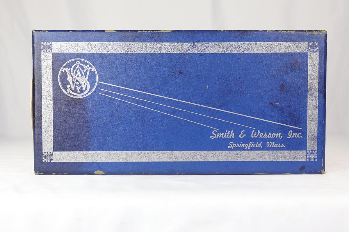 8/17/18 – This is a very nice Smith & Wesson Mod 43 .22/32 Kit Gun Airweight in the original matching box. The high-polish blue rates at about 98% with finish loss on each side of the muzzle and minor roll marks on cylinder. The trigger and hammer still show excellent case hardening, and the grips are minty. The box is in still in great condition and hand-numbered to the gun on the bottom. Serial dates to about 1956.