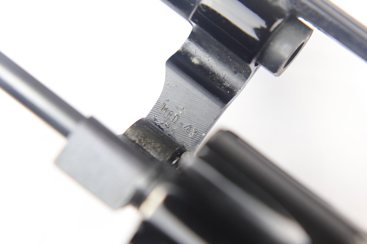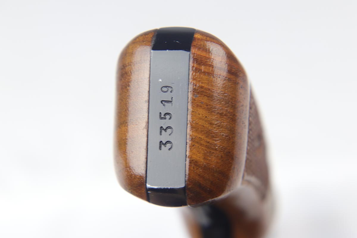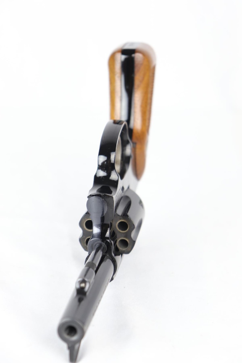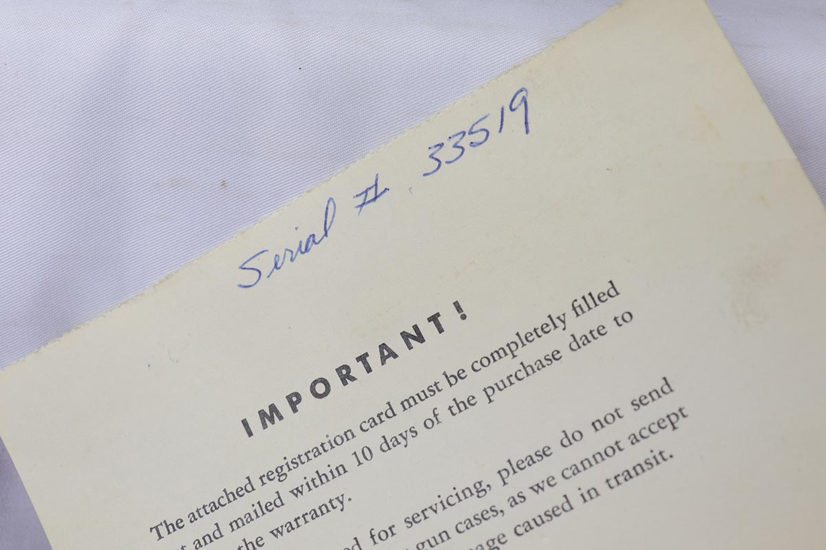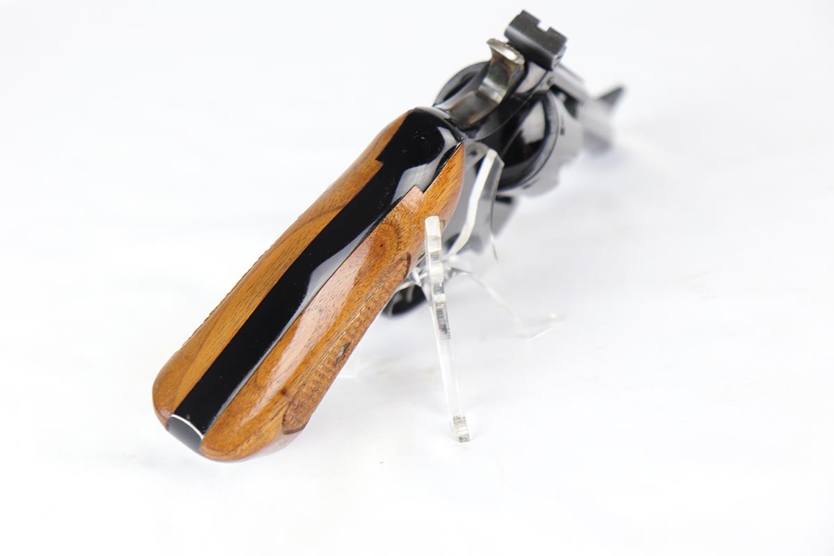 8/17/18 – This is a very nice Smith & Wesson Mod 43 .22/32 Kit Gun Airweight in the original matching box. The high-polish blue rates at about 98% with finish loss on each side of the muzzle and minor roll marks on cylinder. The trigger and hammer still show excellent case hardening, and the grips are minty. The box is in still in great condition and hand-numbered to the gun on the bottom. Serial dates to about 1956.