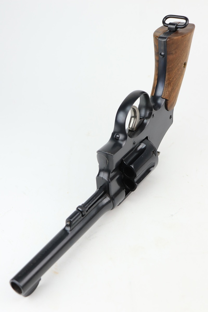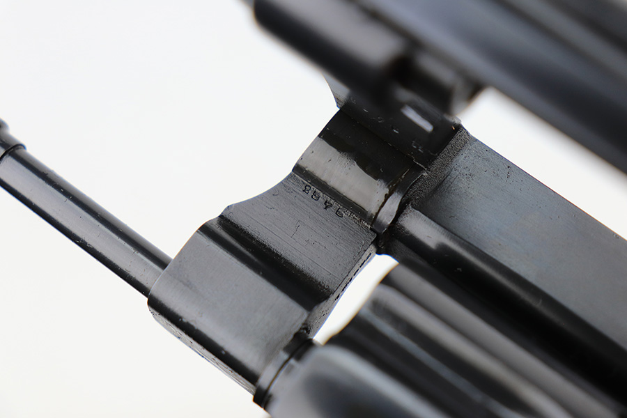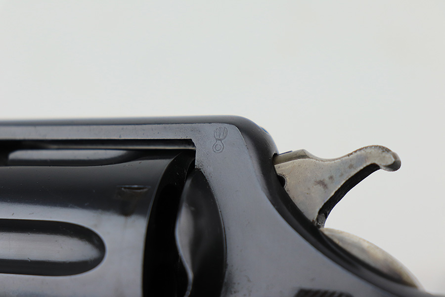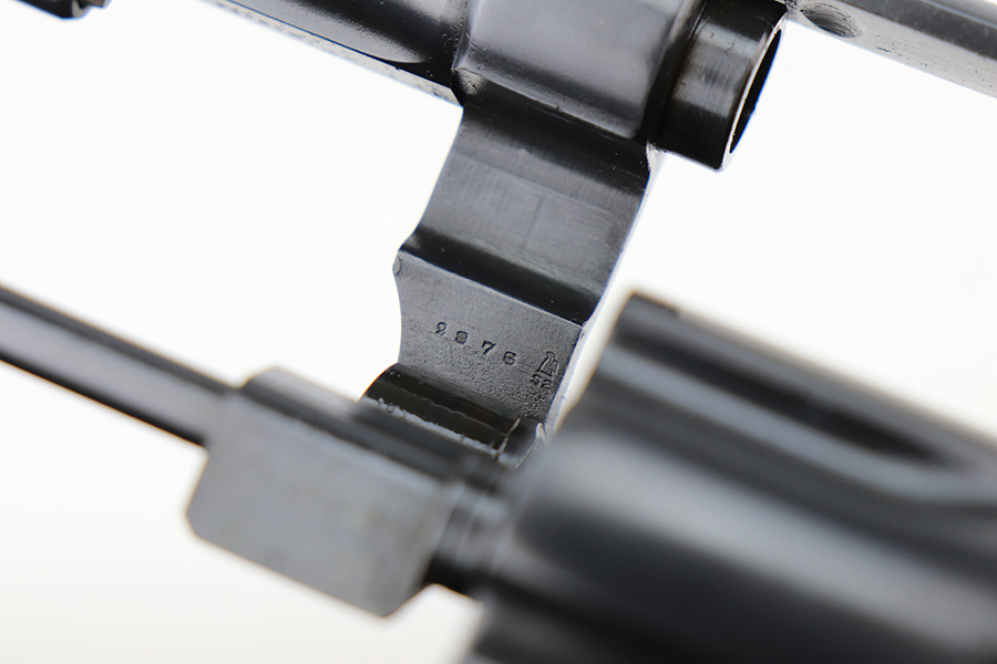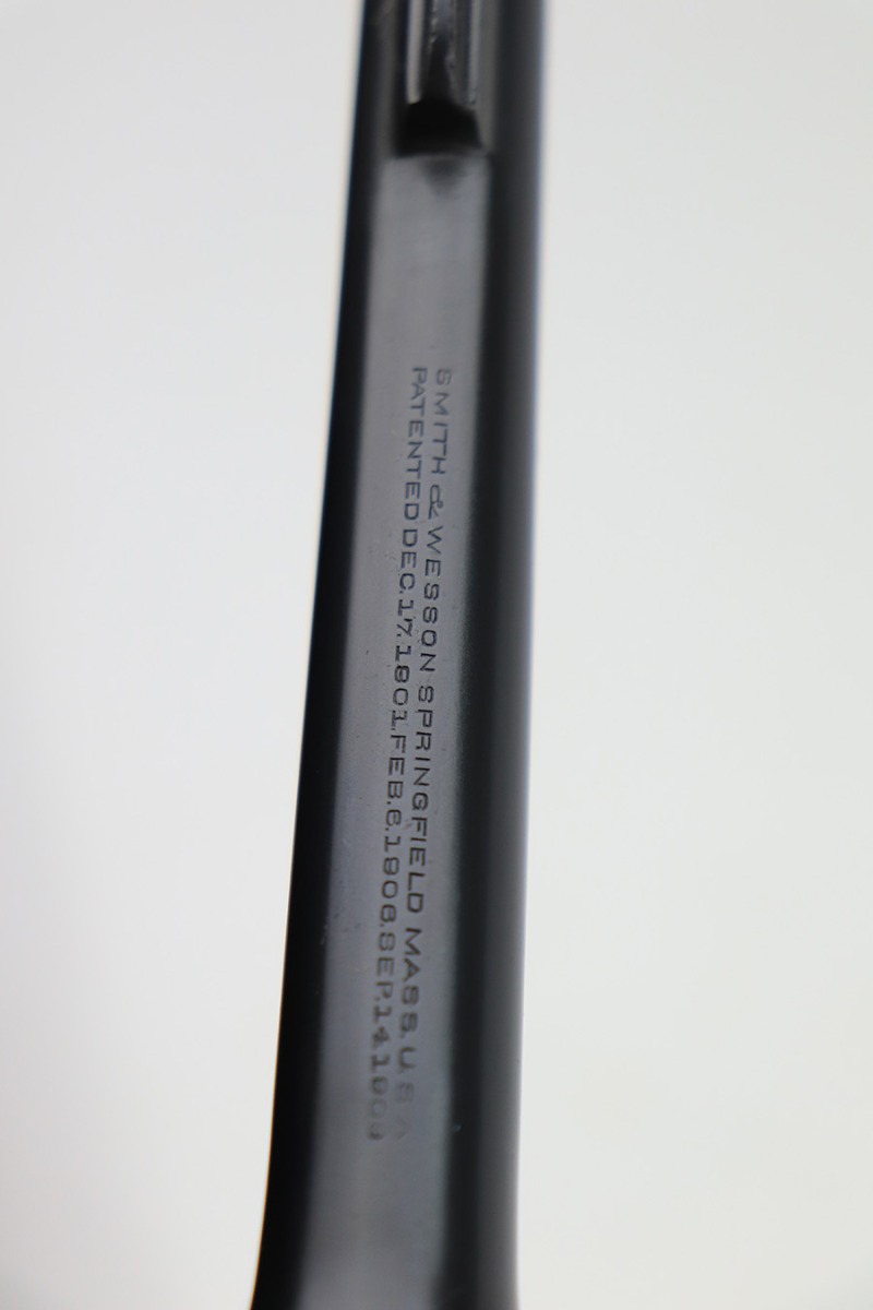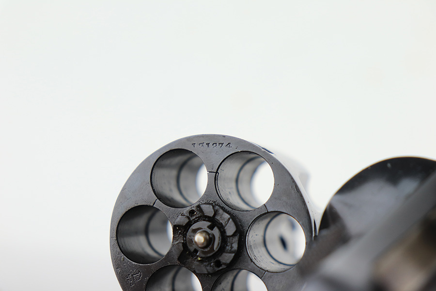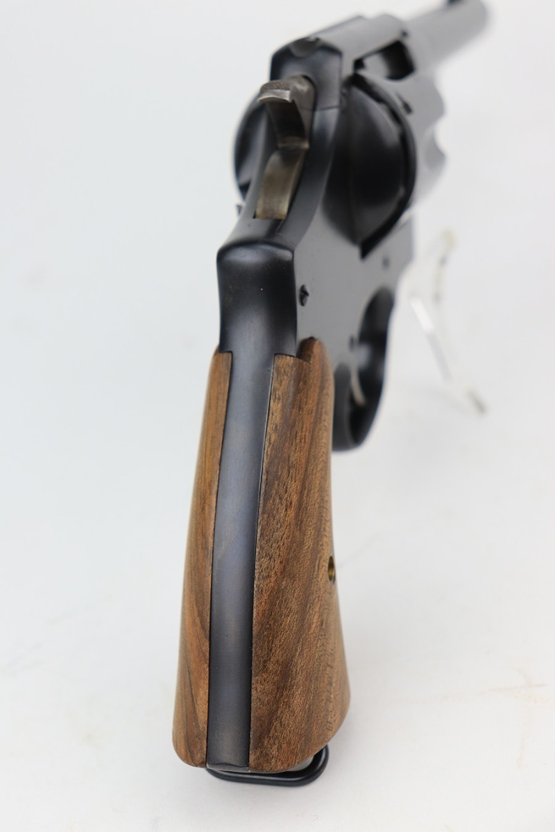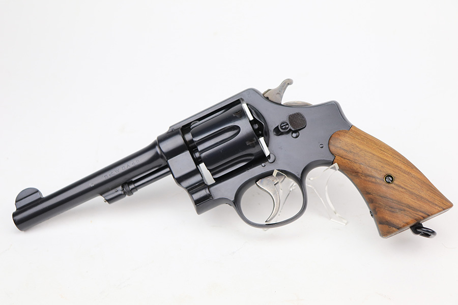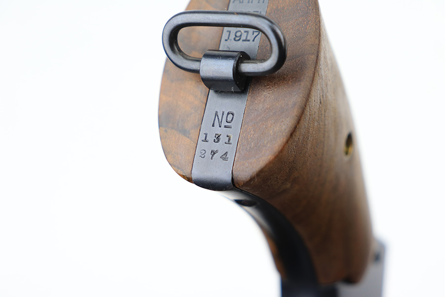 3/4/22 – This is an excellent example of a Smith & Wesson Model 1917 Revolver issued to the US military during WW1. It is all matching, “United States Property” marked on the underside of the barrel, and has the proper flaming bomb and Eagle Head military acceptance proofs. The whole gun has been professionally restored, so the bluing is really nice. The gun has retained virtually all of its finish – there isn’t even a roll mark on the cylinder. There is just some pin-pricking on the right side of the frame that has been blued-over. The cylinder is tight and the action is smooth. Comes with a set of minty wood replacement grips. The bore has strong rifling pin-pricking in some of the grooves.