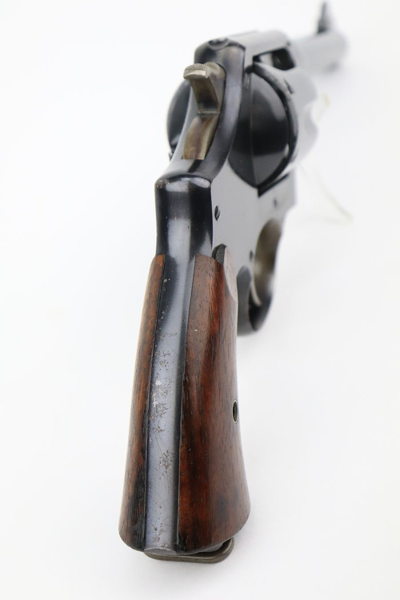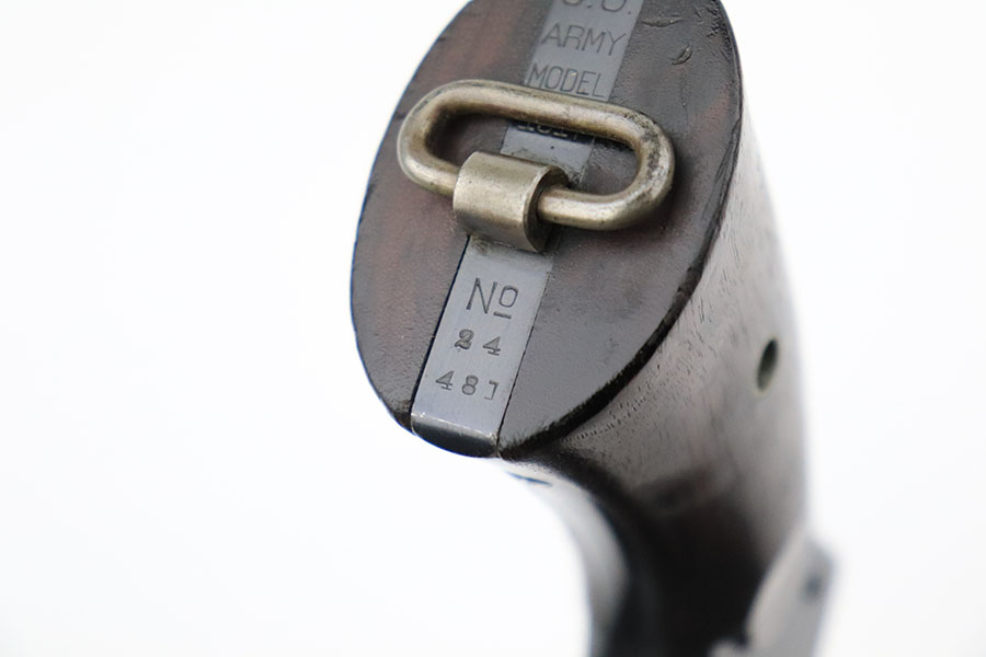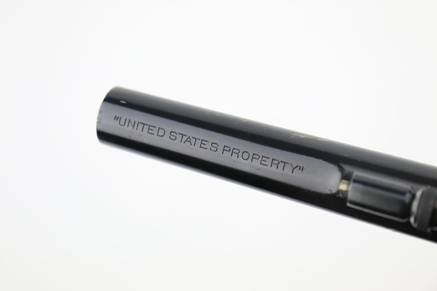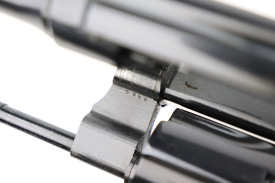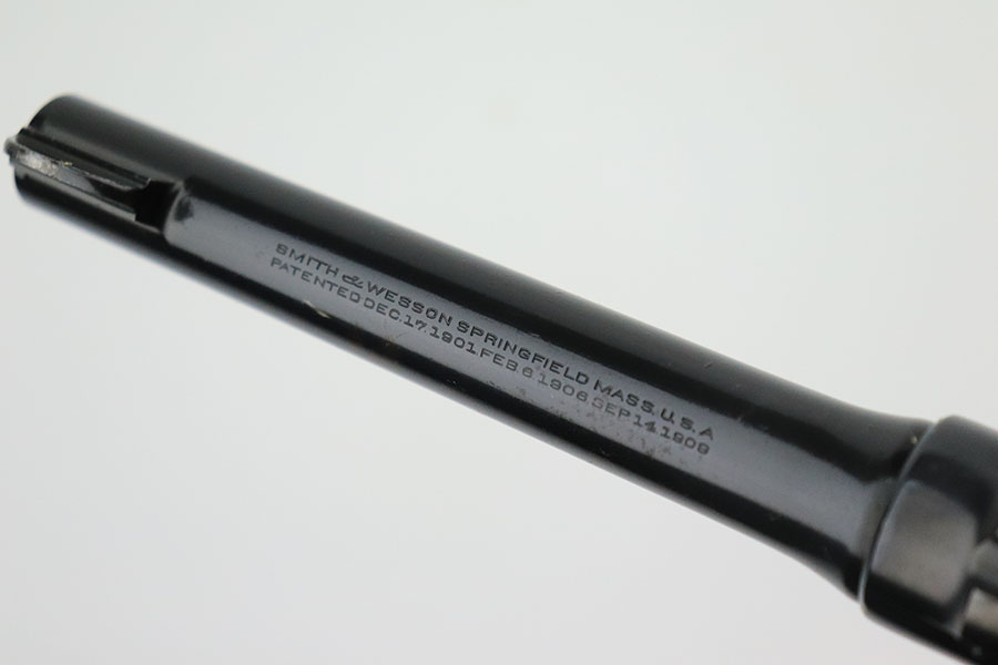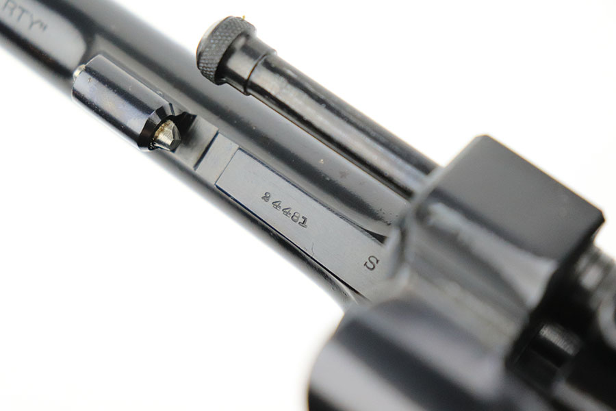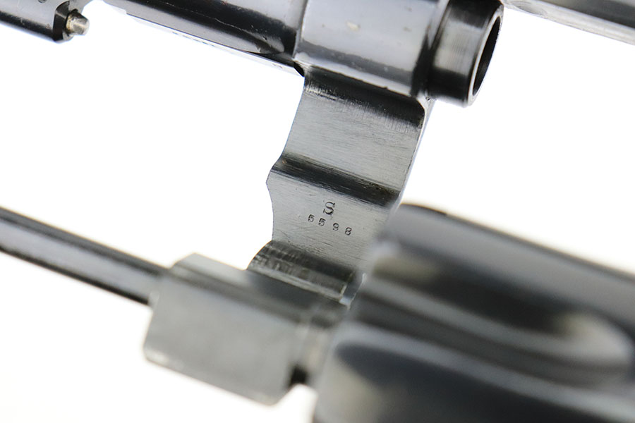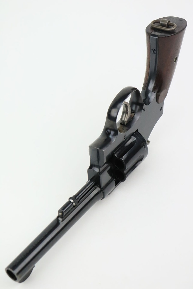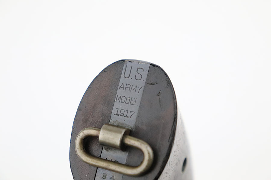 10/20/22 – This is an excellent example of a Smith & Wesson Model 1917 revolver issued to the US military during WW1. It is all matching, has the proper military inspection proof, and is “United States Property” marked on the underside of the barrel. It has retained about 96-97% of its original high polish finish. There are areas of small dots of discoloration and tiny pits on the left side of the barrel and on the back strap. Very light roll mark on the cylinder. Excellent case-hardening on the hammer and trigger. Comes with very nice period-correct wood grips – some minor bruising on the left side. Original lanyard loop is intact. Minty bore. The cylinder is tight, and the action is smooth.