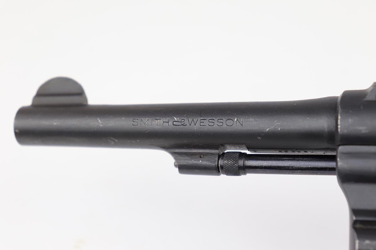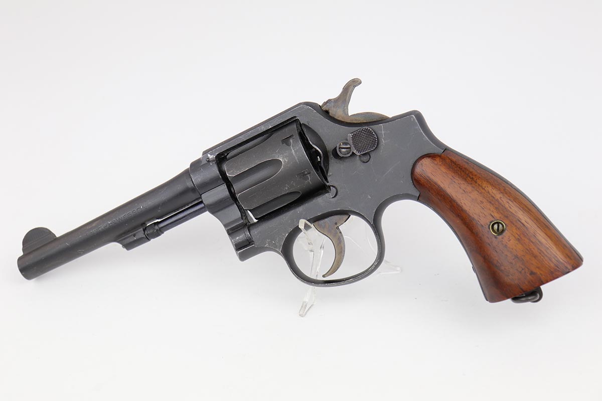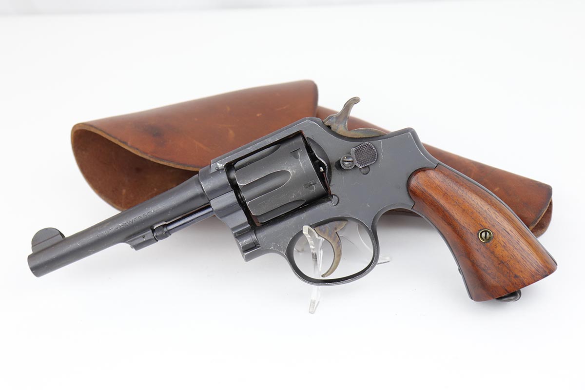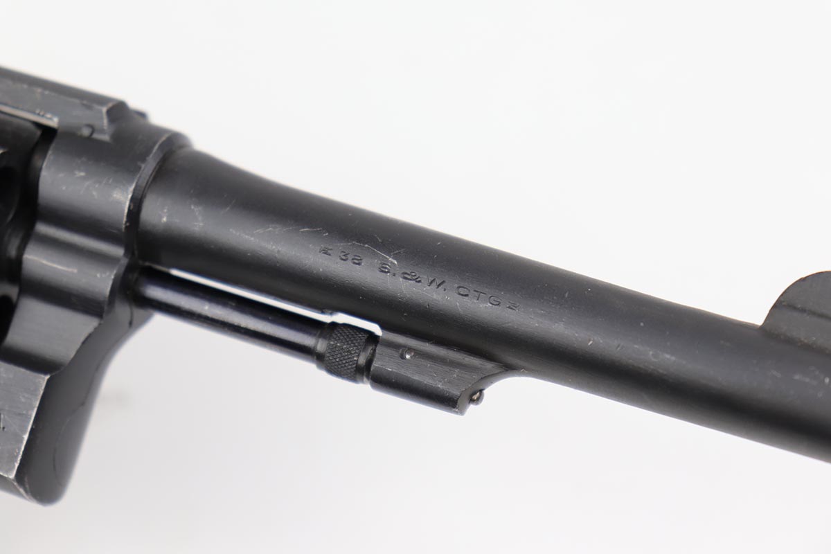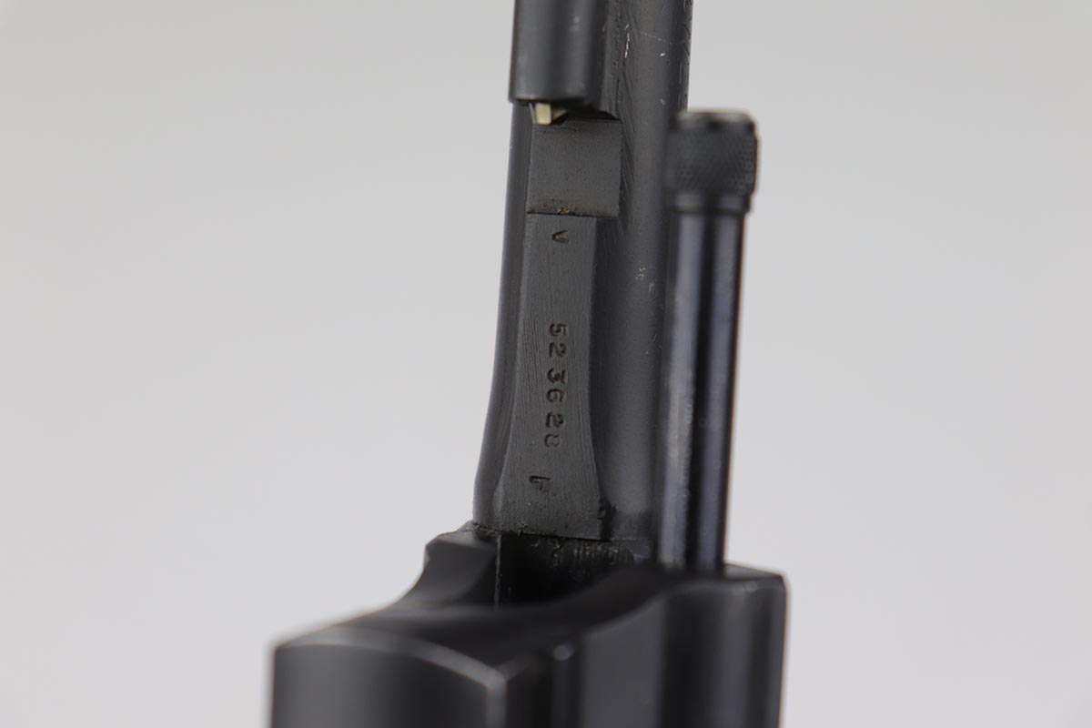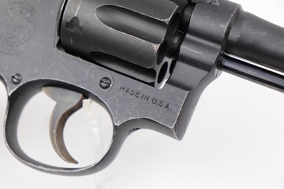 10/17/22 – This is an excellent Smith & Wesson Victory Model from World War II. It is U.S. Property marked and G.H.D (Guy H. Drewry) inspector marked. The original finish is about 97% with minor thinning from the holster and various scuff marks. Mint bore. Made from 1942 to 1944, with a production run of ~500,000. They were standard issued side arms for US Navy and Marine air crews due to their size and ease of operation. It is .38 S&W special. Comes with excellent, period original holster.