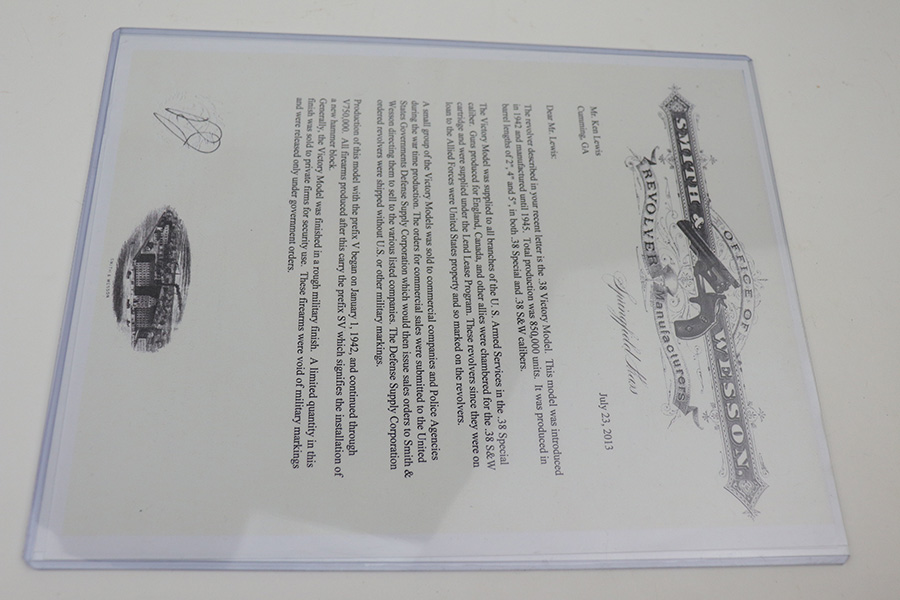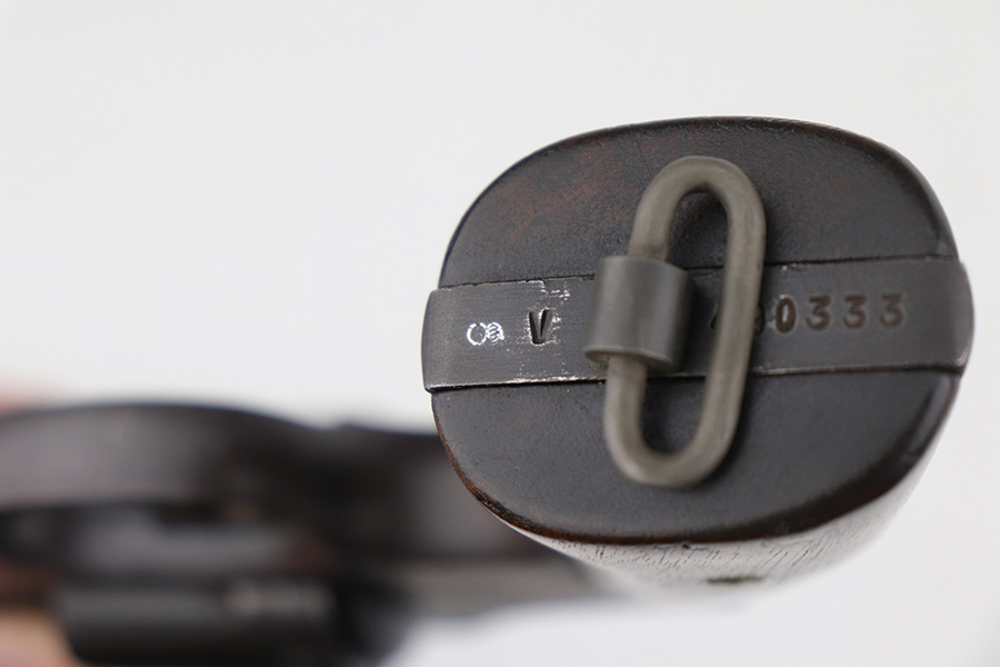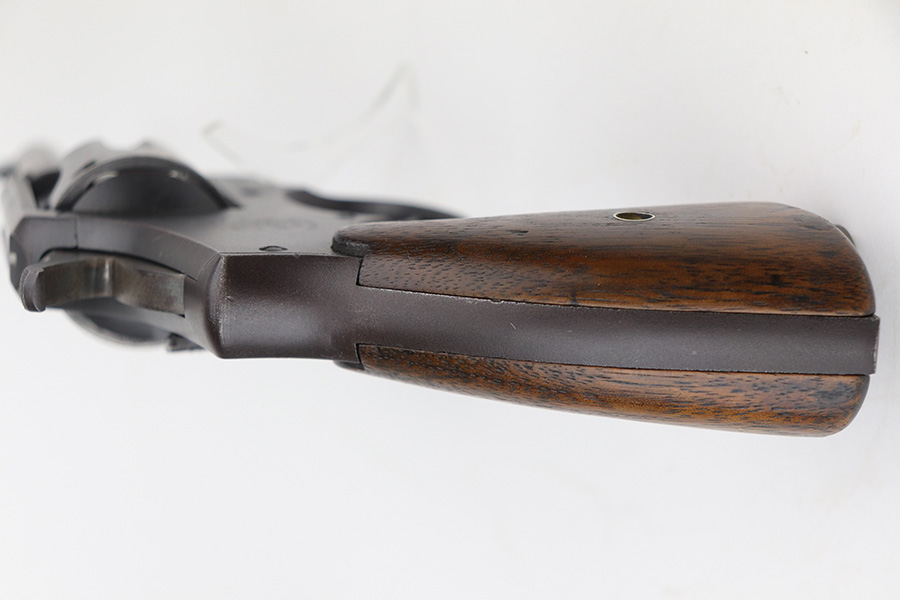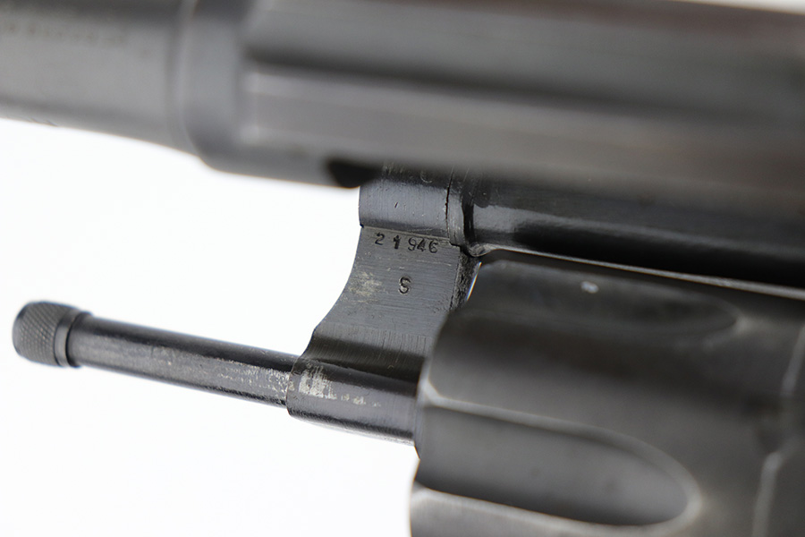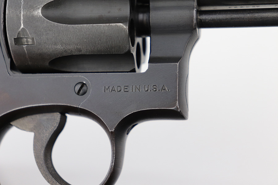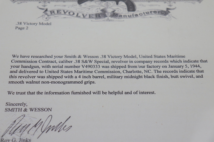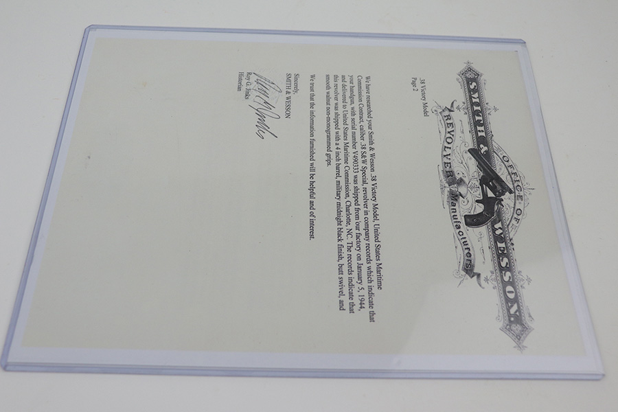 10/15/21 – This is an excellent example of a Smith & Wesson Victory revolver from World War II. It’s accompanied by a factory letter stating it was shipped to Charlotte in January of 1944 as part of a United States Maritime Commission contract order. It’s all matching and original with 96-97% of the parkerized finish remaining. Standard cylinder wear from turn marks and a little more on the muzzle and high edges. The grips are original to the gun and the right panel is correctly numbered and matching to the firearm. Left grip panel does have a repaired crack in it. Flaming bomb and ‘P’ inspection proofs on frame. Minty bore.