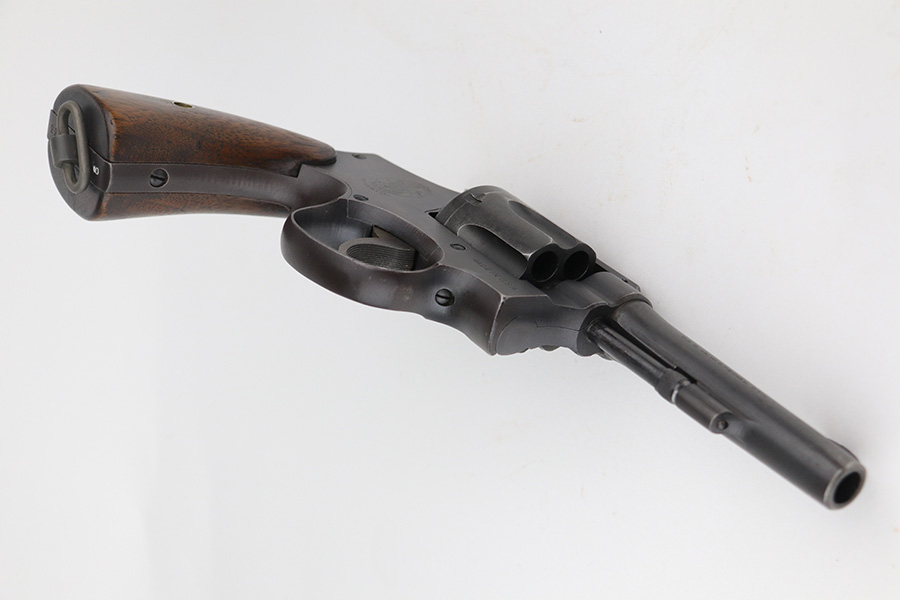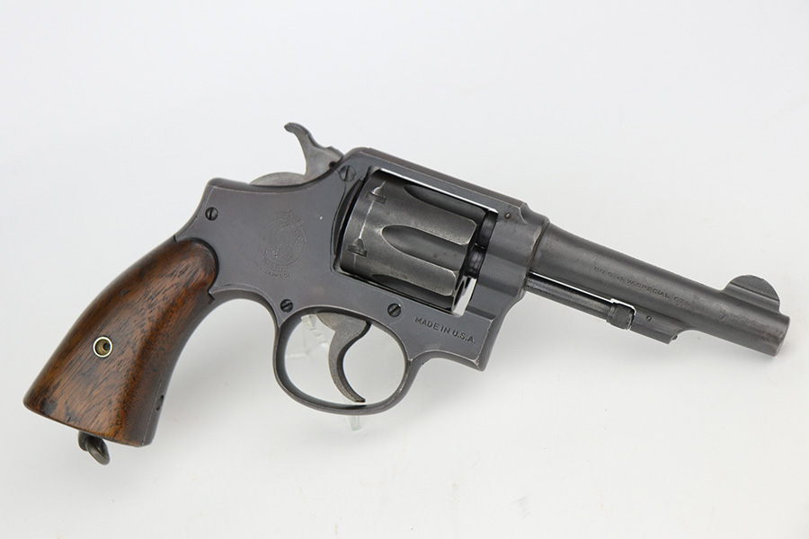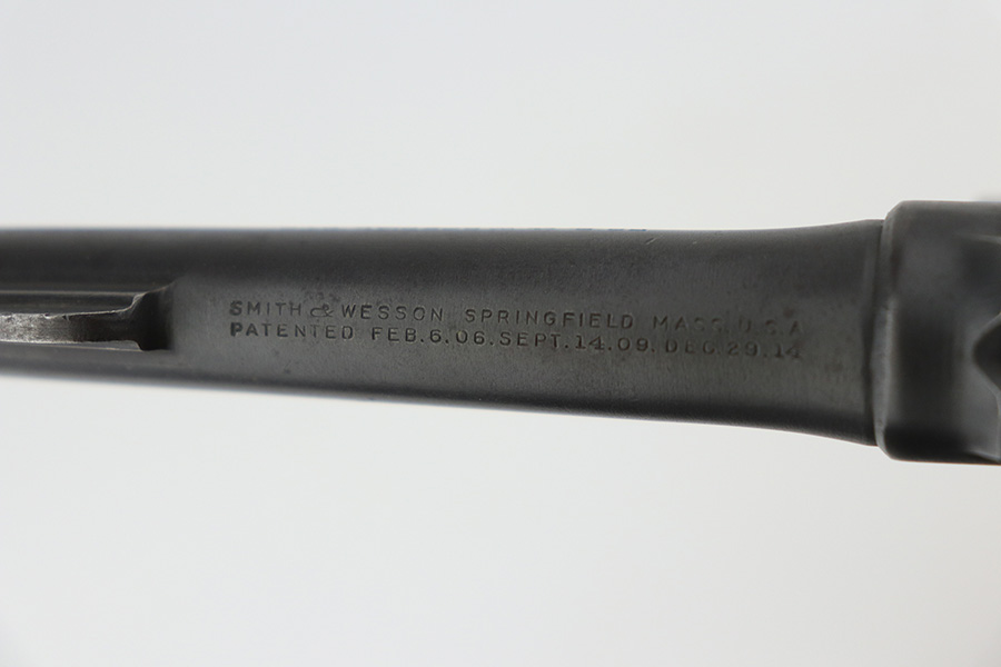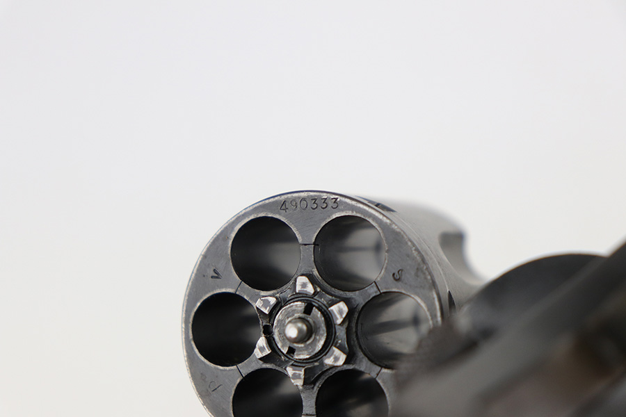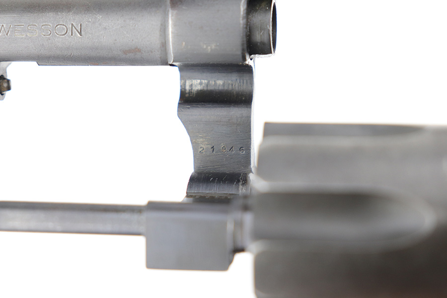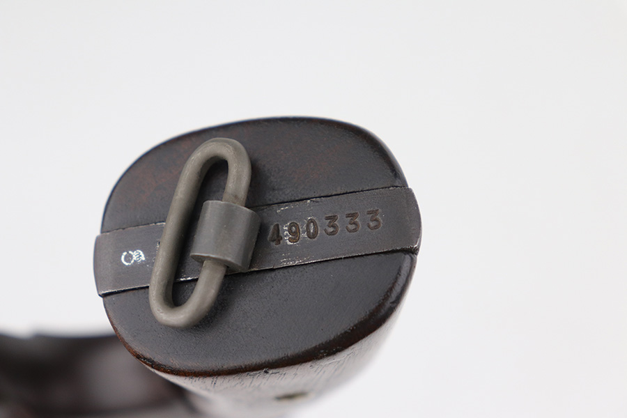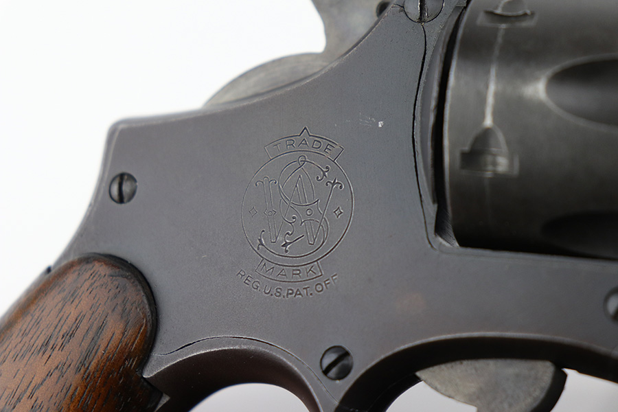 10/15/21 – This is an excellent example of a Smith & Wesson Victory revolver from World War II. It’s accompanied by a factory letter stating it was shipped to Charlotte in January of 1944 as part of a United States Maritime Commission contract order. It’s all matching and original with 96-97% of the parkerized finish remaining. Standard cylinder wear from turn marks and a little more on the muzzle and high edges. The grips are original to the gun and the right panel is correctly numbered and matching to the firearm. Left grip panel does have a repaired crack in it. Flaming bomb and ‘P’ inspection proofs on frame. Minty bore.