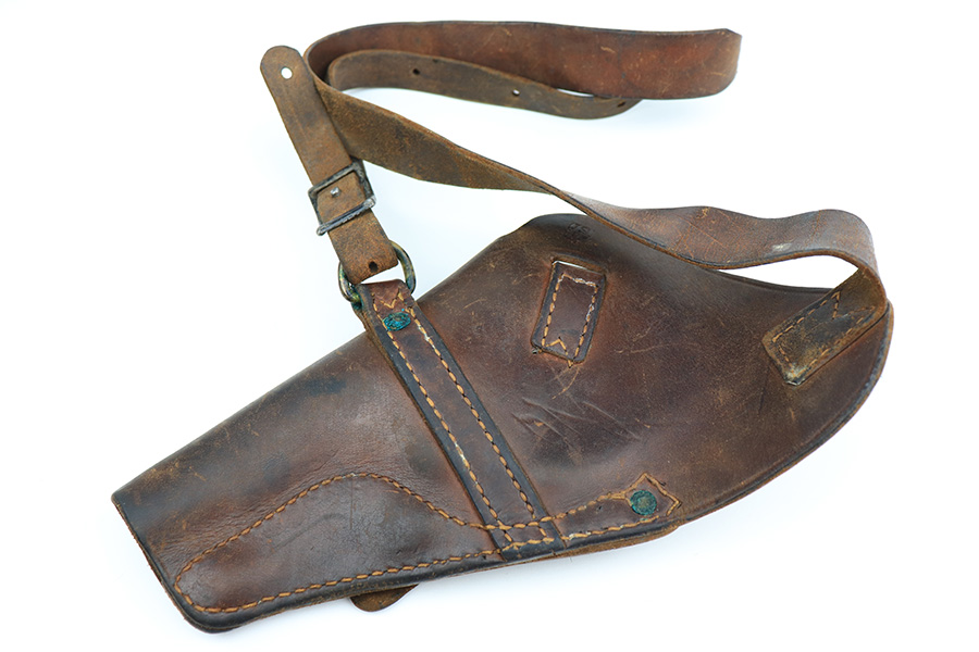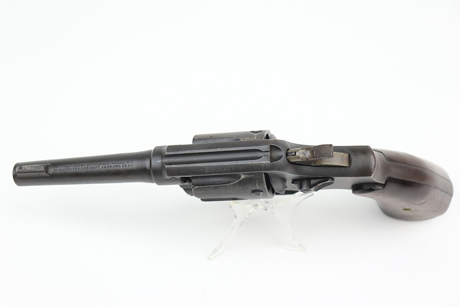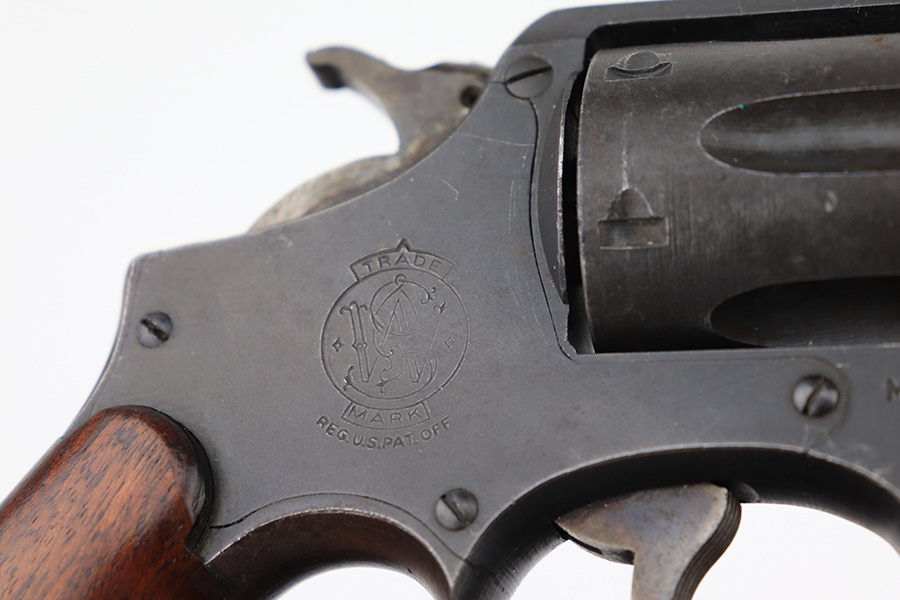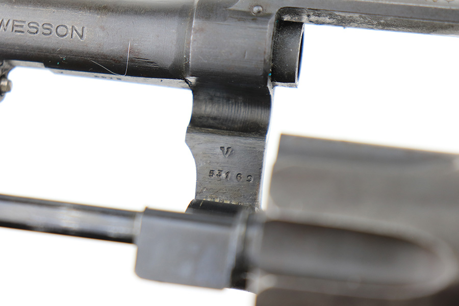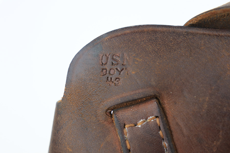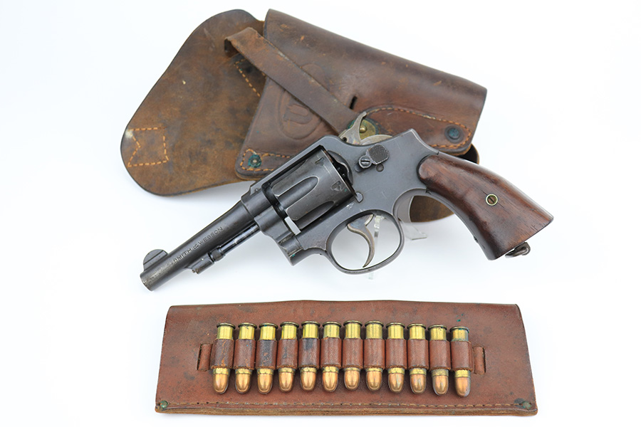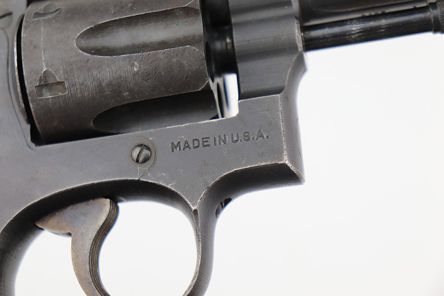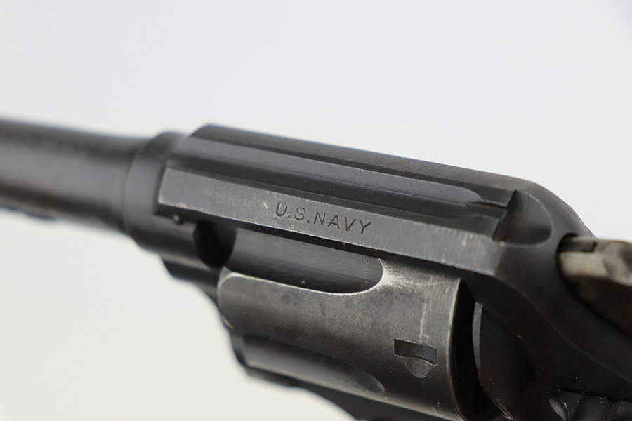 3/16/22 – This is an excellent example of a Smith & Wesson Victory Revolver issued to the US Navy during WW2. The gun is all matching and has the proper “US Navy” marking on the top strap. The cylinder is tight and the action is very smooth. The gun comes as a rig with a nice 1943-dated leather shoulder holster, a leather ammo sleeve, and 12 rounds of Winchester .38 Spl ammo (not dated). The gun has retained about 97-98% of its original finish with very minor wear around the muzzle, hints of wear on some of the high edges, and a very light roll mark on the cylinder. While there is very little actual finish loss, there are areas with small dots of oxidation and discoloration throughout. It is most noticeable on the cylinder and sides of the frame. Comes with nice period-correct wood grips – there are some tiny bruises here and there and some very light cracking around the left screw hole. The right panel is numbered and matching, the left panel is un-numbered. The bore is mint.