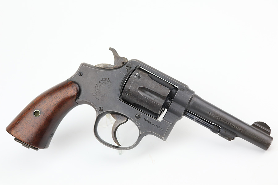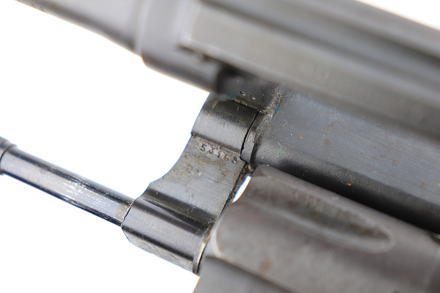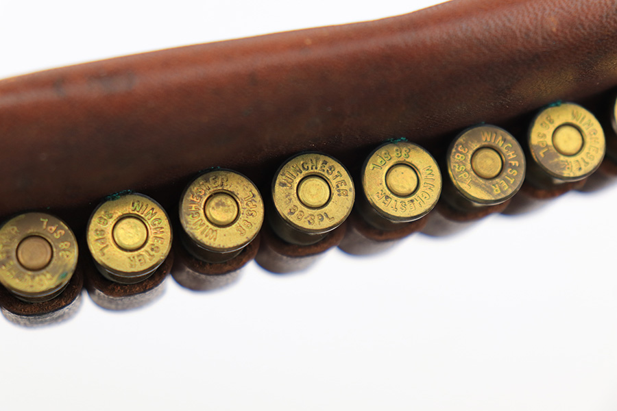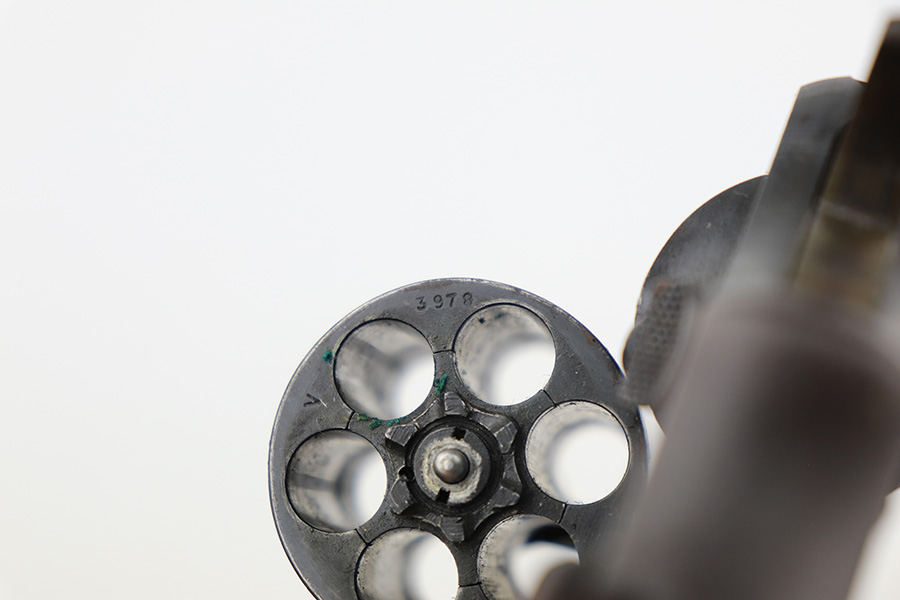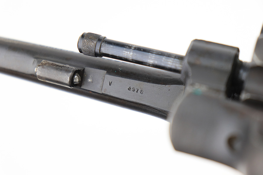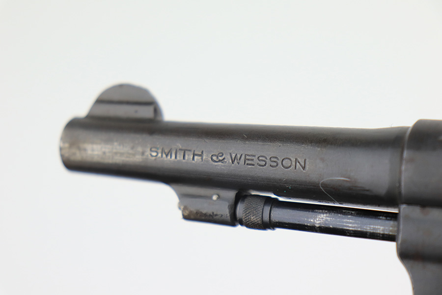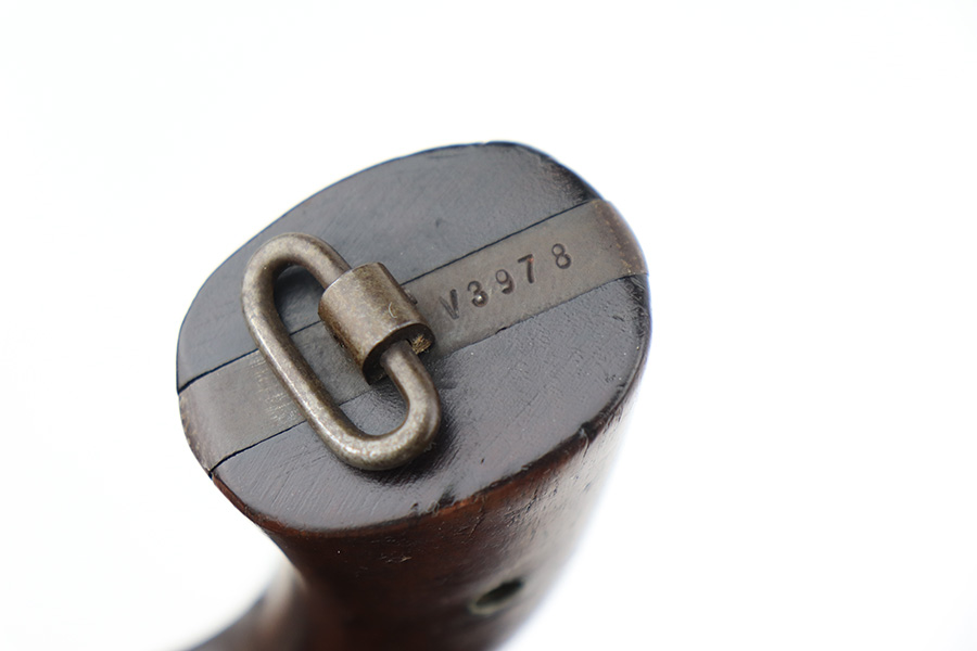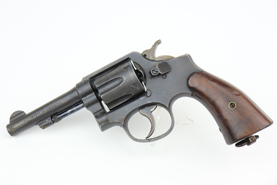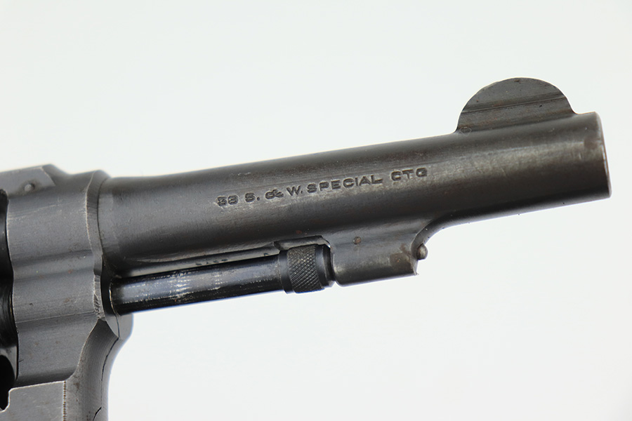 3/16/22 – This is an excellent example of a Smith & Wesson Victory Revolver issued to the US Navy during WW2. The gun is all matching and has the proper “US Navy” marking on the top strap. The cylinder is tight and the action is very smooth. The gun comes as a rig with a nice 1943-dated leather shoulder holster, a leather ammo sleeve, and 12 rounds of Winchester .38 Spl ammo (not dated). The gun has retained about 97-98% of its original finish with very minor wear around the muzzle, hints of wear on some of the high edges, and a very light roll mark on the cylinder. While there is very little actual finish loss, there are areas with small dots of oxidation and discoloration throughout. It is most noticeable on the cylinder and sides of the frame. Comes with nice period-correct wood grips – there are some tiny bruises here and there and some very light cracking around the left screw hole. The right panel is numbered and matching, the left panel is un-numbered. The bore is mint.