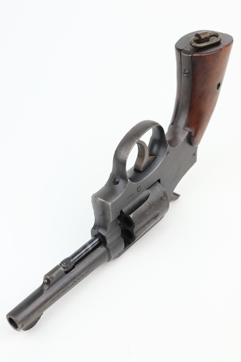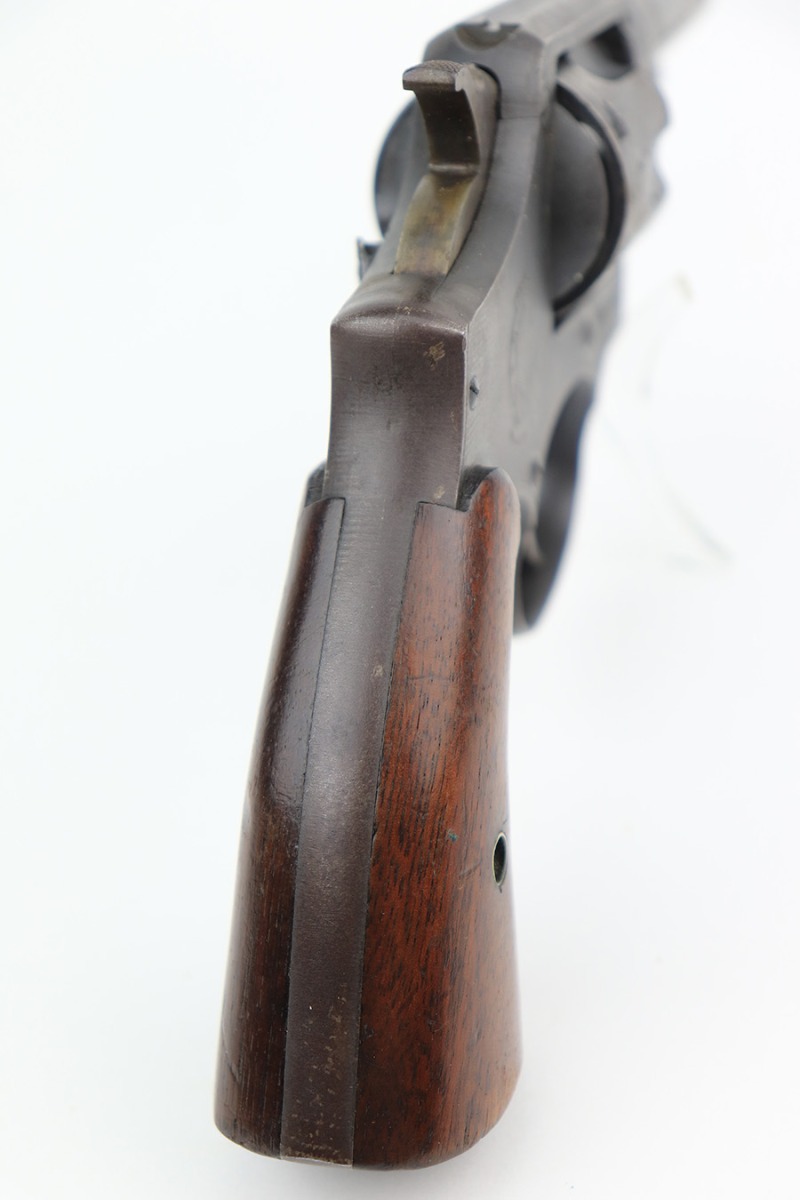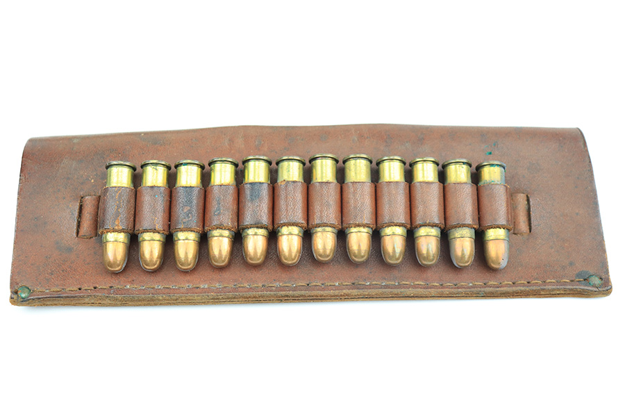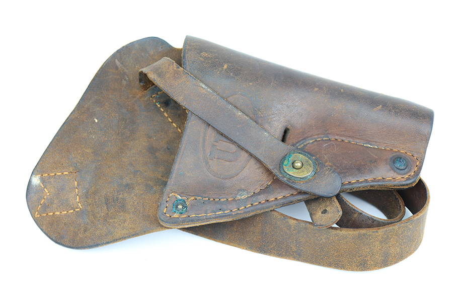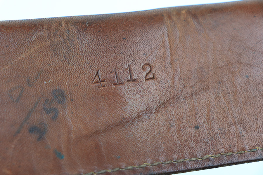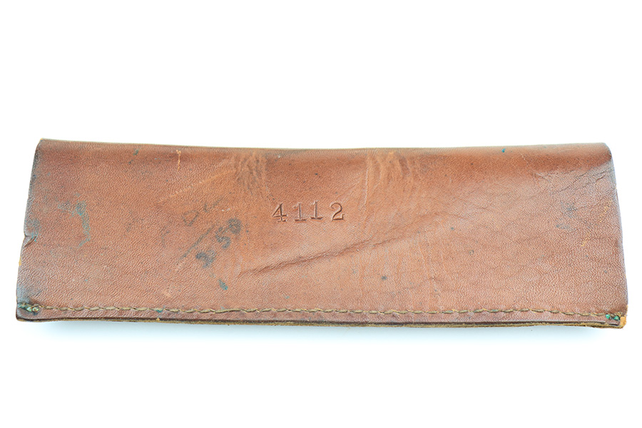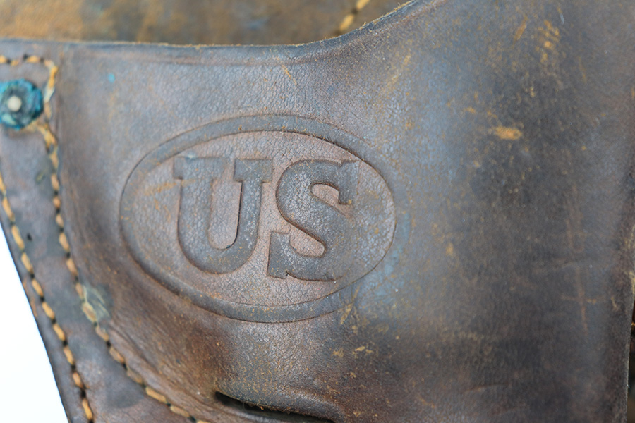 3/16/22 – This is an excellent example of a Smith & Wesson Victory Revolver issued to the US Navy during WW2. The gun is all matching and has the proper “US Navy” marking on the top strap. The cylinder is tight and the action is very smooth. The gun comes as a rig with a nice 1943-dated leather shoulder holster, a leather ammo sleeve, and 12 rounds of Winchester .38 Spl ammo (not dated). The gun has retained about 97-98% of its original finish with very minor wear around the muzzle, hints of wear on some of the high edges, and a very light roll mark on the cylinder. While there is very little actual finish loss, there are areas with small dots of oxidation and discoloration throughout. It is most noticeable on the cylinder and sides of the frame. Comes with nice period-correct wood grips – there are some tiny bruises here and there and some very light cracking around the left screw hole. The right panel is numbered and matching, the left panel is un-numbered. The bore is mint.