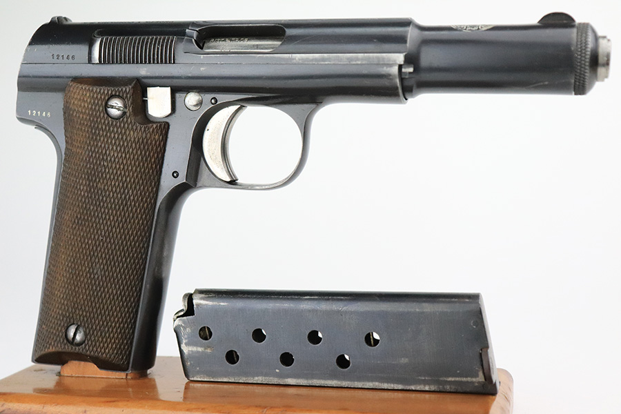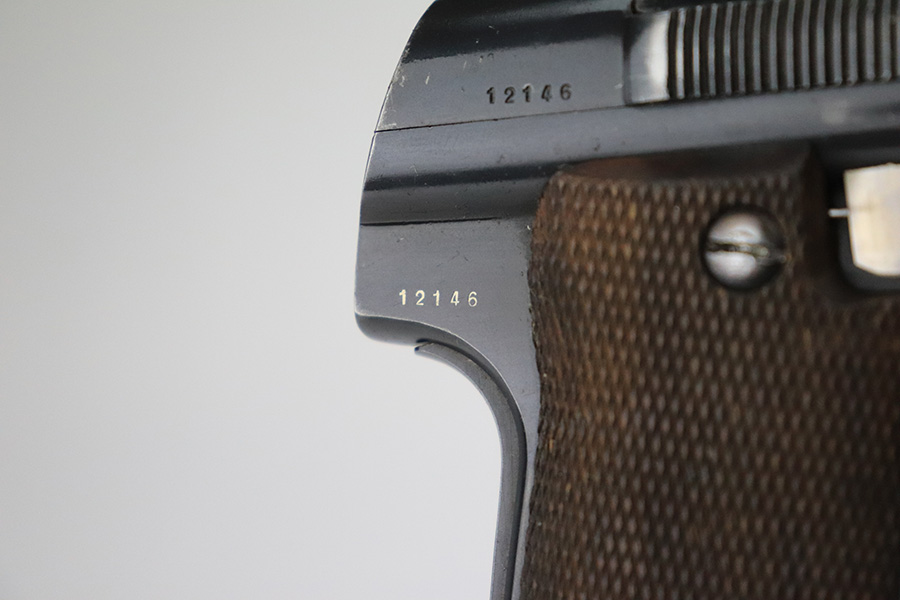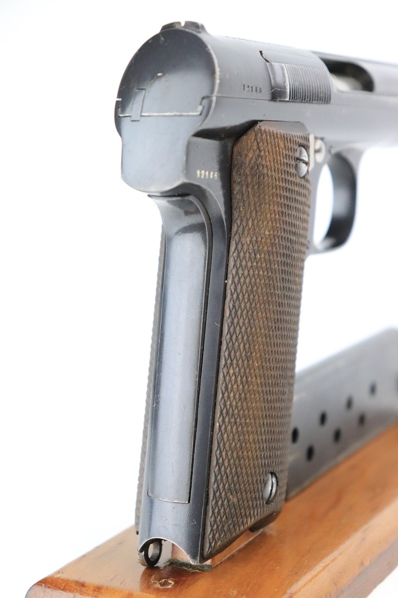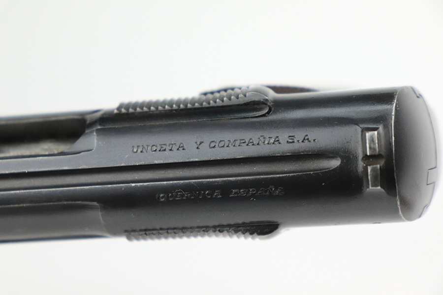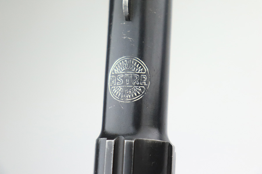 6/16/22 – This is an excellent example of a Spanish Astra Model 600/43. It is all matching and has the proper Spanish proofs. The “O” date code, indicates it was manufactured in 1944. It has retained about 96% of its original bluing. There is one spot of wear on the front strap and very minor wear around the muzzle and around the high edges in general. Minor scratchy wear along both sides of the slide. Comes with very nice wood grips (one bruise on the left side) and one period-correct magazine. Minty bore.