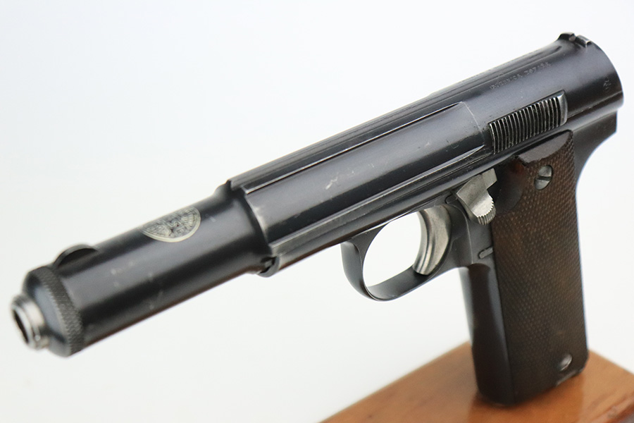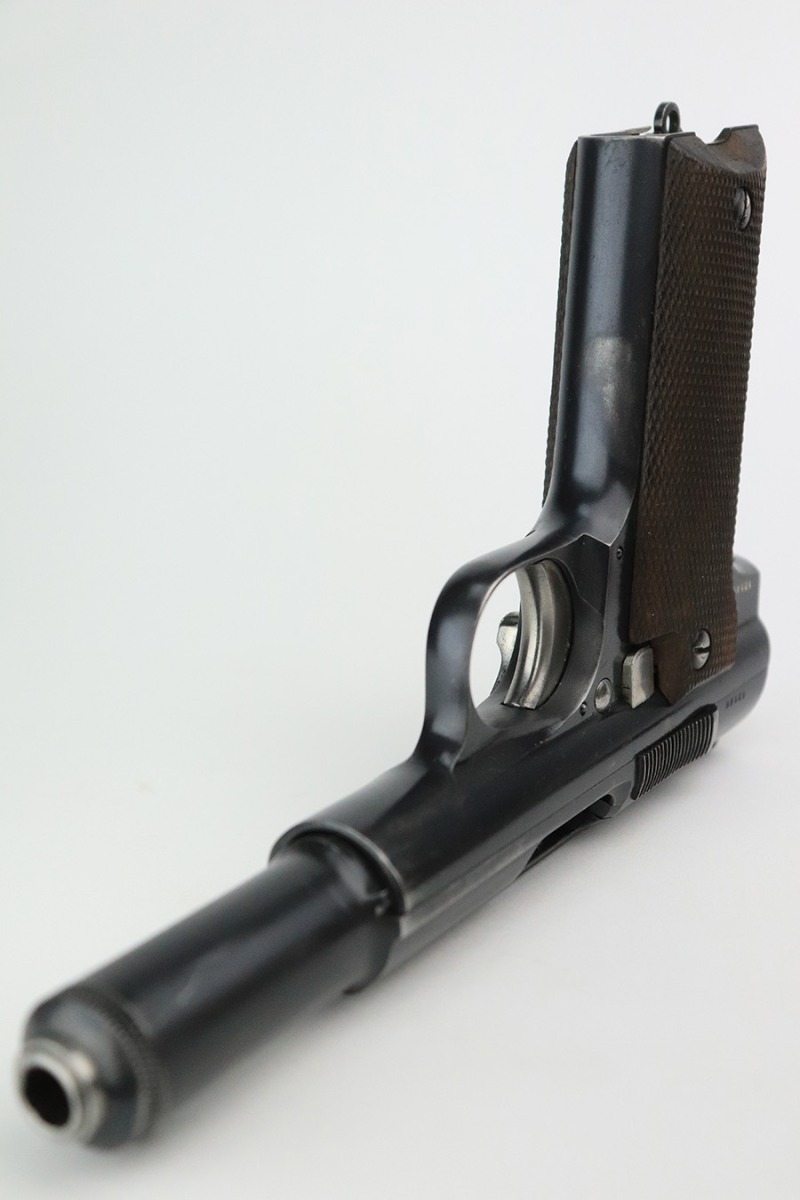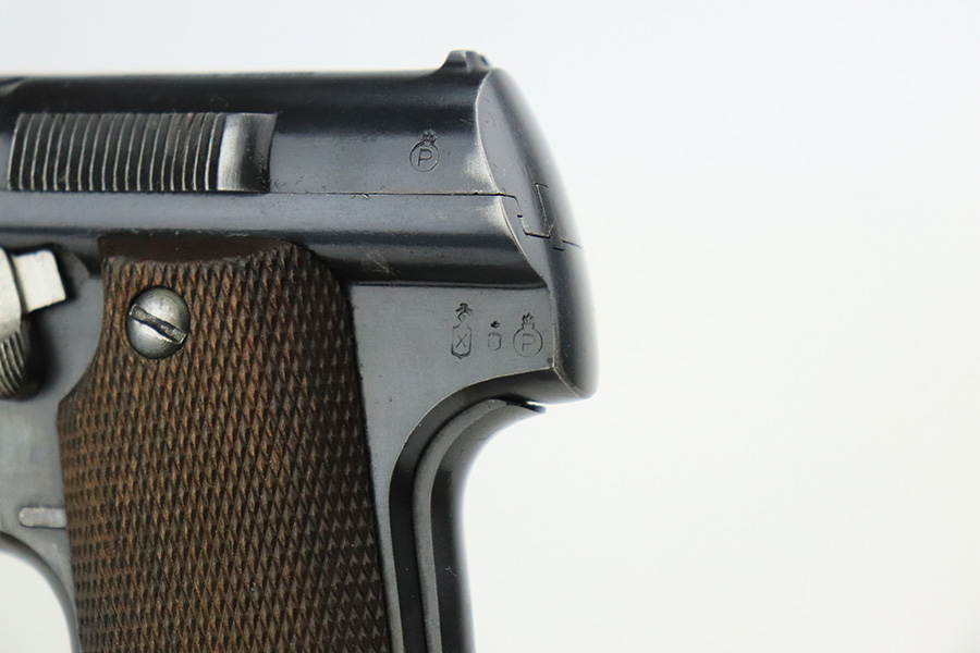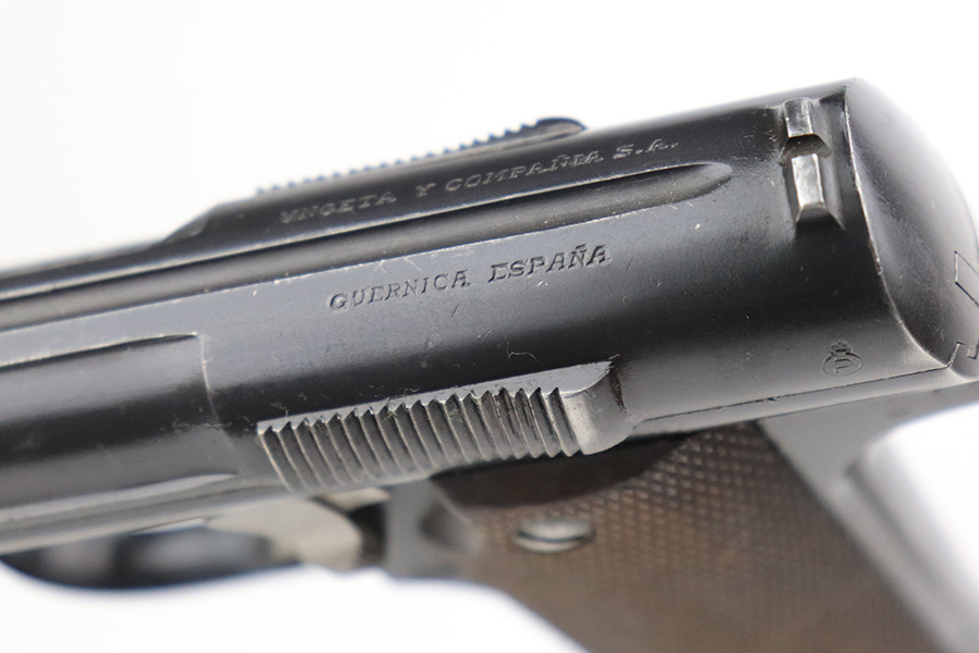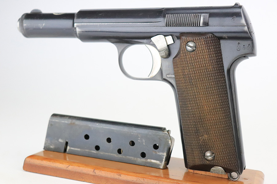 6/16/22 – This is an excellent example of a Spanish Astra Model 600/43. It is all matching and has the proper Spanish proofs. The “O” date code, indicates it was manufactured in 1944. It has retained about 96% of its original bluing. There is one spot of wear on the front strap and very minor wear around the muzzle and around the high edges in general. Minor scratchy wear along both sides of the slide. Comes with very nice wood grips (one bruise on the left side) and one period-correct magazine. Minty bore.