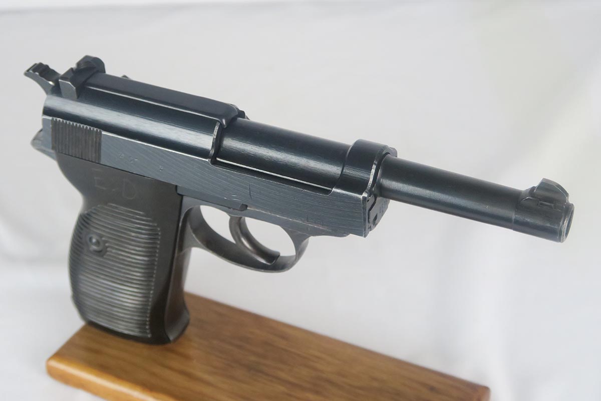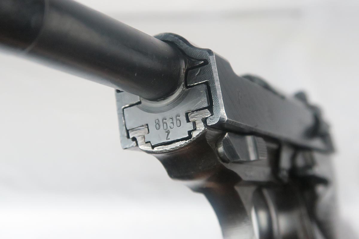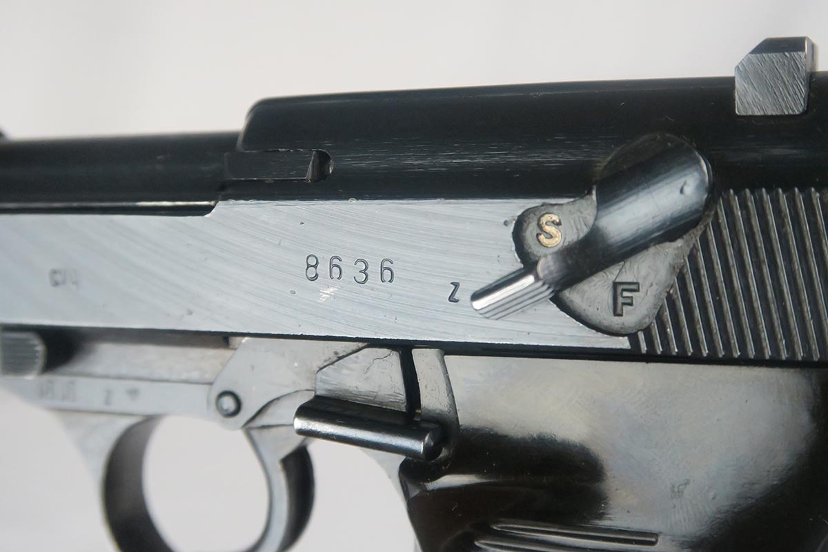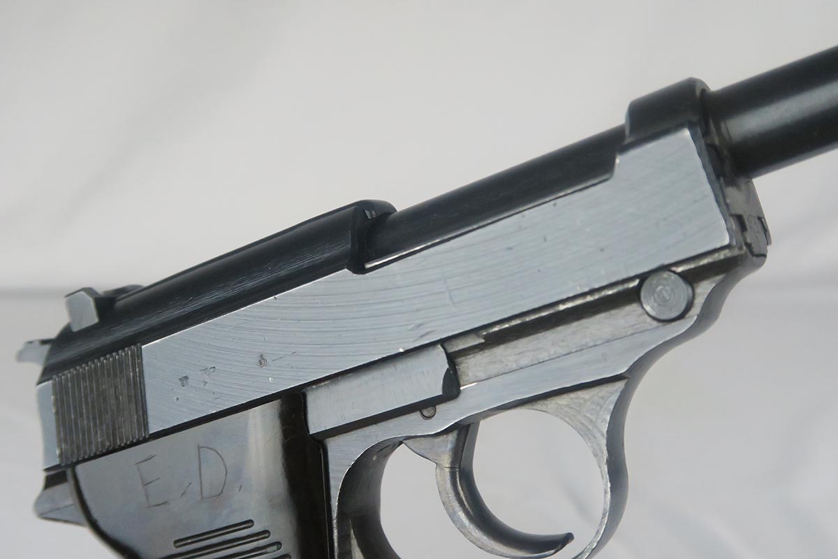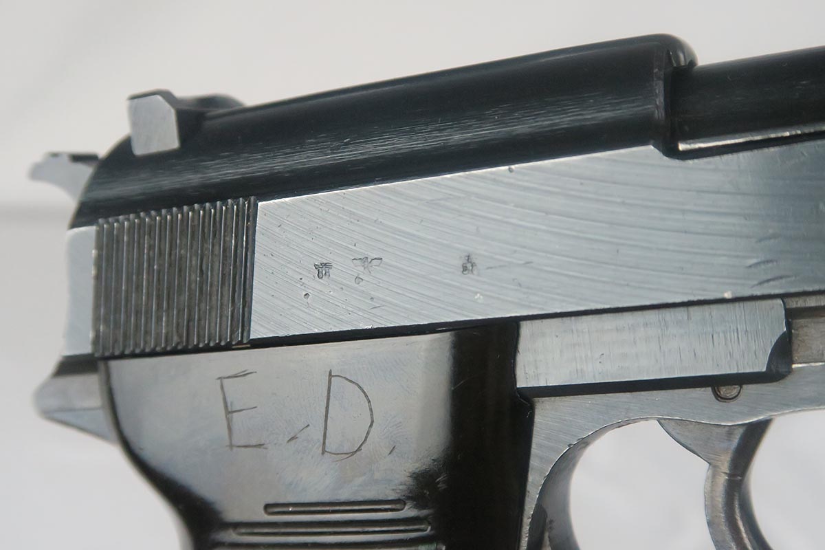 1/25/18 – This pistol was manufactured late in the war by Spreewerk, an arms factory located in Grottau, Czechoslovakia (occupied Sudetenland).  All serial numbered parts are properly matching (frame, slide, barrel, and locking block), and there are NO import marks. The finish is completely original, not refinished and not a “dipped” Russian capture. Overall condition is excellent with some thinning to the finish on the front grip strap. The metal surfaces do show numerous milling and tool marks, fairly typical of the later war Spreewerk pistols which were produced in large part by forced labor. The original black grips have interior markings and general construction which identify them as being made by the Julius Posselt firm, a company which supplied the majority of the grips to Spreewerk in the later part of the war. The grips are in excellent overall shape and free of chips or cracks. Almost certainly a WWII bring-back, the capturing G.I. lightly scratched his initials “E.D.” on the right grip panel. If the ED is a “deal killer” for you we can replace the grips, but this is the way it came to us. This pistol is in good mechanical condition with everything working as it should, including the safety/decocker. Minty bore.