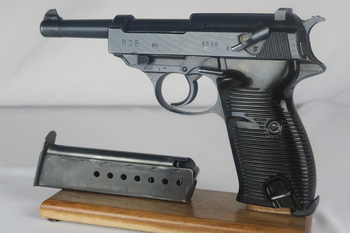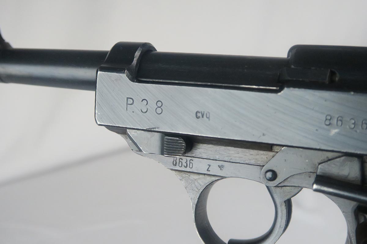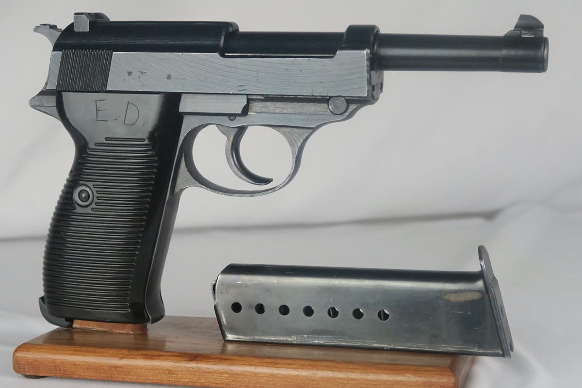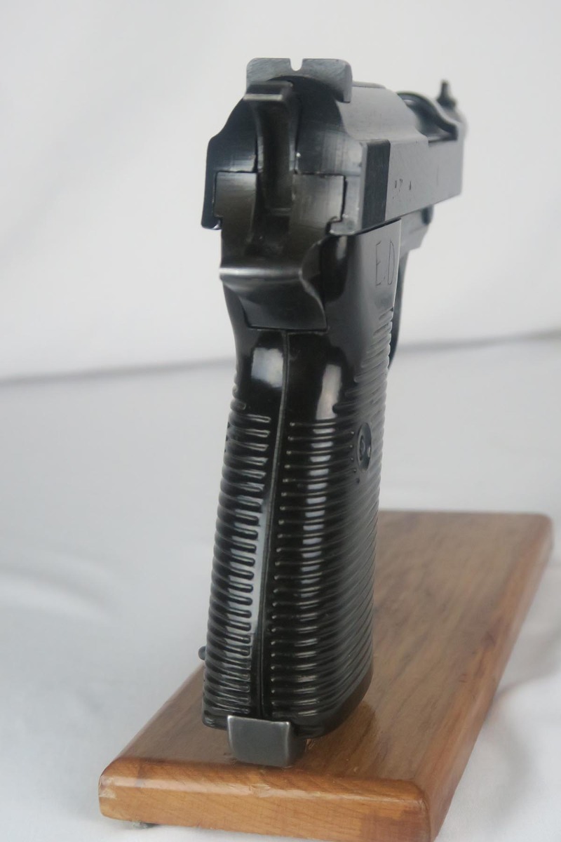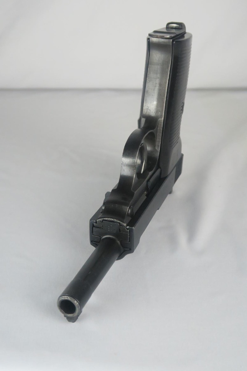 1/25/18 – This pistol was manufactured late in the war by Spreewerk, an arms factory located in Grottau, Czechoslovakia (occupied Sudetenland).  All serial numbered parts are properly matching (frame, slide, barrel, and locking block), and there are NO import marks. The finish is completely original, not refinished and not a “dipped” Russian capture. Overall condition is excellent with some thinning to the finish on the front grip strap. The metal surfaces do show numerous milling and tool marks, fairly typical of the later war Spreewerk pistols which were produced in large part by forced labor. The original black grips have interior markings and general construction which identify them as being made by the Julius Posselt firm, a company which supplied the majority of the grips to Spreewerk in the later part of the war. The grips are in excellent overall shape and free of chips or cracks. Almost certainly a WWII bring-back, the capturing G.I. lightly scratched his initials “E.D.” on the right grip panel. If the ED is a “deal killer” for you we can replace the grips, but this is the way it came to us. This pistol is in good mechanical condition with everything working as it should, including the safety/decocker. Minty bore.