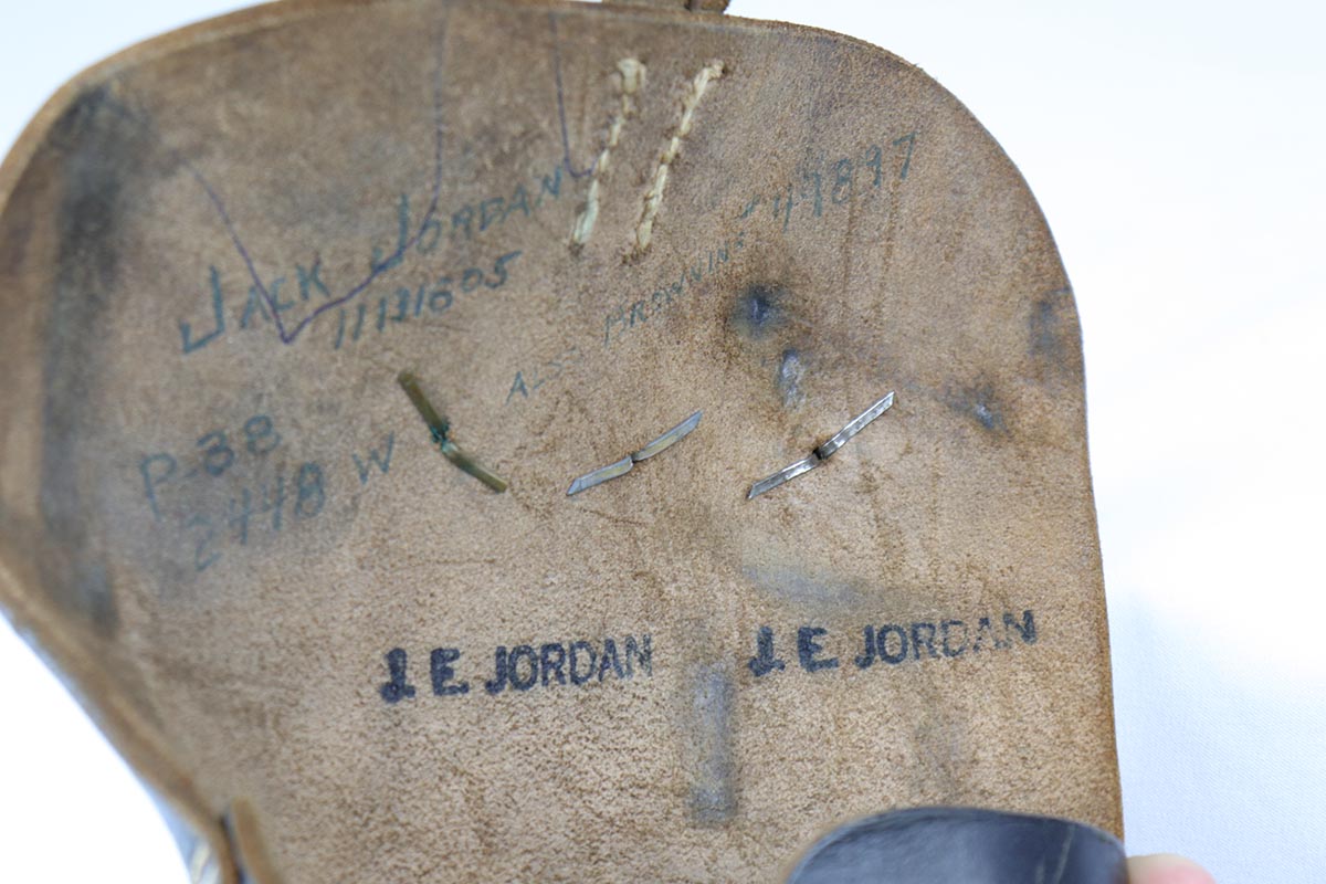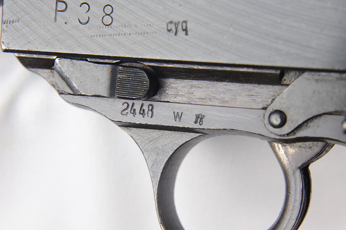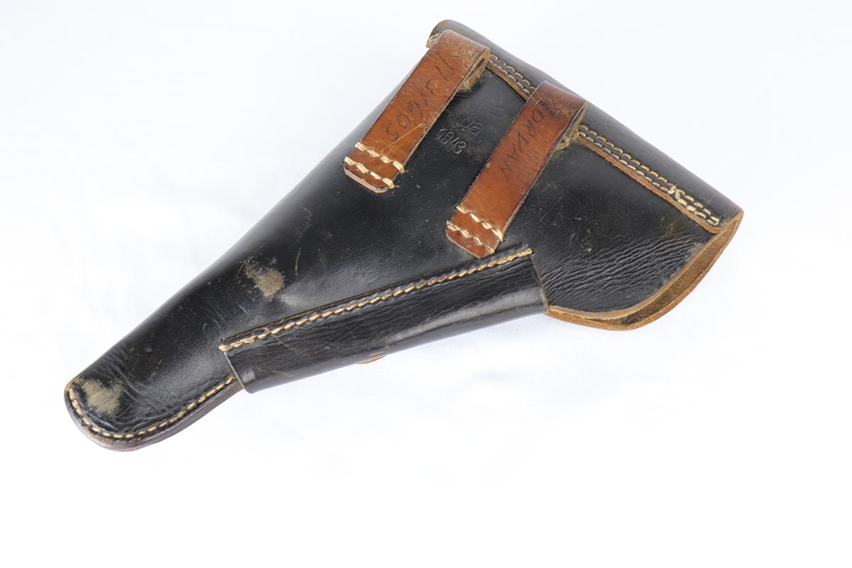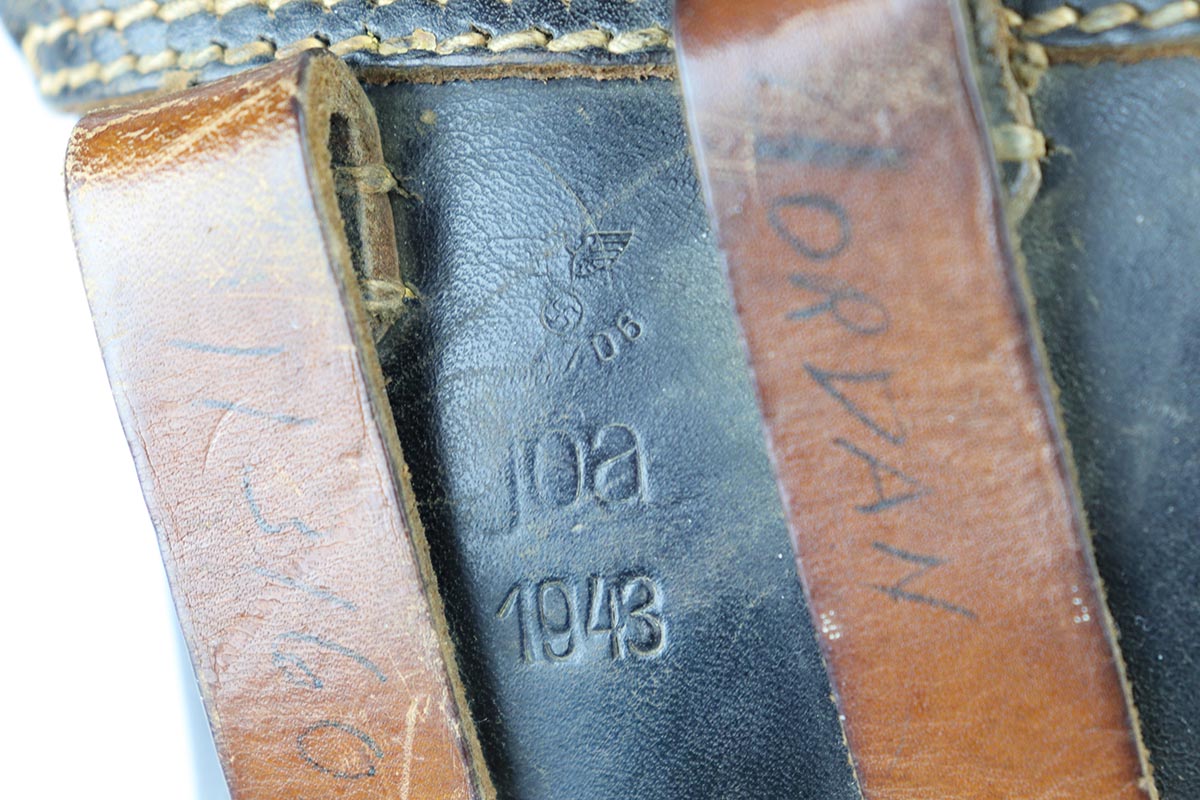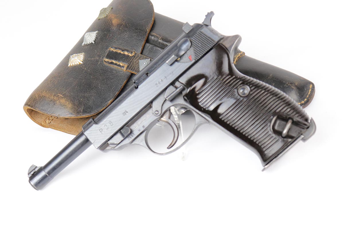 6/20/18 – This is an excellent and all matching Nazi issued Spreewerk P.38 with embellished 1943 made holster. The pistol shows only minor muzzle and edge wear, with dulling of the color to the front strap. This pistol was made in November of 1944 and has late-war features such as the cog hammer and rough machining lines on the slide. The pistol comes with a ‘joa’ holster that is dated and waffen marked, and features GI embellishments on the front flap. The interior has the name of the GI in it, Jack Jordan, and has the serial of the pistol written inside, making this a cool pairing with lots of joint history!