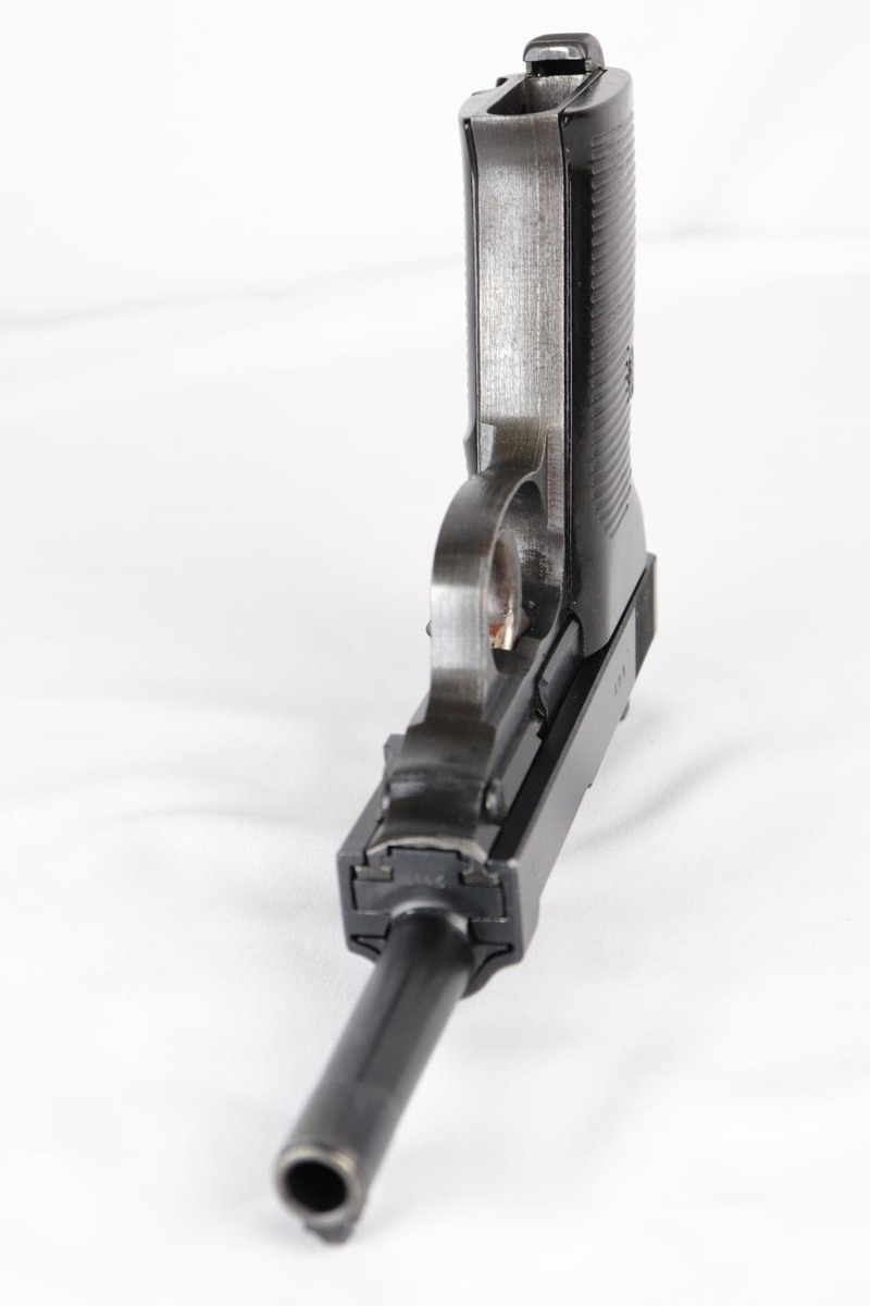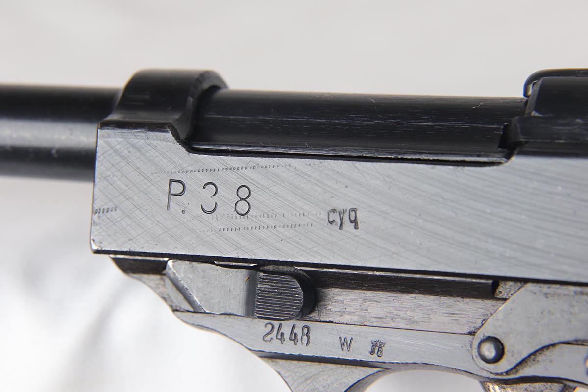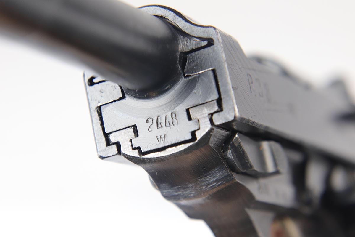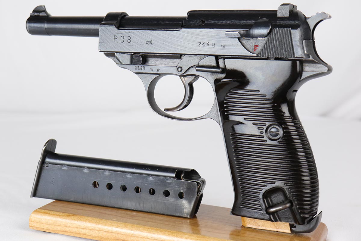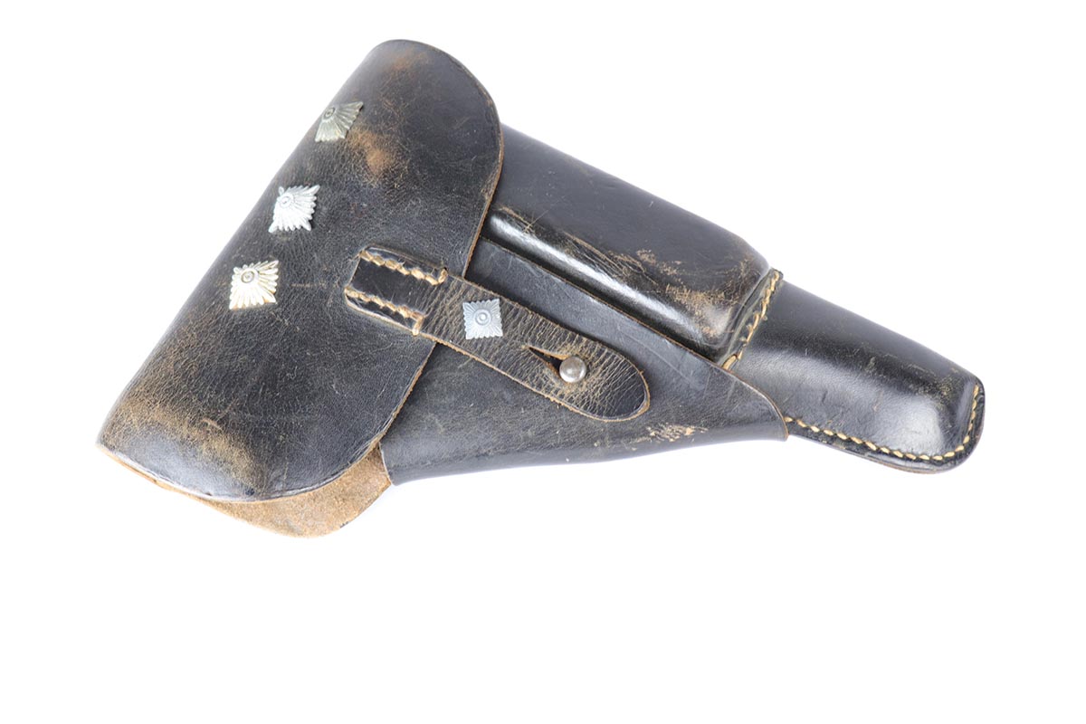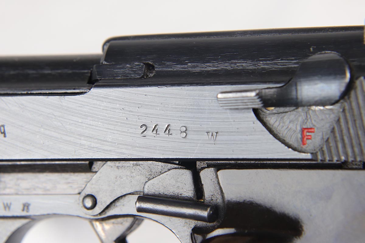 6/20/18 – This is an excellent and all matching Nazi issued Spreewerk P.38 with embellished 1943 made holster. The pistol shows only minor muzzle and edge wear, with dulling of the color to the front strap. This pistol was made in November of 1944 and has late-war features such as the cog hammer and rough machining lines on the slide. The pistol comes with a ‘joa’ holster that is dated and waffen marked, and features GI embellishments on the front flap. The interior has the name of the GI in it, Jack Jordan, and has the serial of the pistol written inside, making this a cool pairing with lots of joint history!