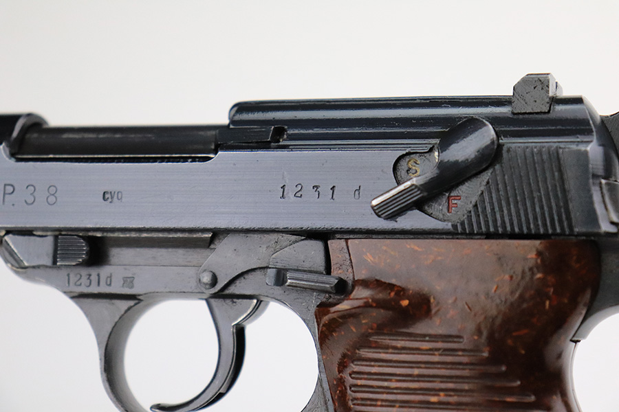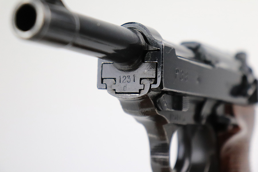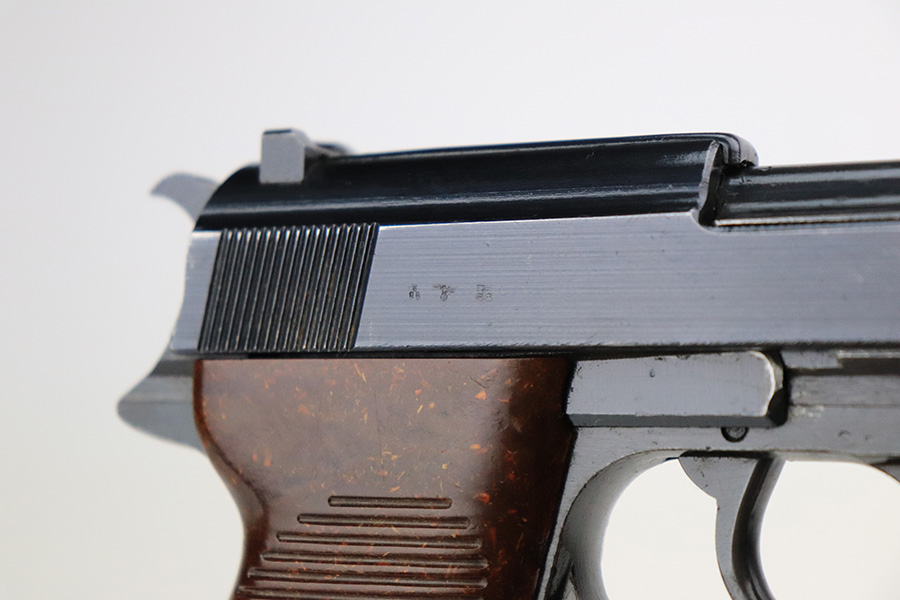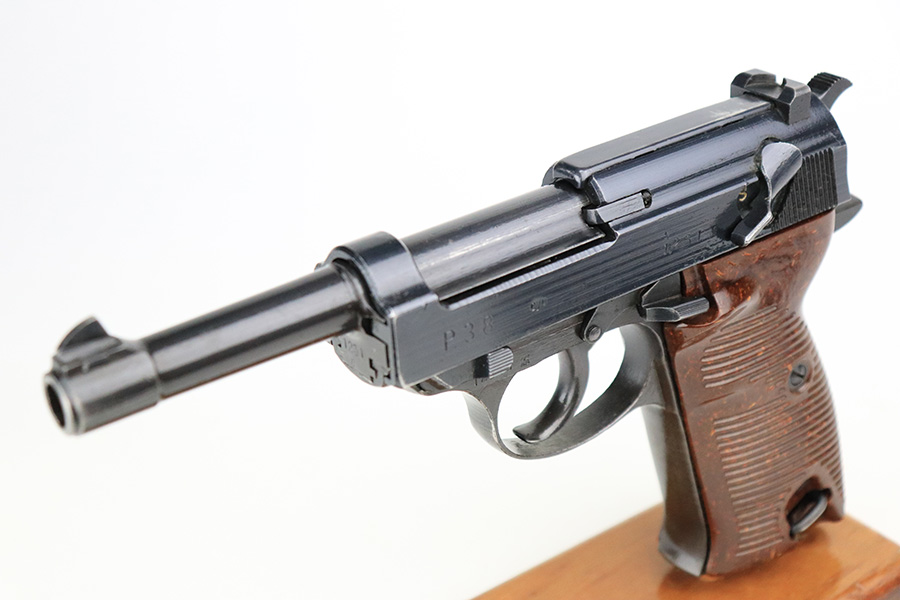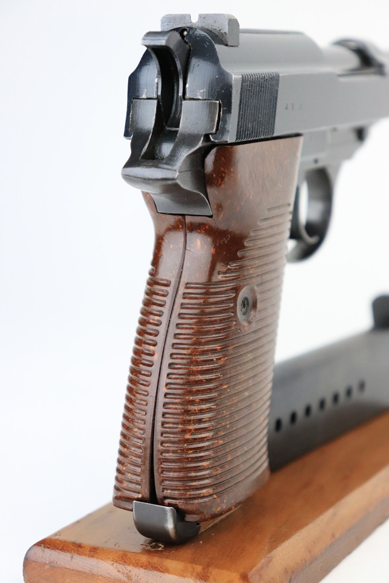 7/5/22 – This is an excellent example of a Spreewerk P.38 issued to the Nazi military in June of 1943. It is all matching and has the proper “Eagle 88” military acceptance proofs throughout. There is very minor thinning and light brown patina on the front strap and areas of very minor wear around the muzzle, on the front edges of the slide, and on the top plate. Comes with minty reddish baklite grips and one proper “Eagle 88” marked magazine. The bore has strong rifling, but there is light freckling throughout. De-cocker is functional.