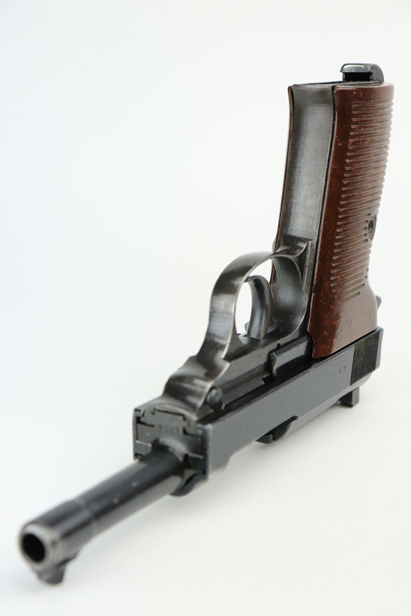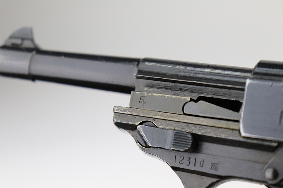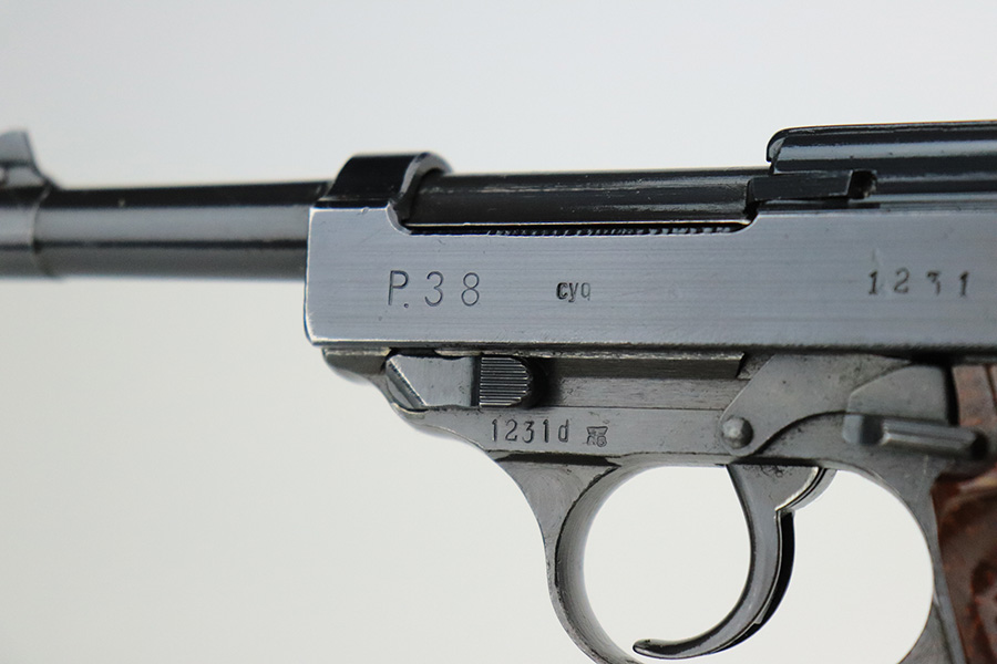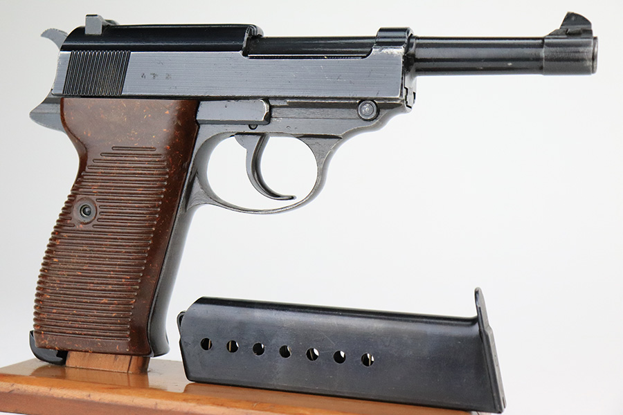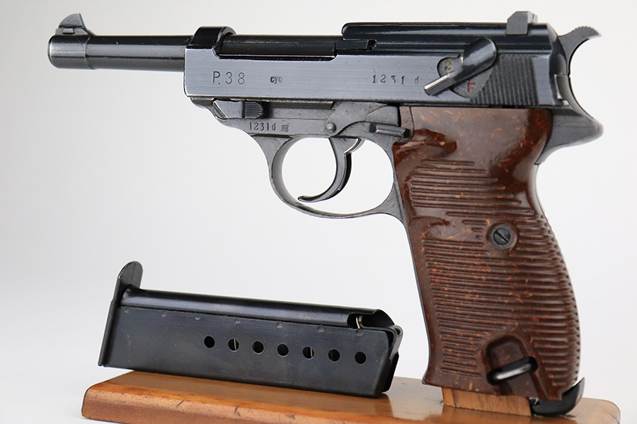 7/5/22 – This is an excellent example of a Spreewerk P.38 issued to the Nazi military in June of 1943. It is all matching and has the proper “Eagle 88” military acceptance proofs throughout. There is very minor thinning and light brown patina on the front strap and areas of very minor wear around the muzzle, on the front edges of the slide, and on the top plate. Comes with minty reddish baklite grips and one proper “Eagle 88” marked magazine. The bore has strong rifling, but there is light freckling throughout. De-cocker is functional.