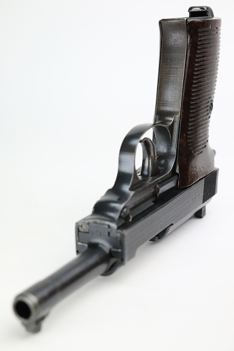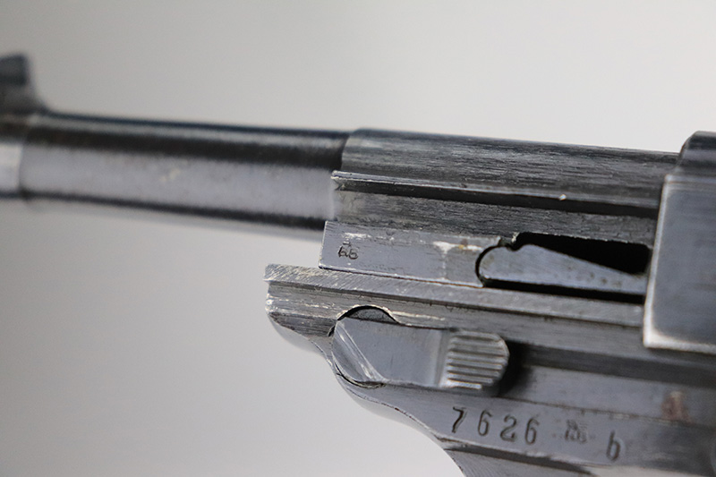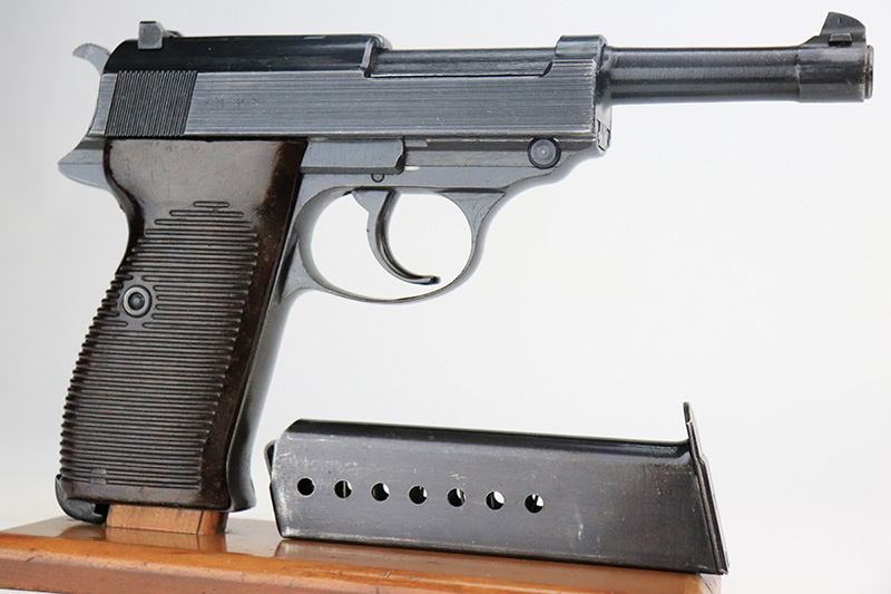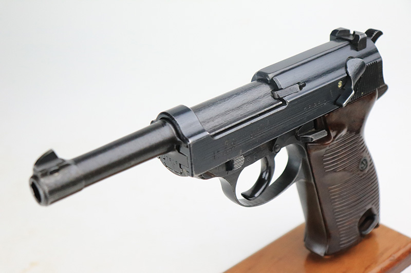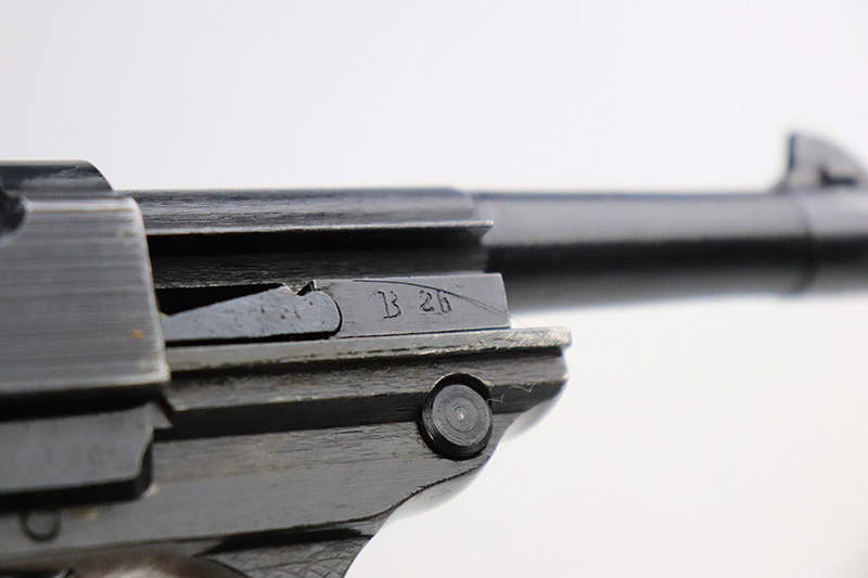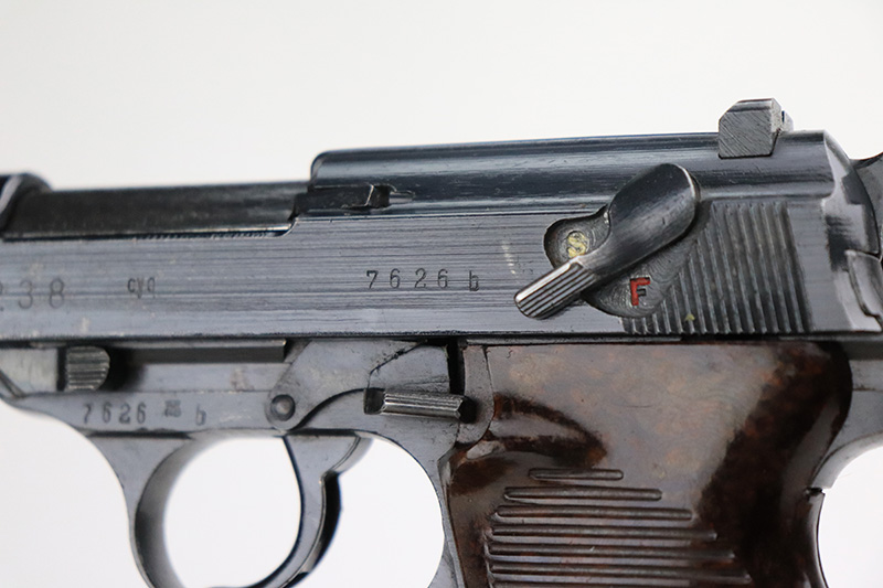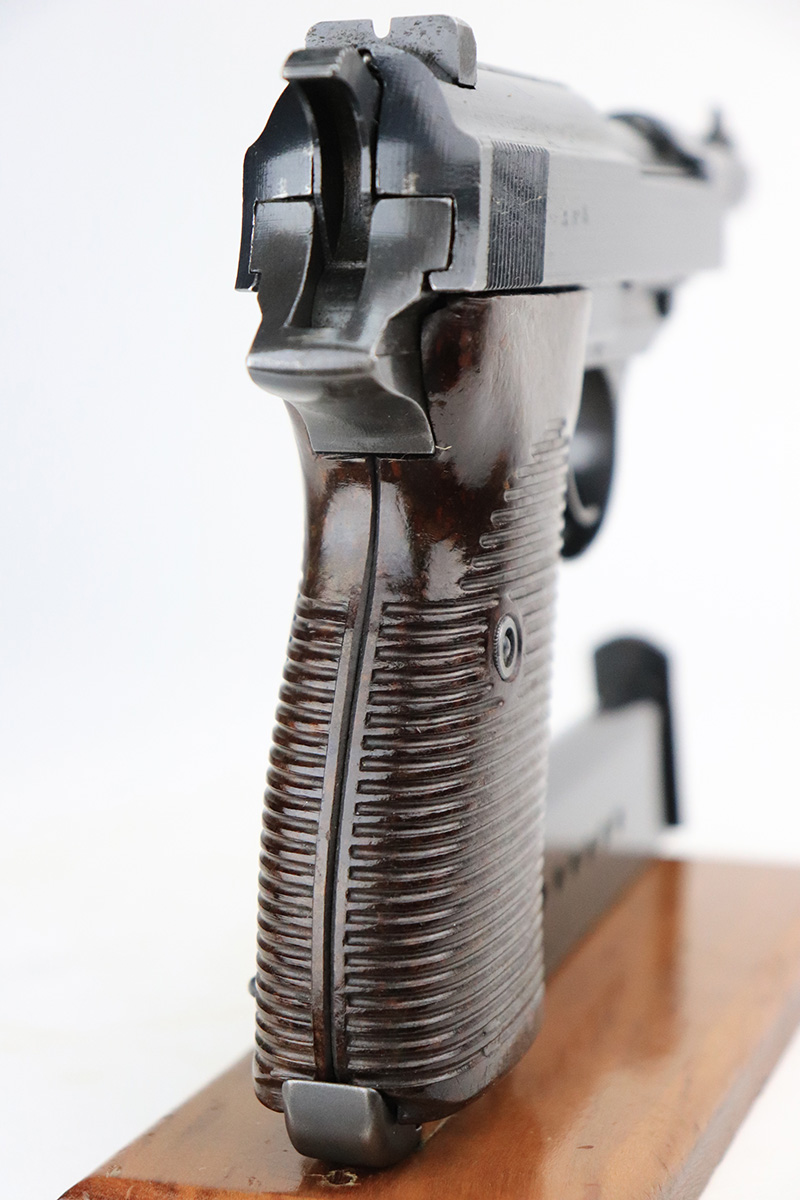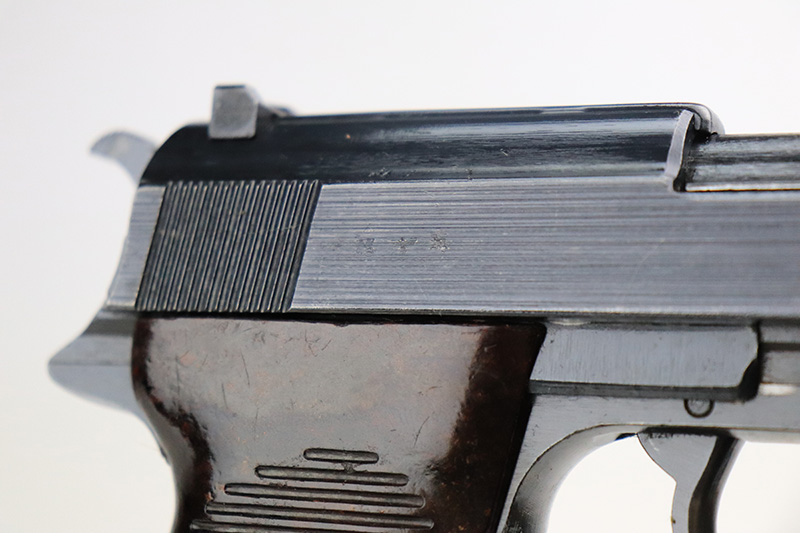 8/19/22 – This is an excellent example of a Spreewerk P.38 issued to the Nazi military in April of 1943. The gun is all matching and has the proper “Eagle 88” military acceptance proofs throughout. It has retained about 96% of its original finish. Some thinning and light brown patina on the front strap. There are tiny dots of discoloration along the right side of the slide and barrel. A few very light surface scratches on the right side of the slide. Comes with excellent period-correct bakelite grips and a jvd magazine. Minty bore. De-cocker is functional.